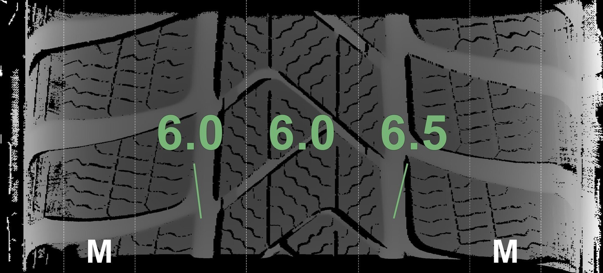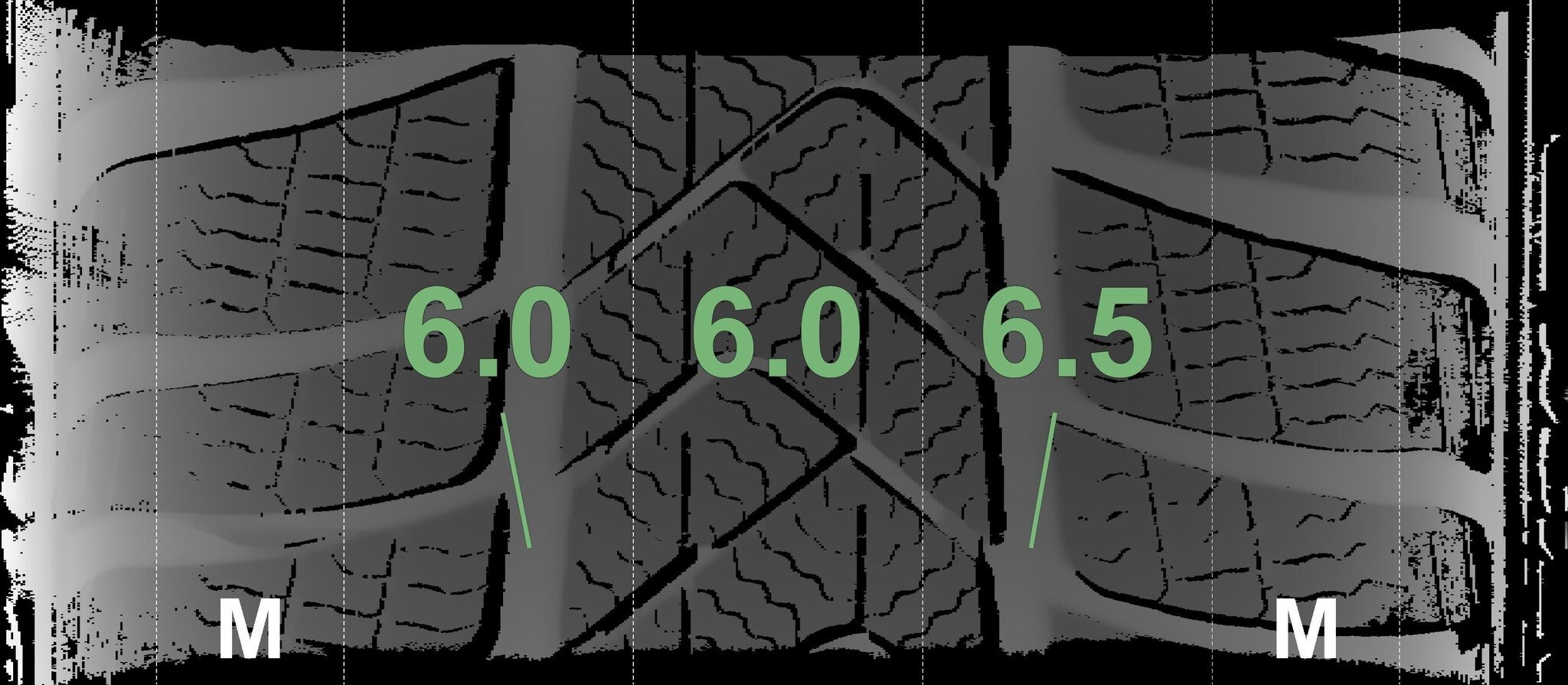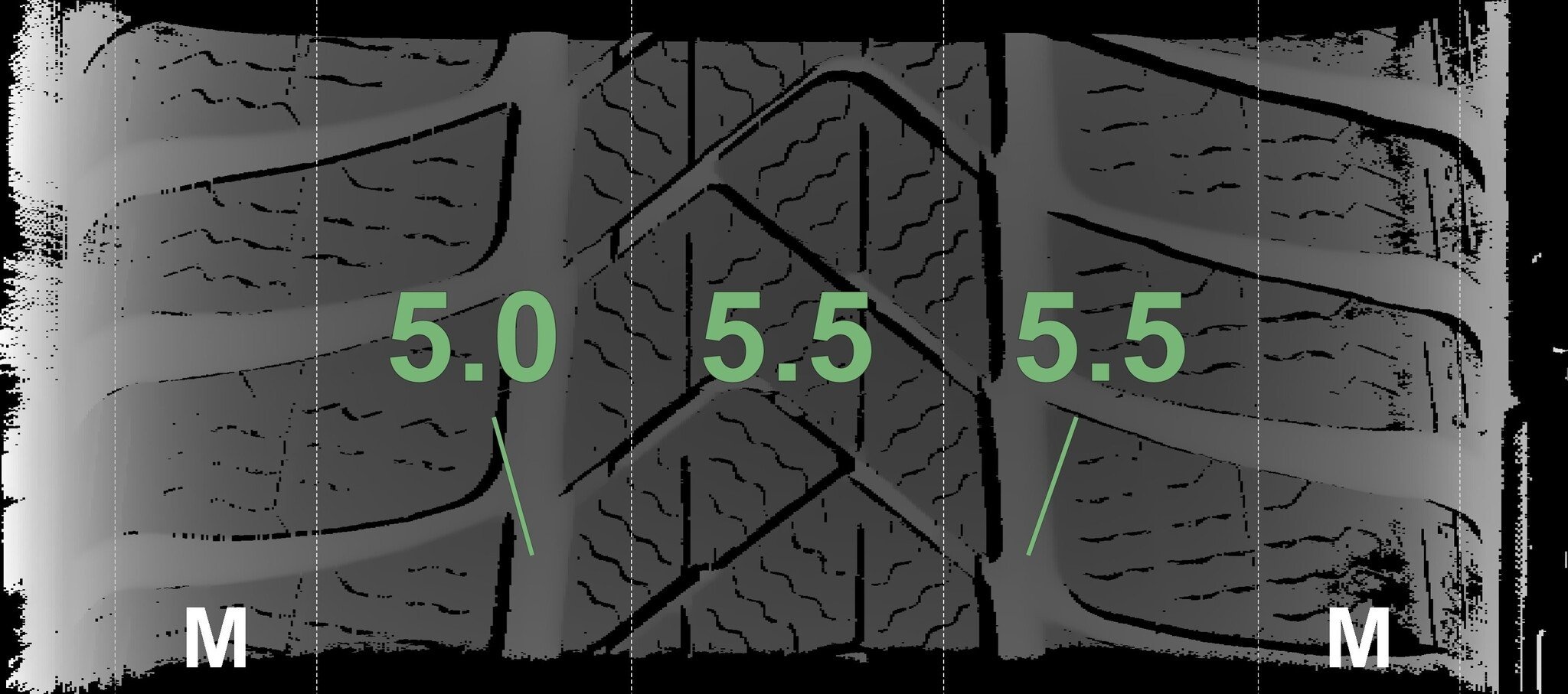 De gemeten profieldieptes en de details van de velgen zijn hierboven weergegeven.
