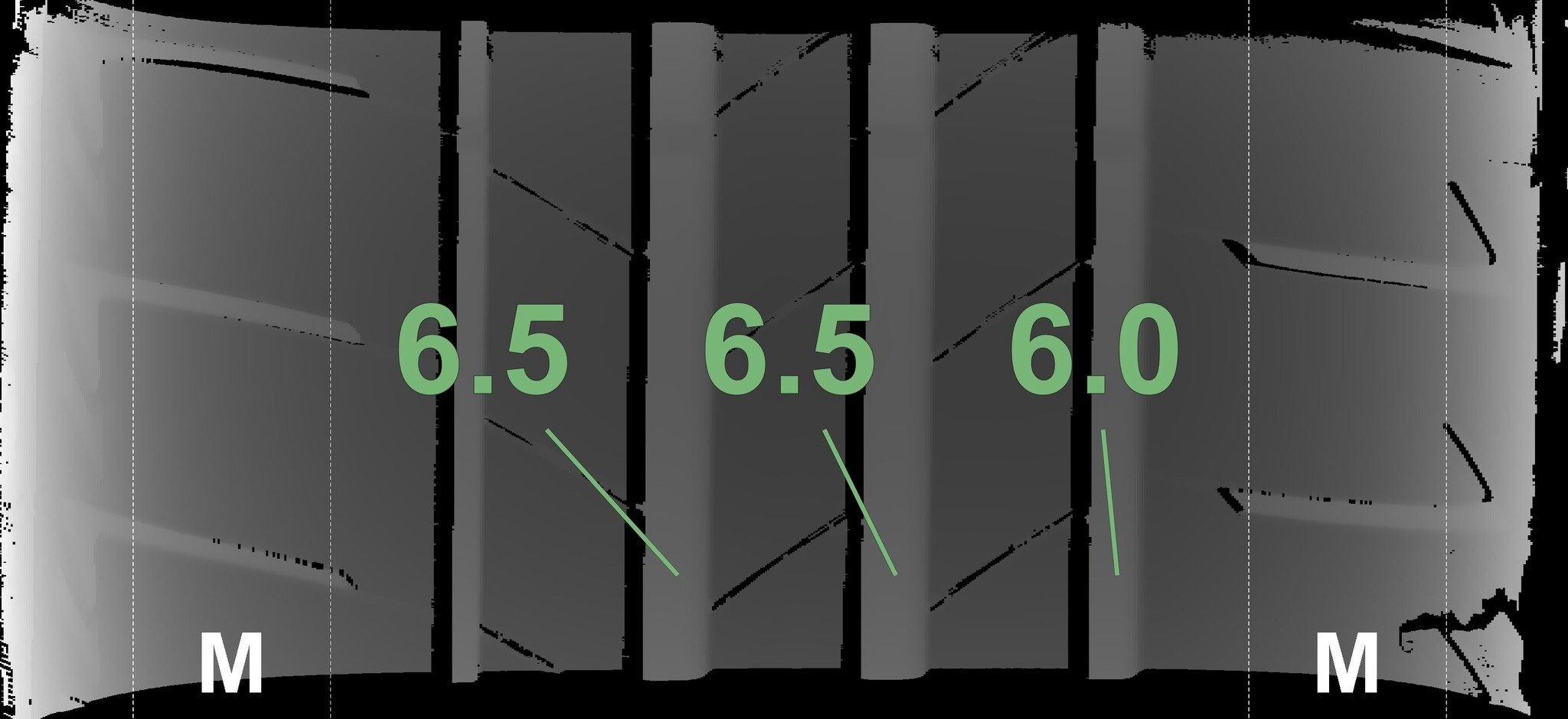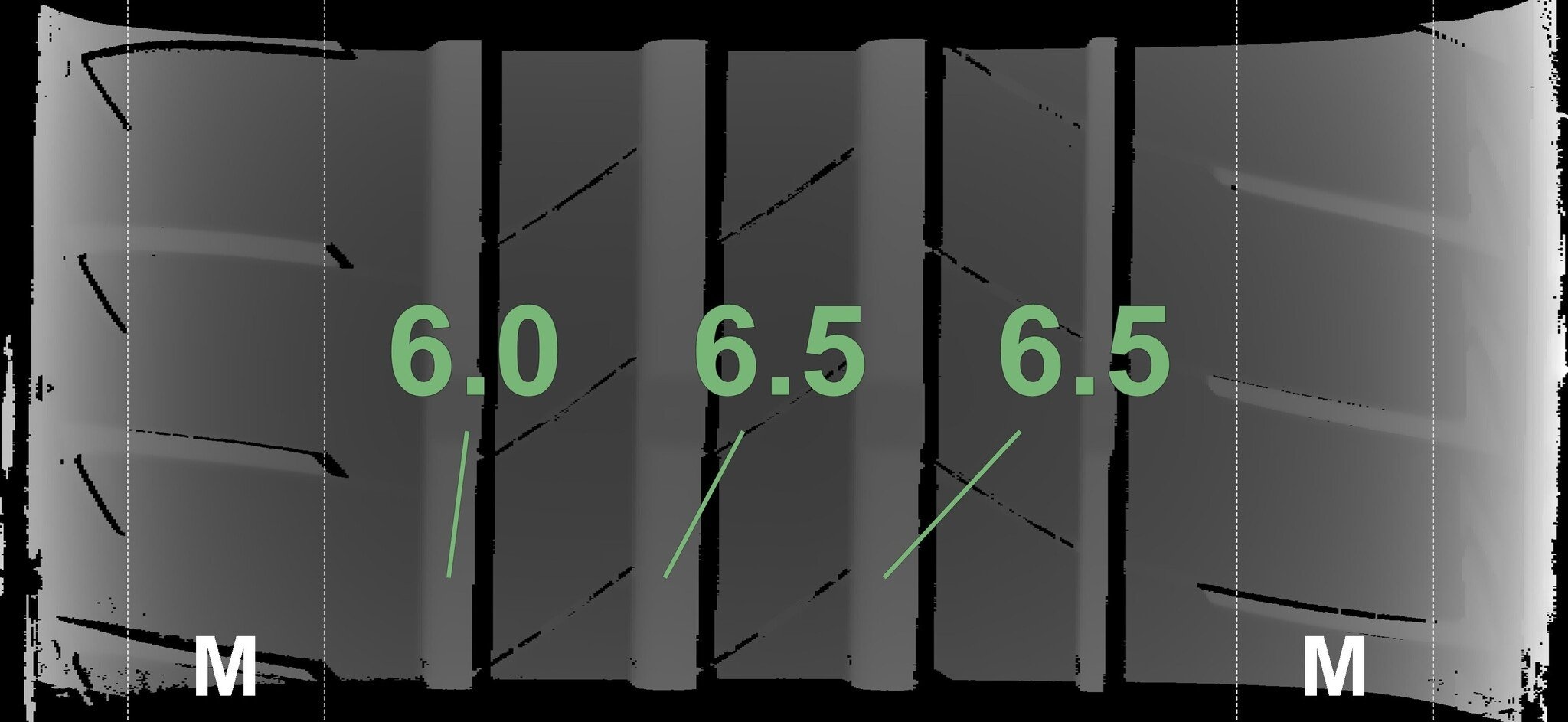 De gemeten profieldieptes en de details van de velgen zijn hierboven weergegeven.
