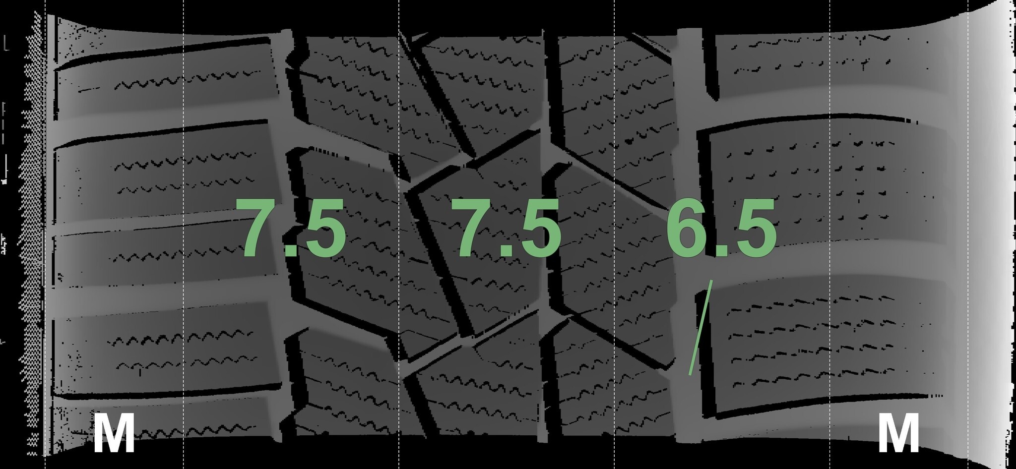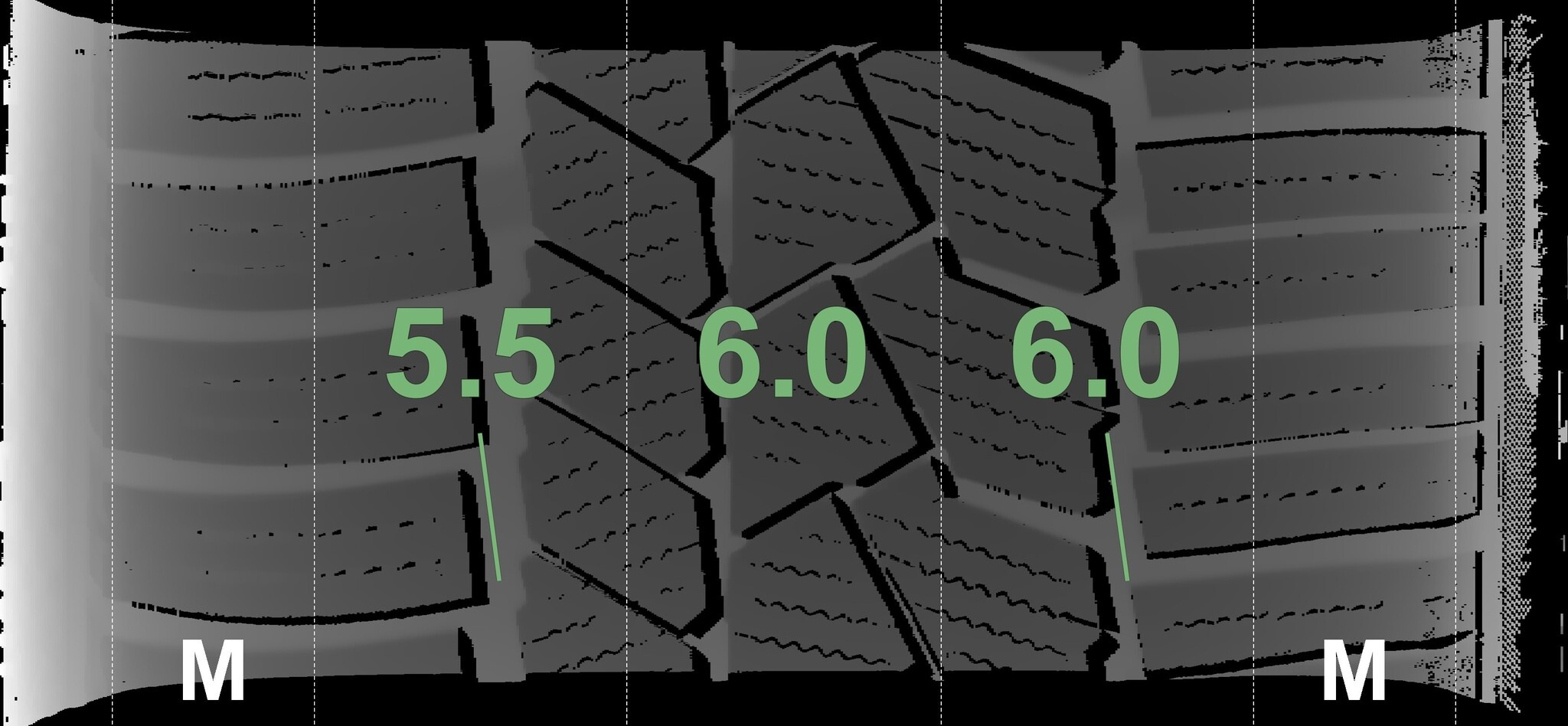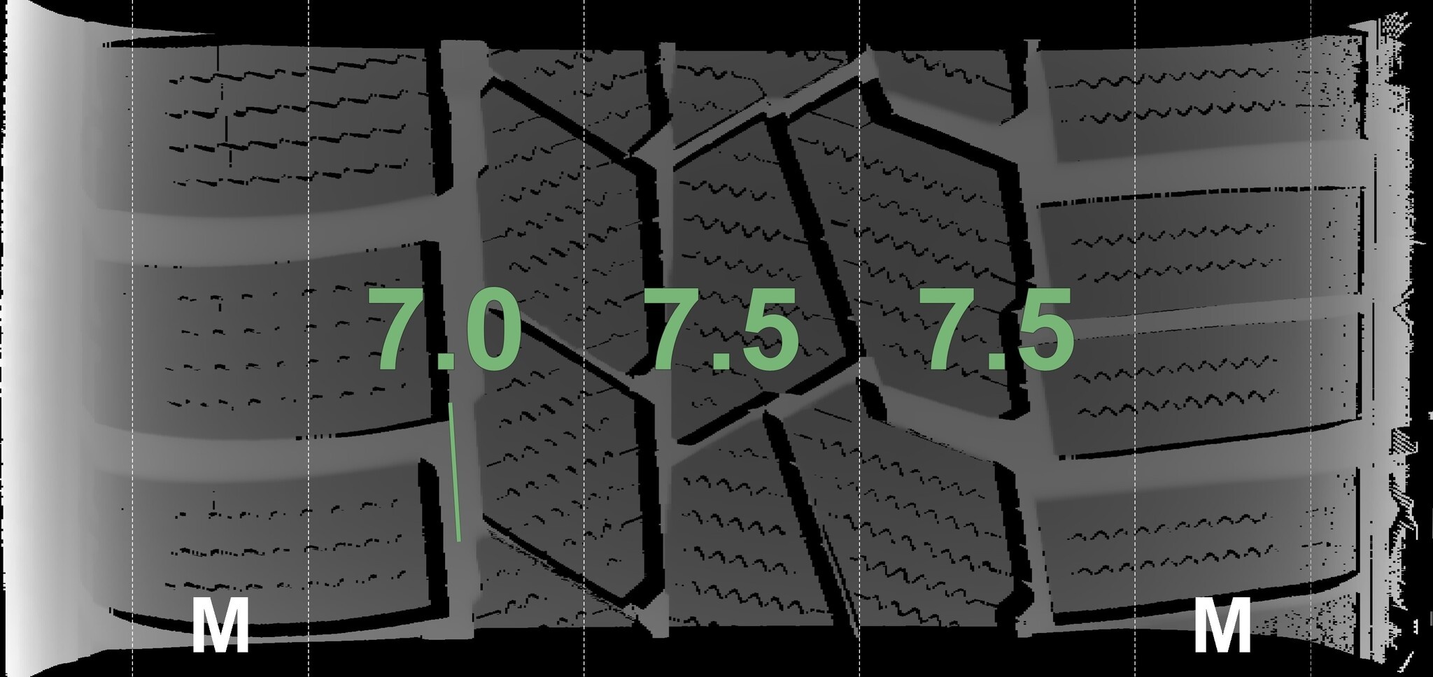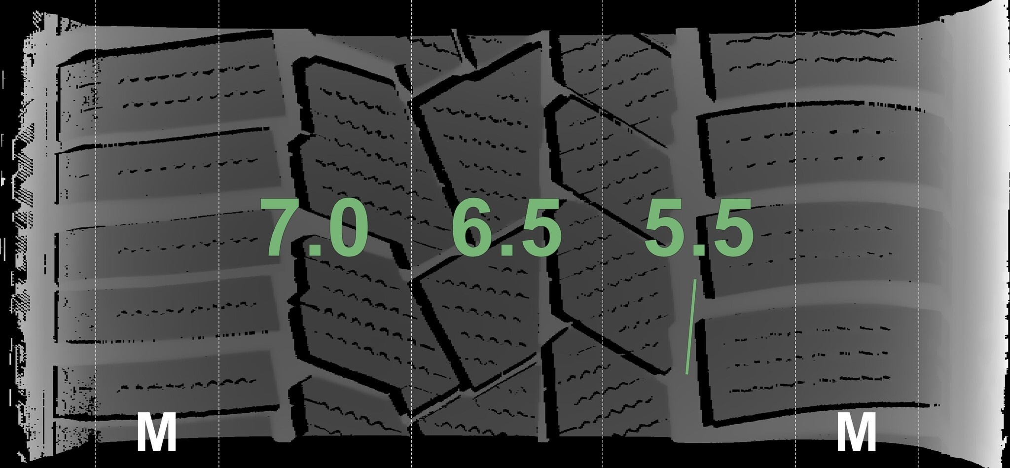 De gemeten profieldieptes en de details van de velgen zijn hierboven weergegeven.