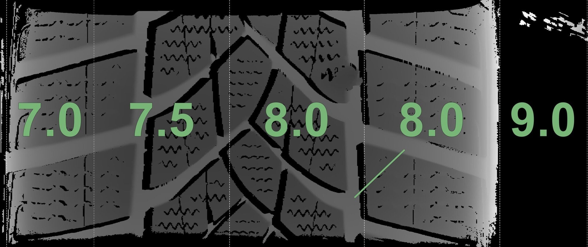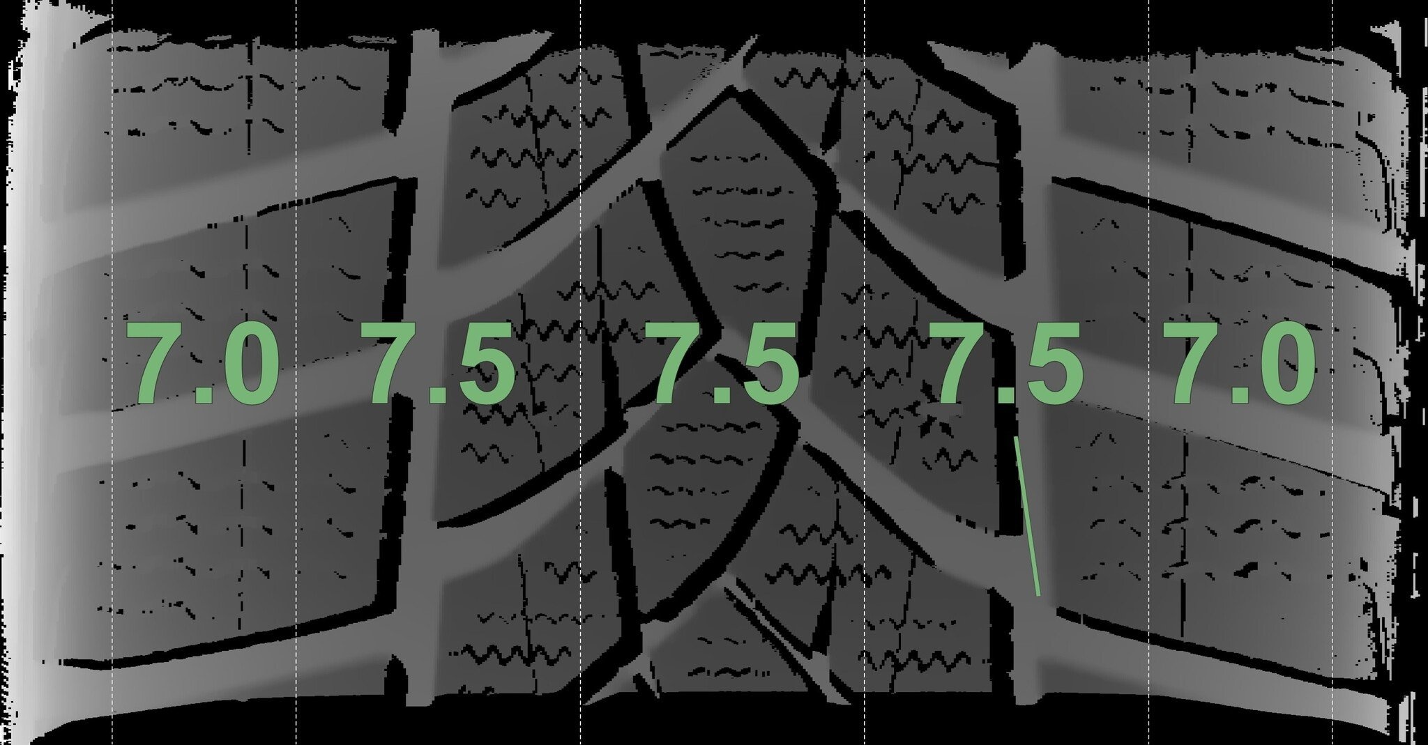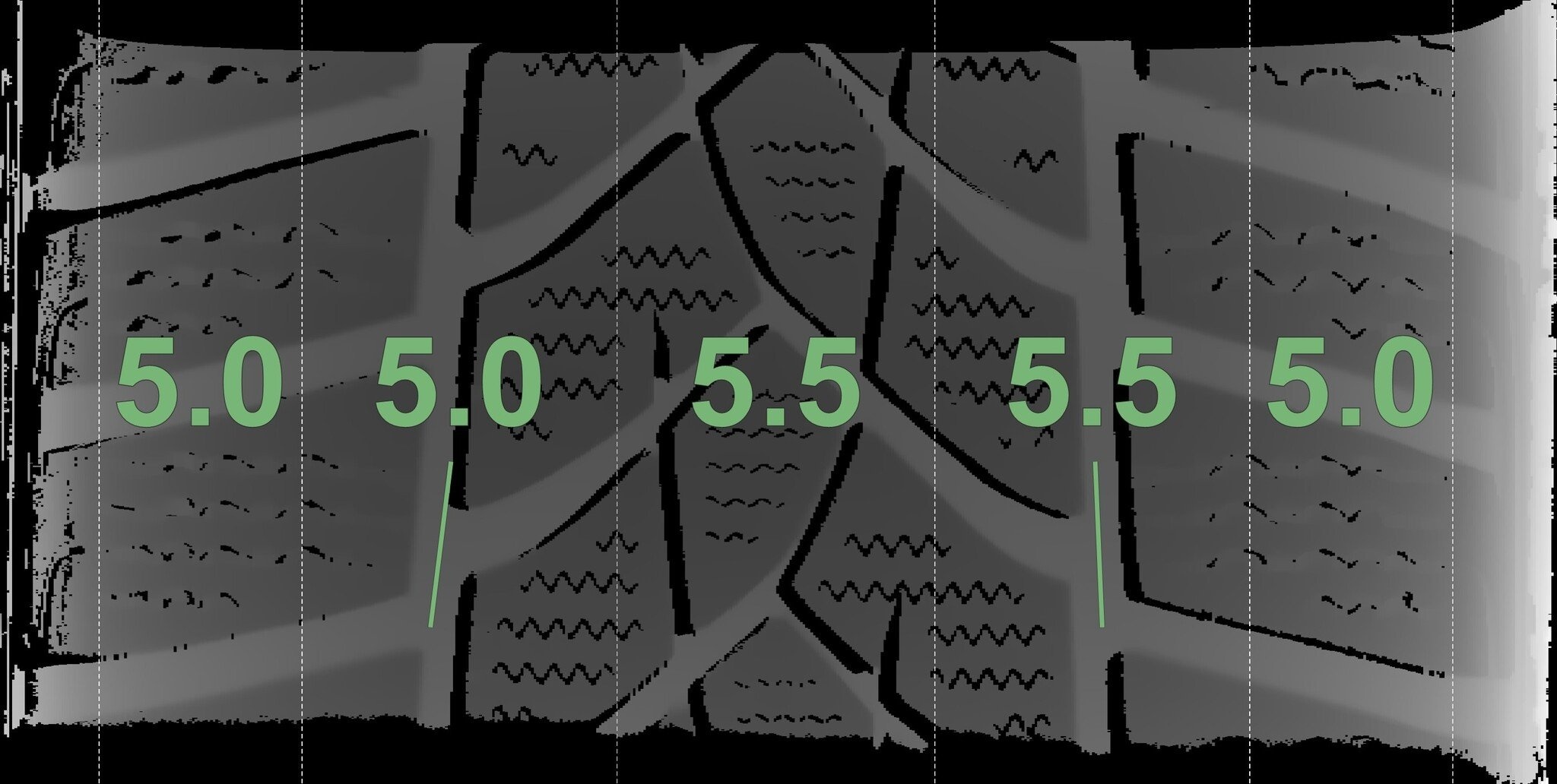 De gemeten profieldieptes en de details van de velgen zijn hierboven weergegeven.