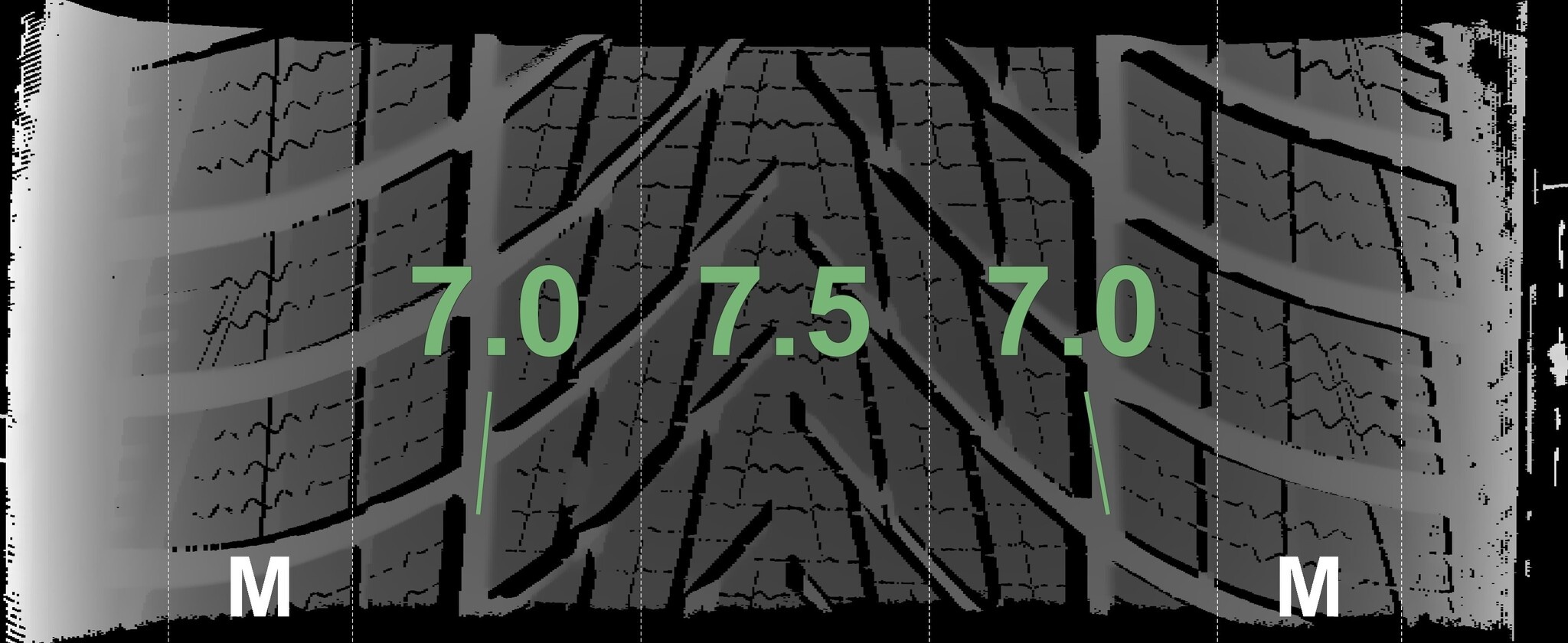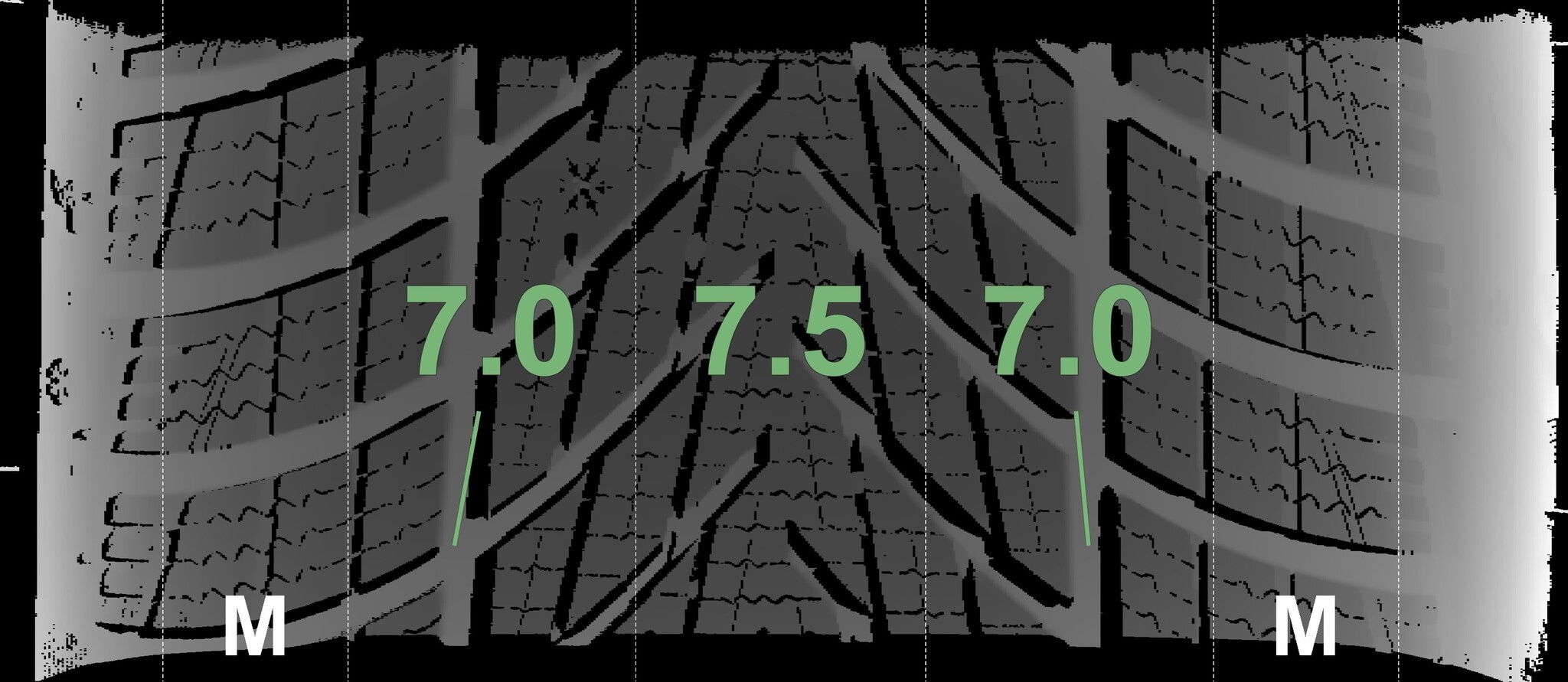 De gemeten profieldieptes en de details van de velgen zijn hierboven weergegeven.