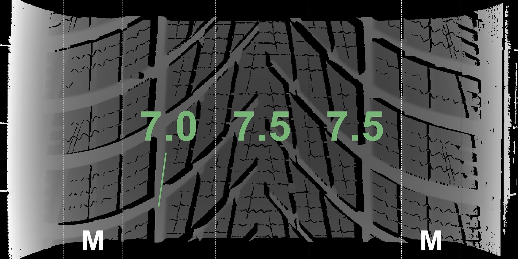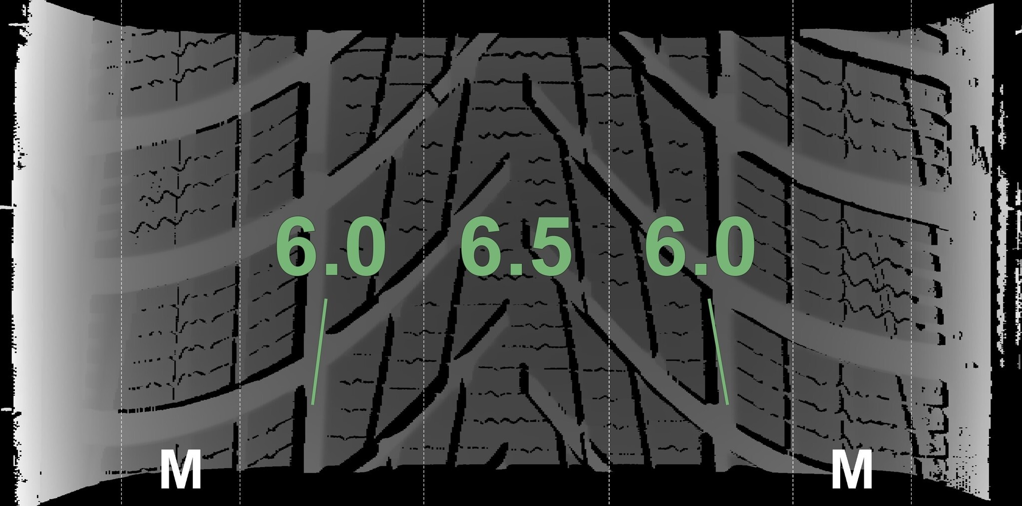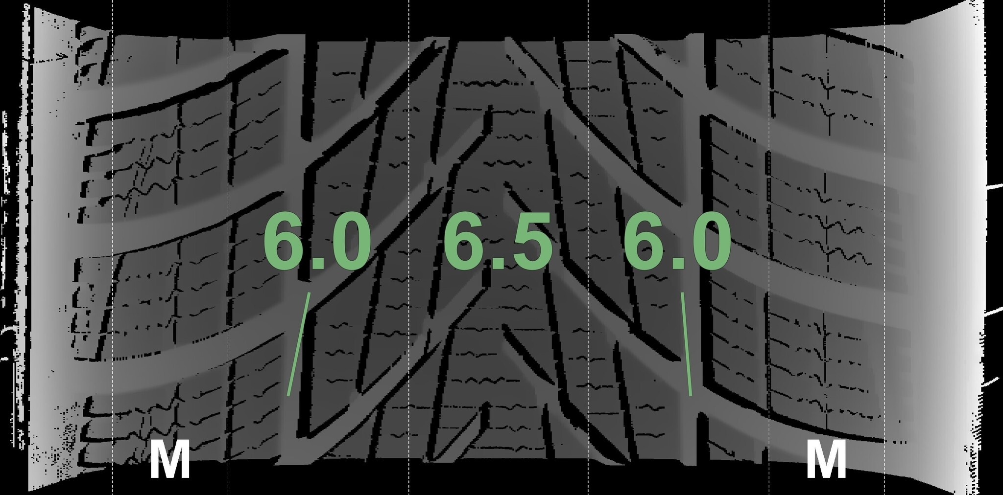 De gemeten profieldieptes en de details van de velgen zijn hierboven weergegeven.