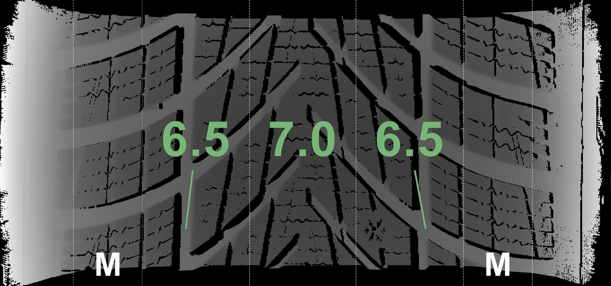 De gemeten profieldieptes en de details van de velgen zijn hierboven weergegeven.