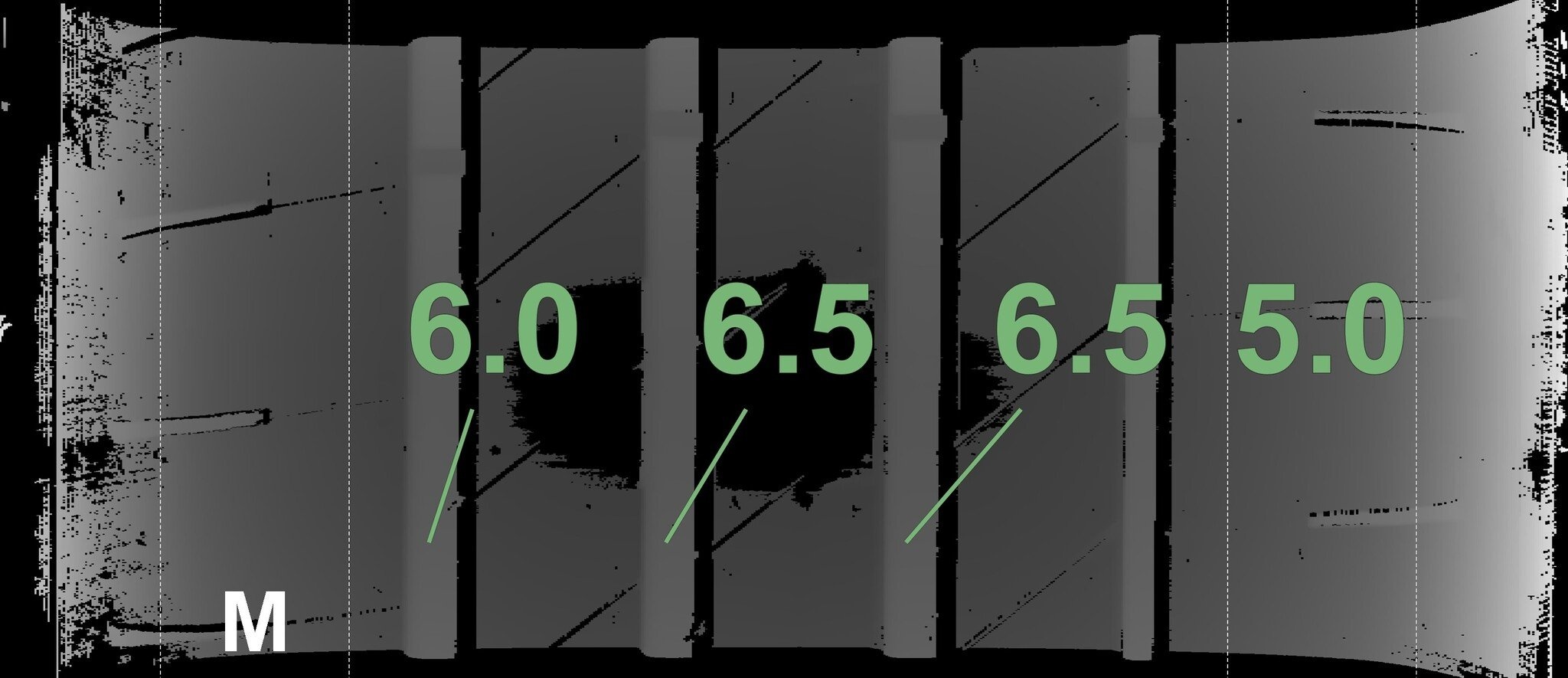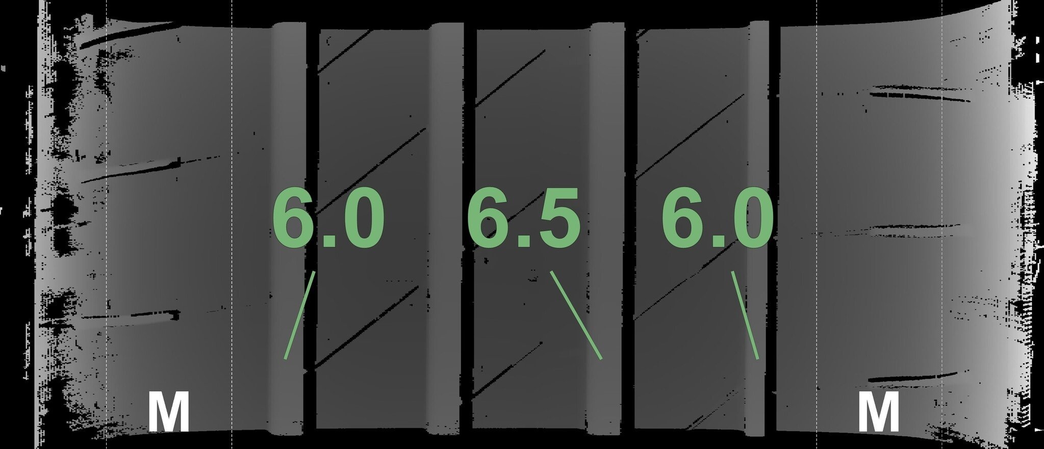 De gemeten profieldieptes en de details van de velgen zijn hierboven weergegeven.