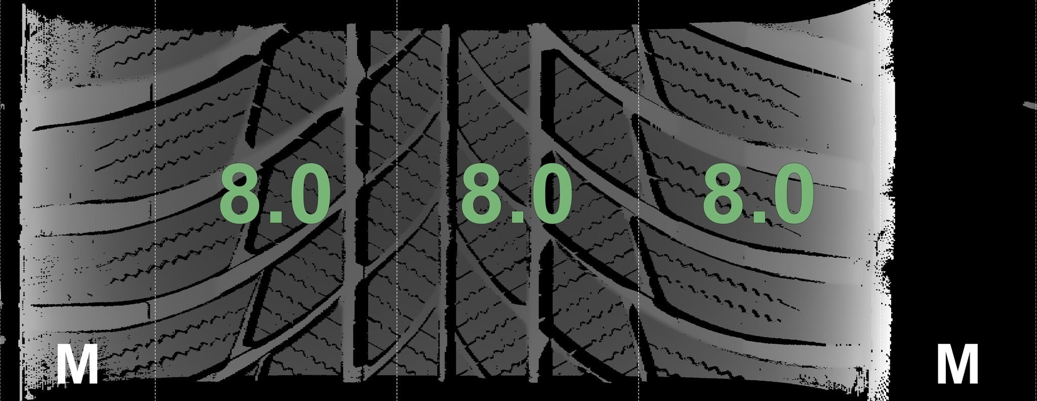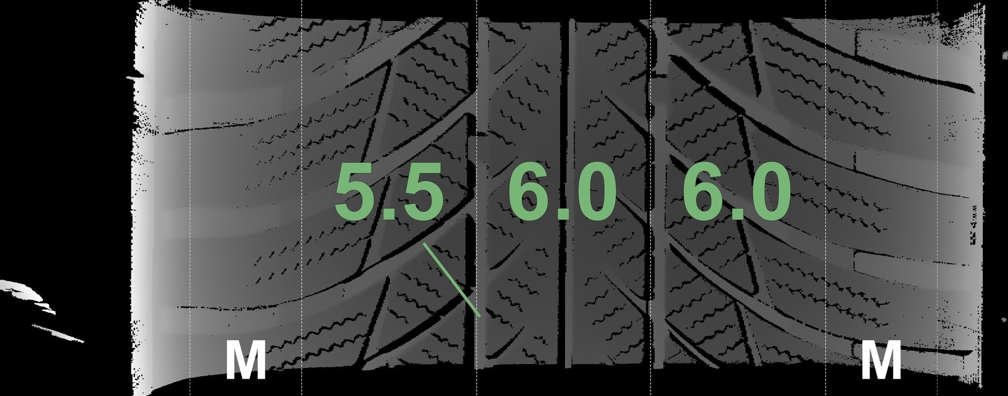 De gemeten profieldieptes en de details van de velgen zijn hierboven weergegeven.