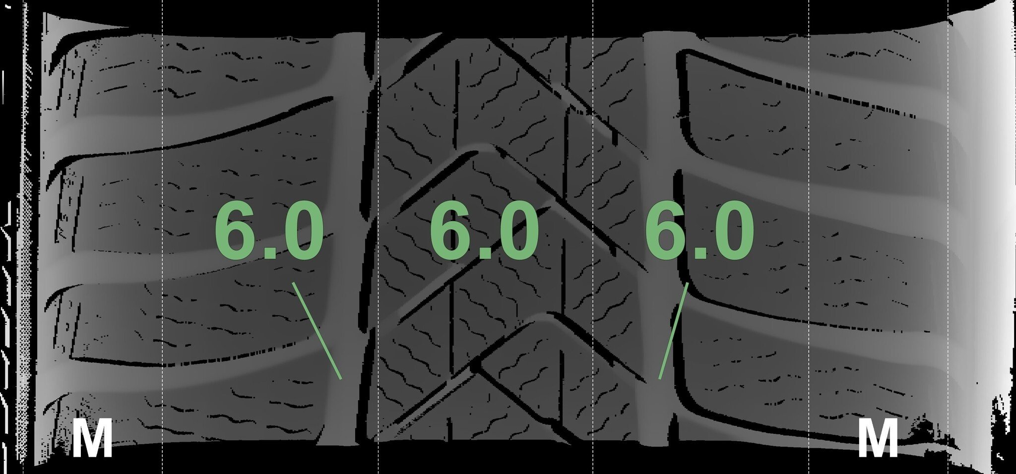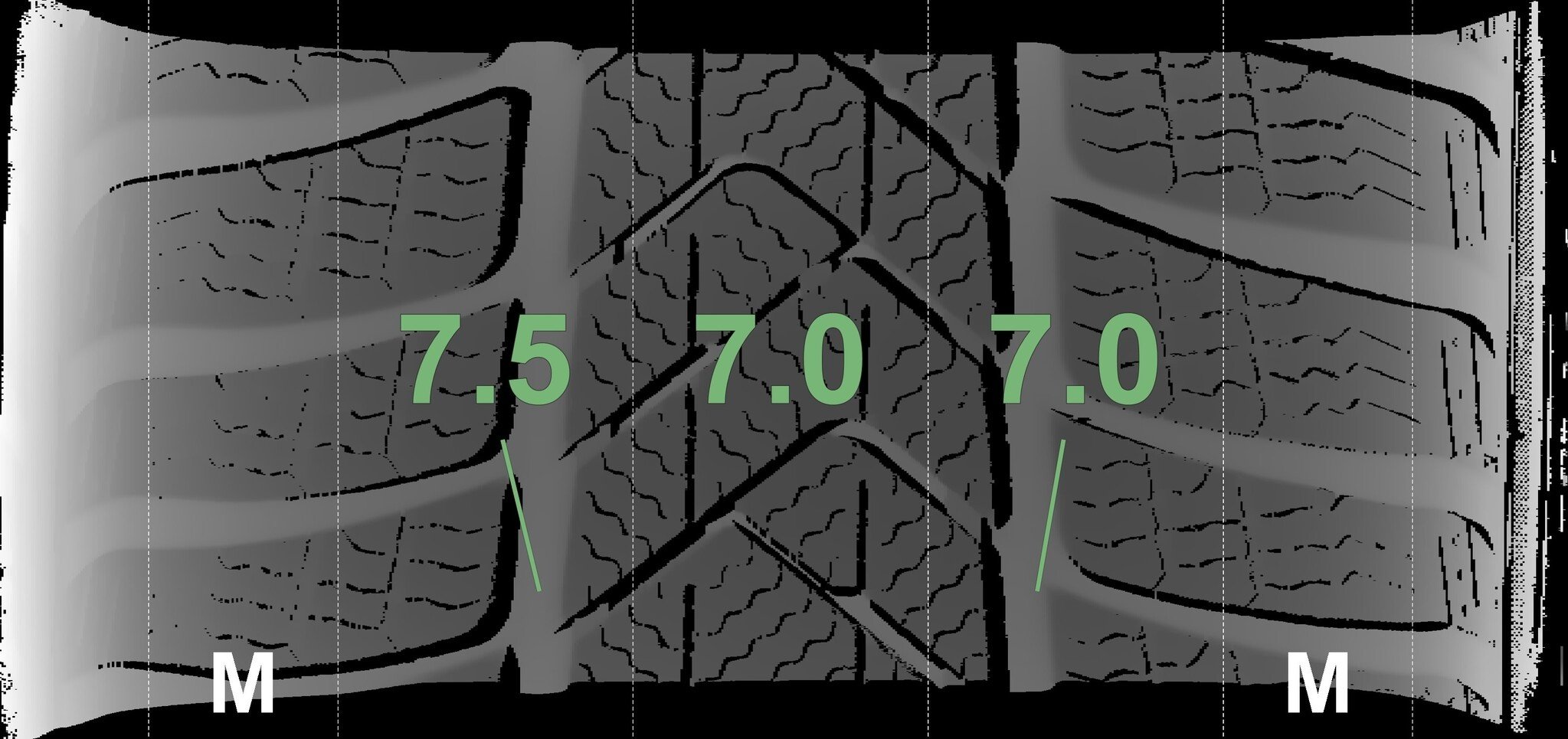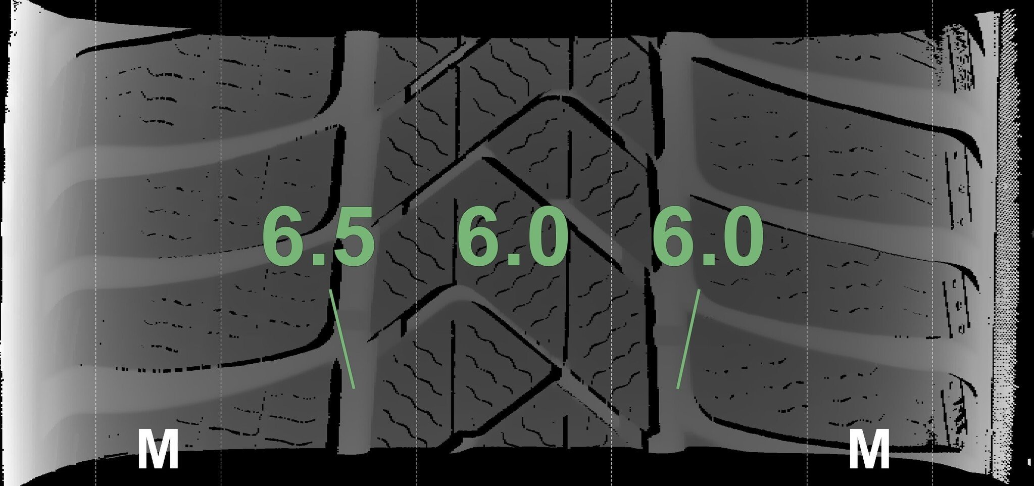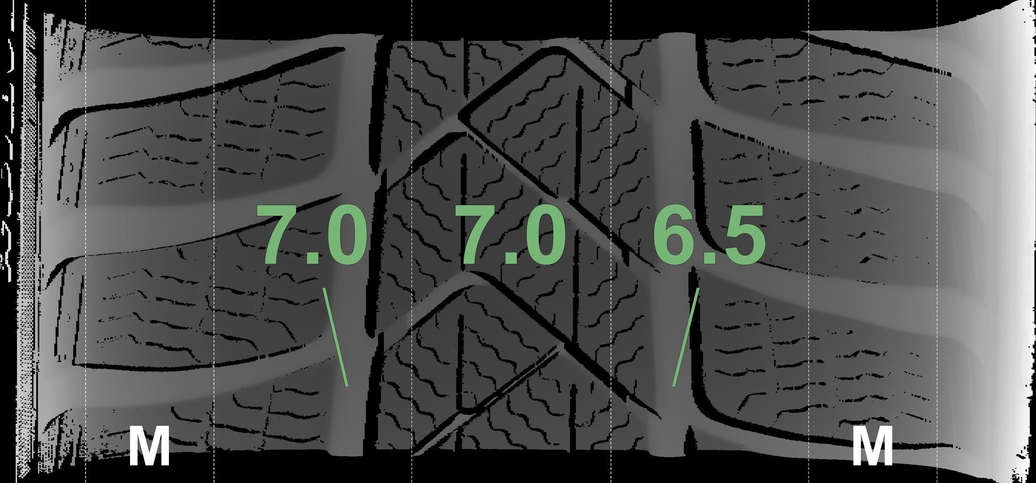De gemeten profieldieptes en de details van de velgen zijn hierboven weergegeven.