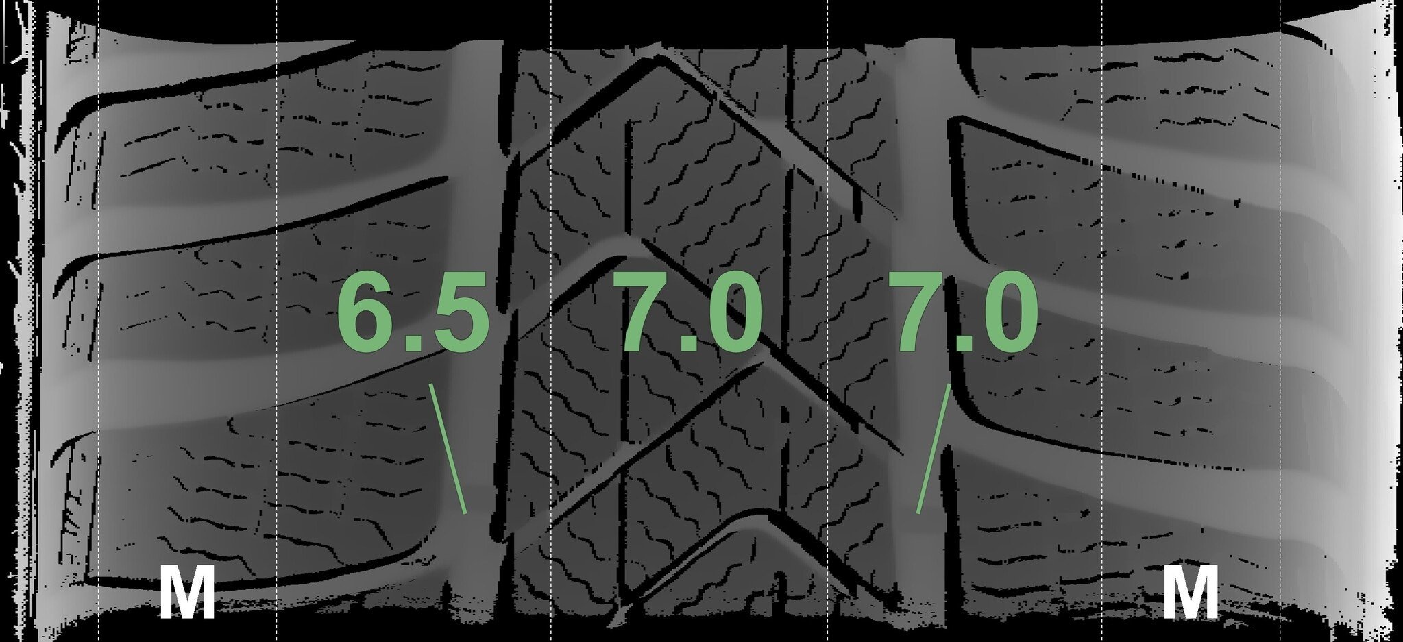 De gemeten profieldieptes en de details van de velgen zijn hierboven weergegeven.