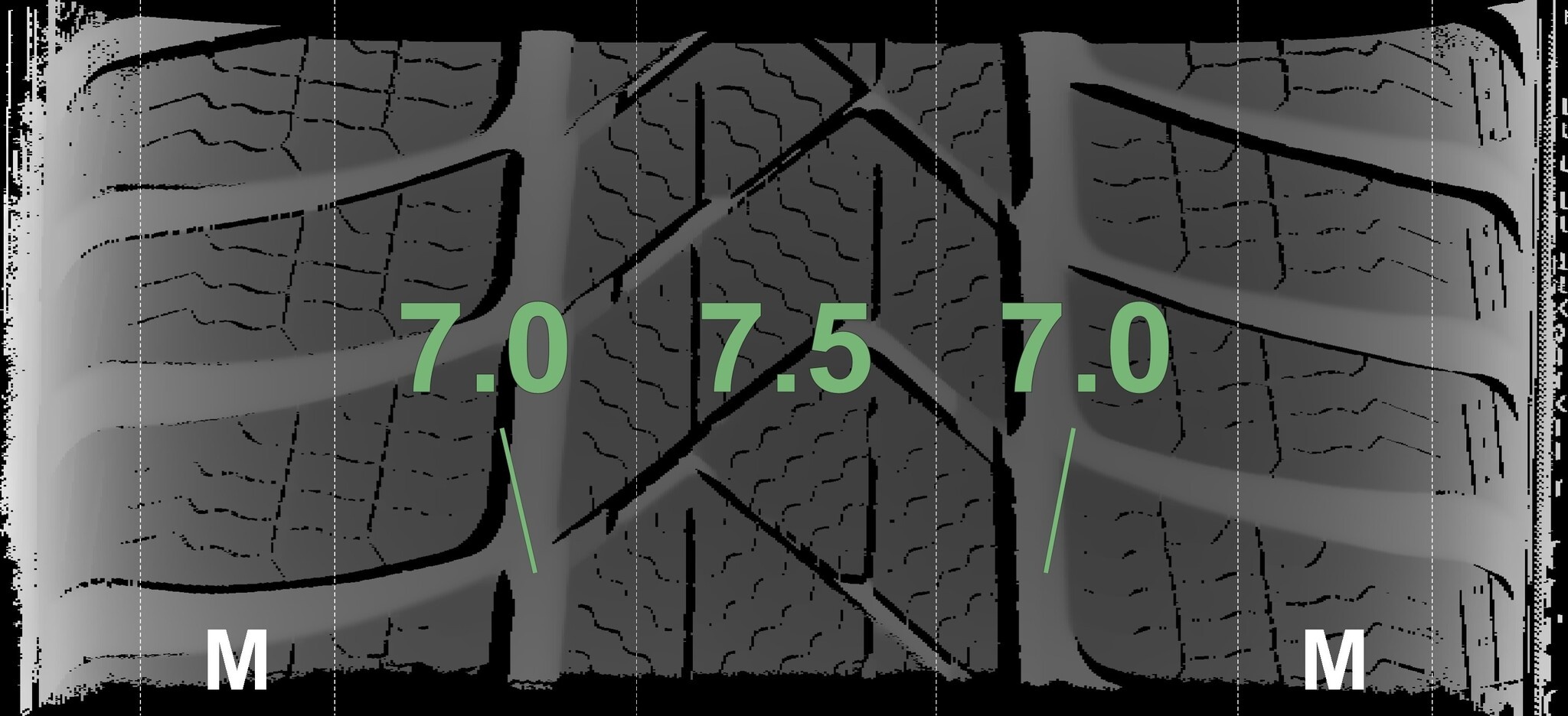 De gemeten profieldieptes en de details van de velgen zijn hierboven weergegeven.