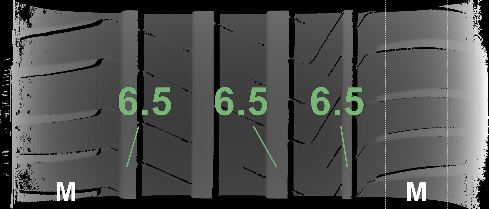 | Conditie | Profieldiepte | DOT | Rechts Achter | Demo nopjes nog zichtbaar | 6.5 mm | 0525 |