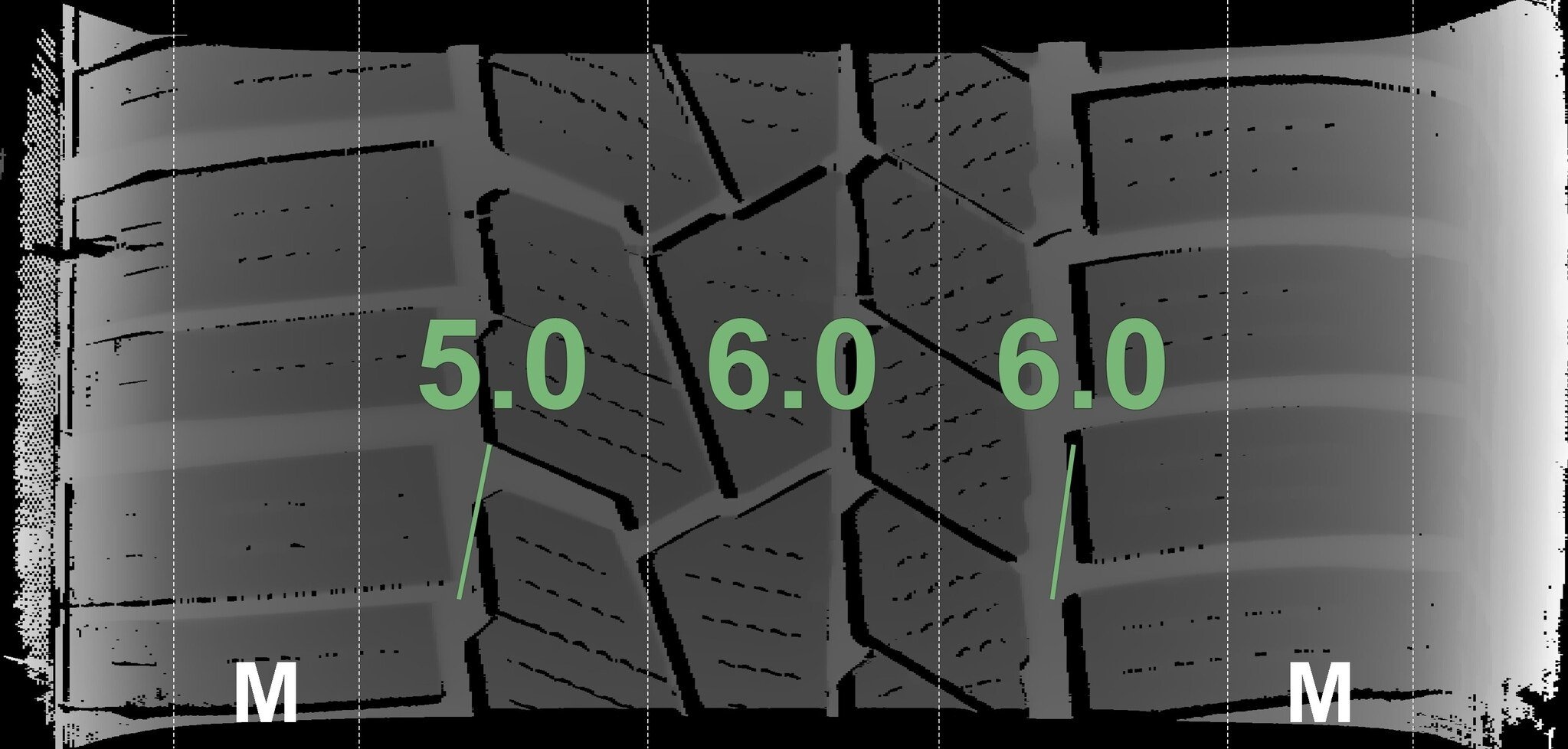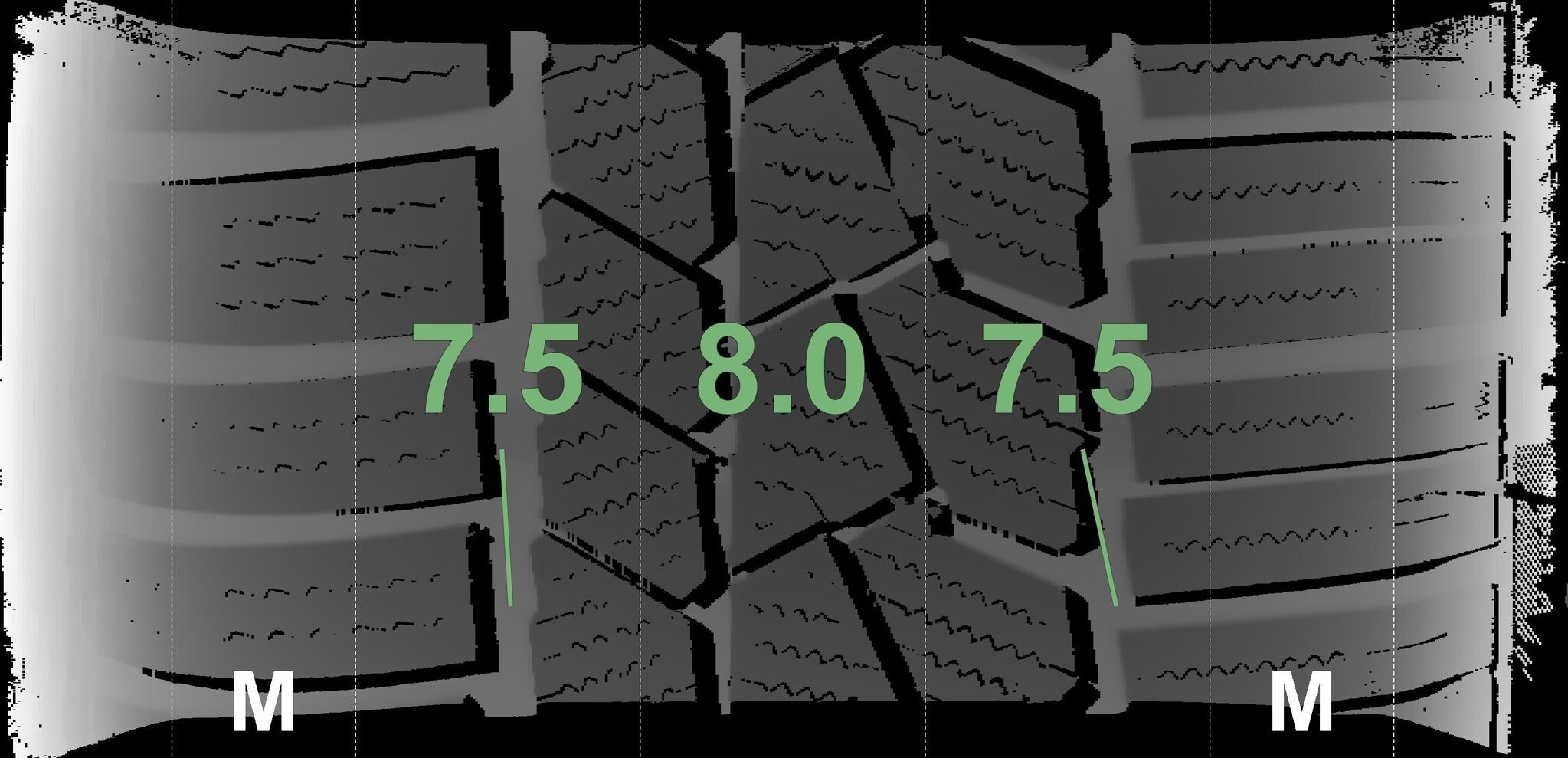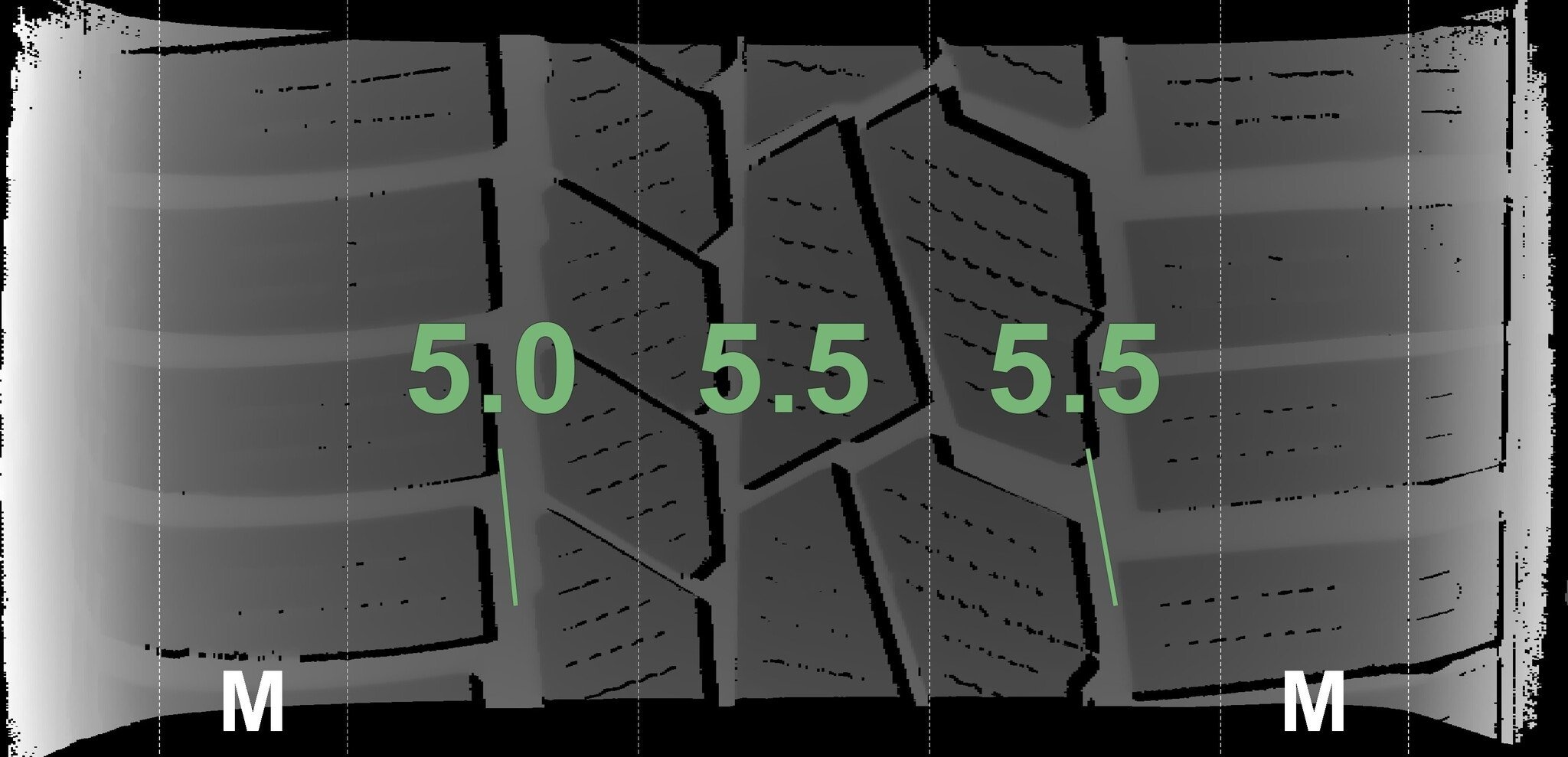 De gemeten profieldieptes en de details van de velgen zijn hierboven weergegeven.