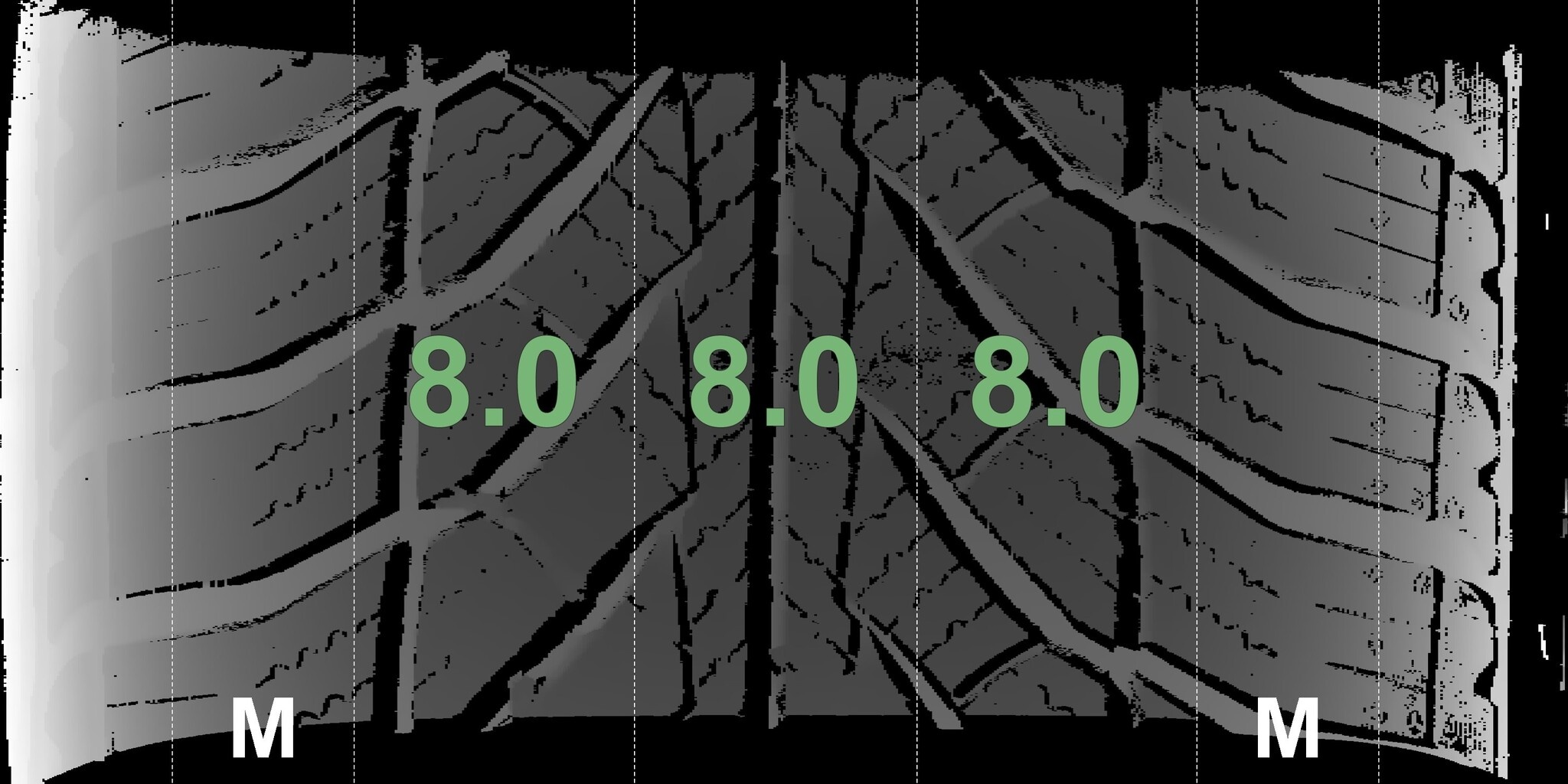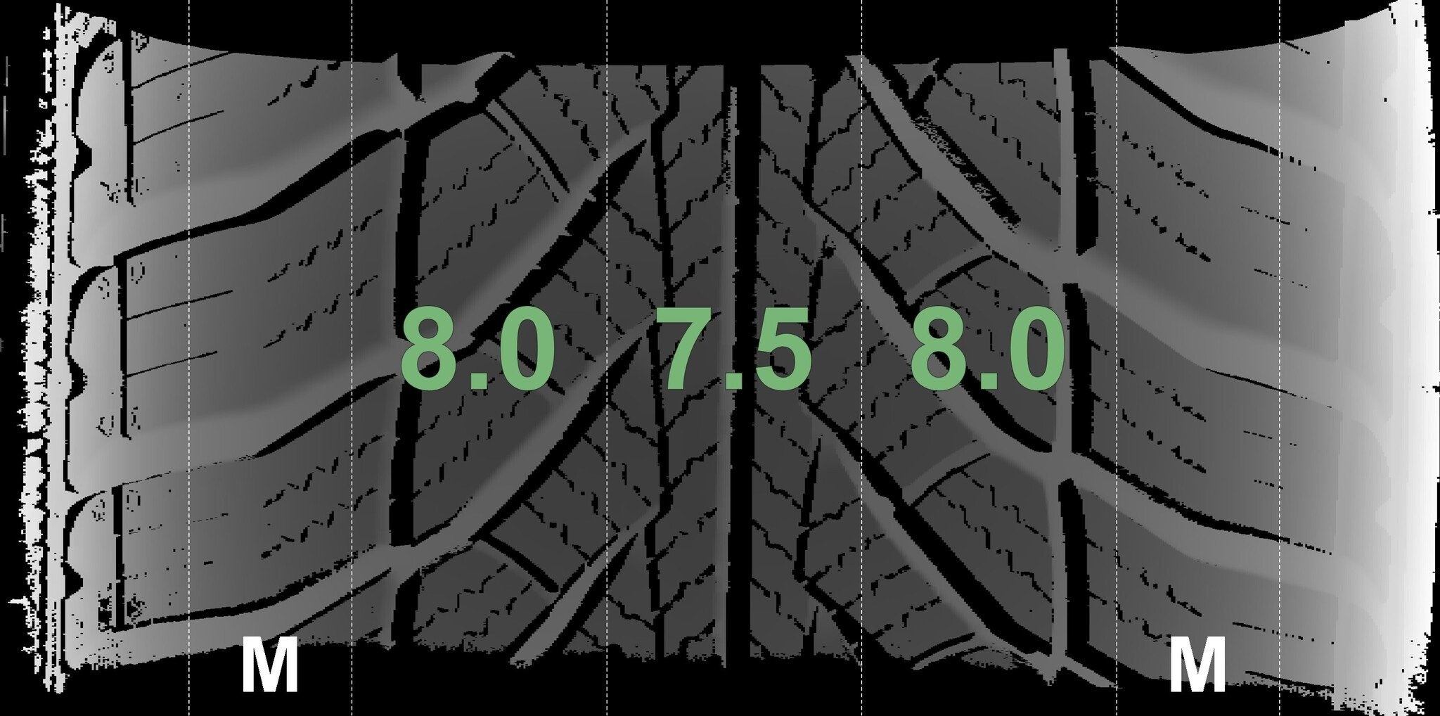 De gemeten profieldieptes en de details van de velgen zijn hierboven weergegeven.