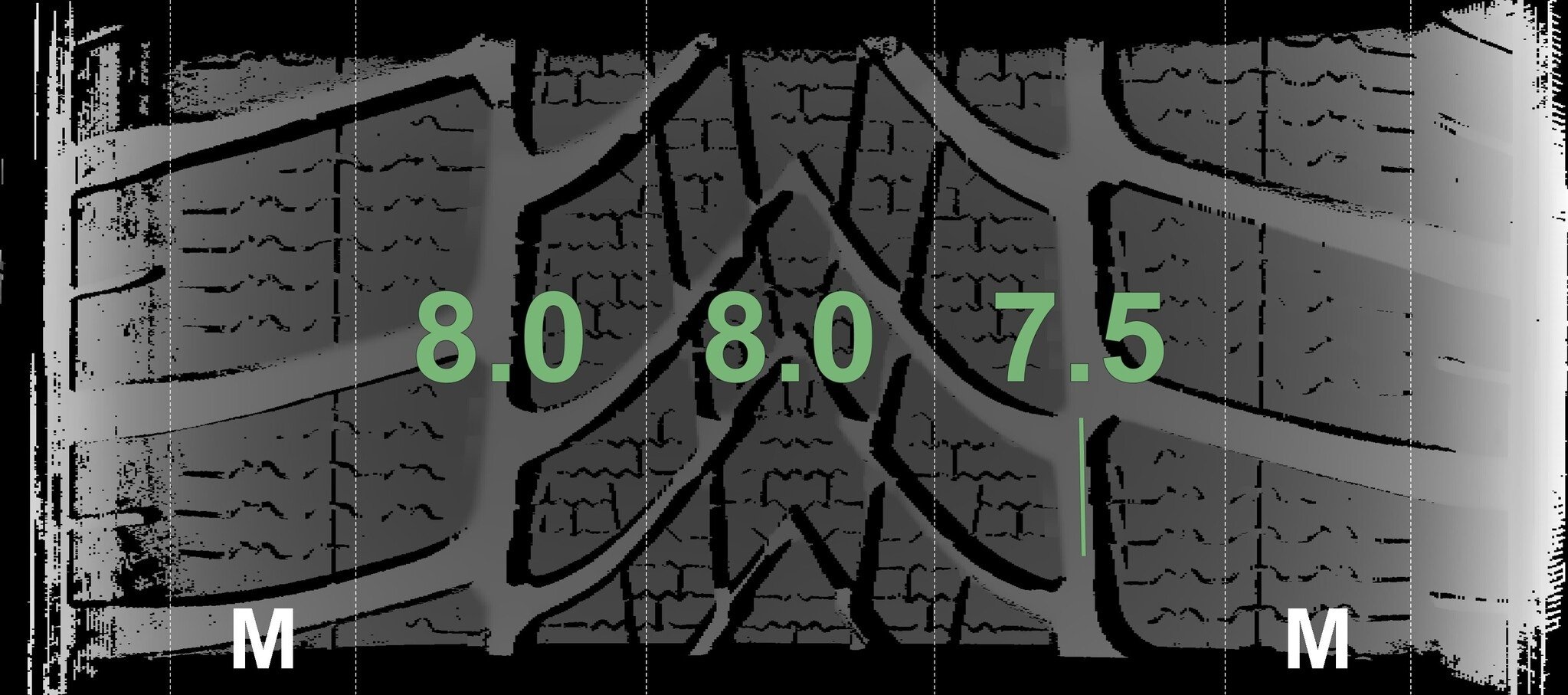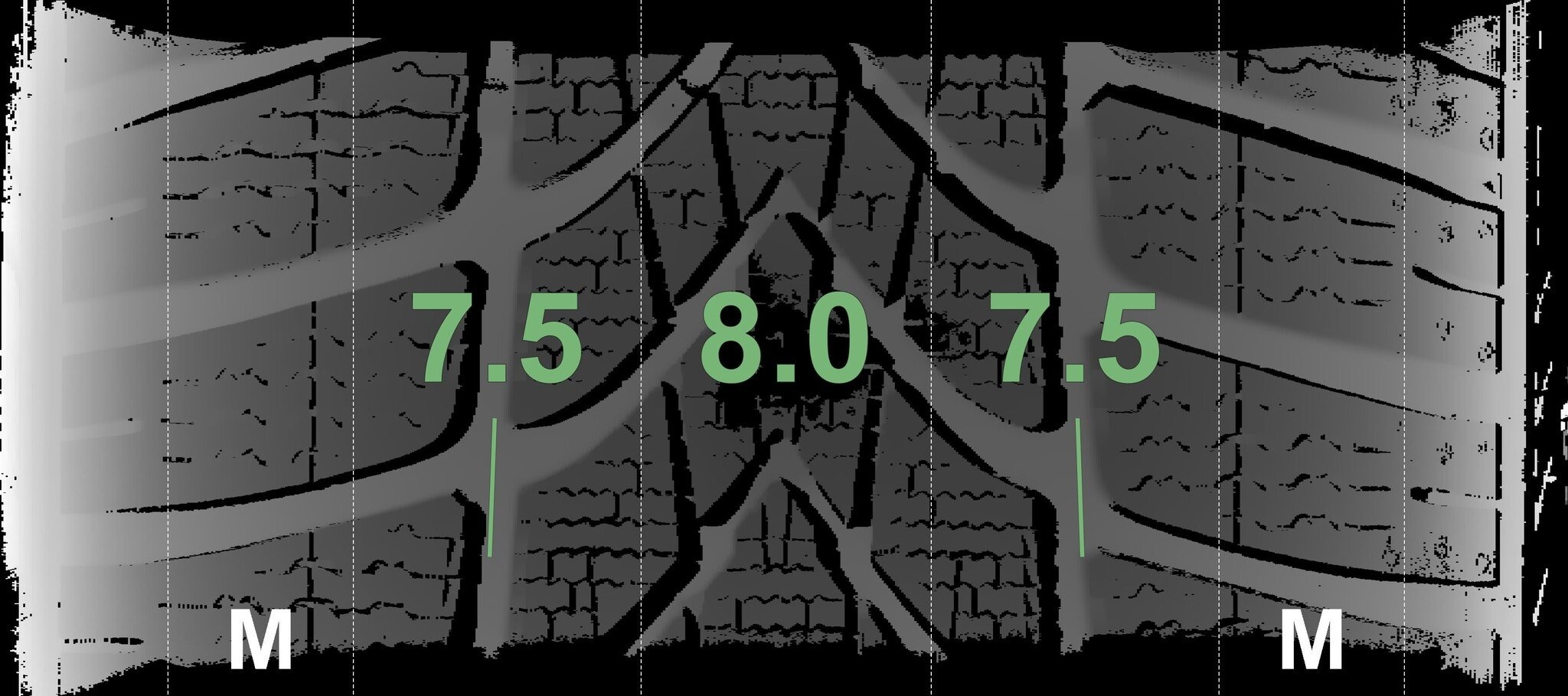 De gemeten profieldieptes en de details van de velgen zijn hierboven weergegeven.