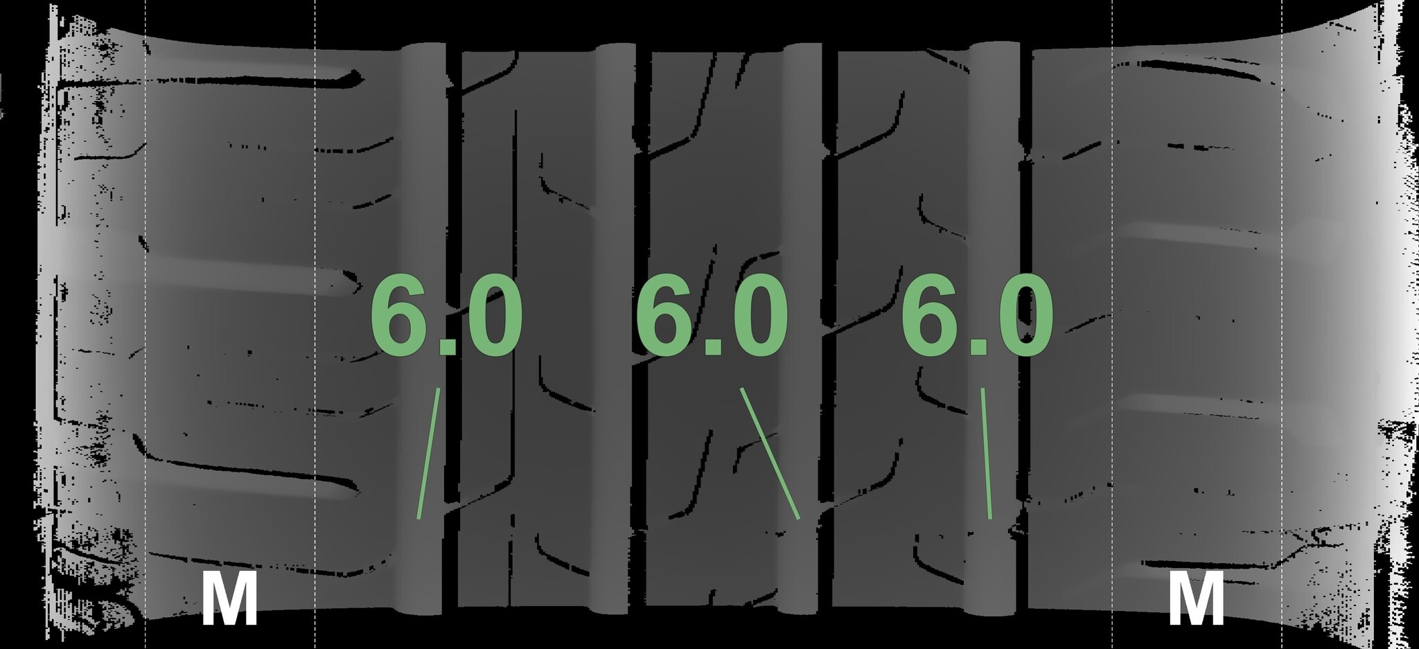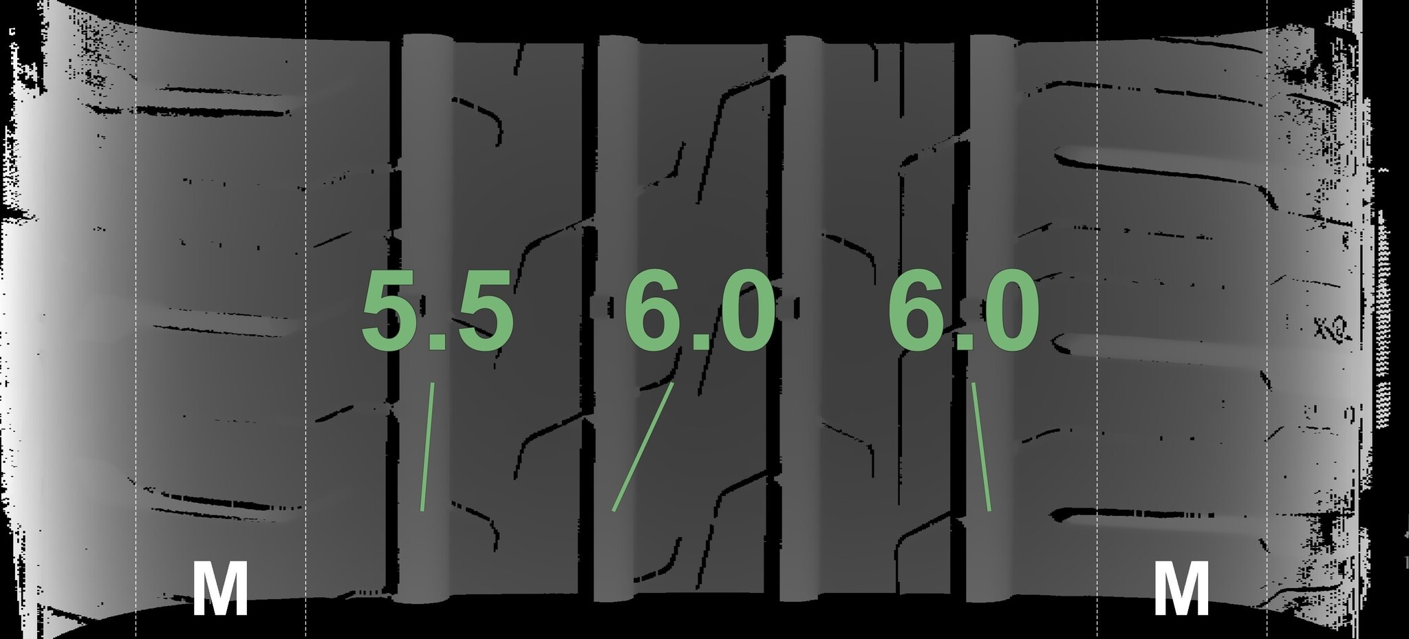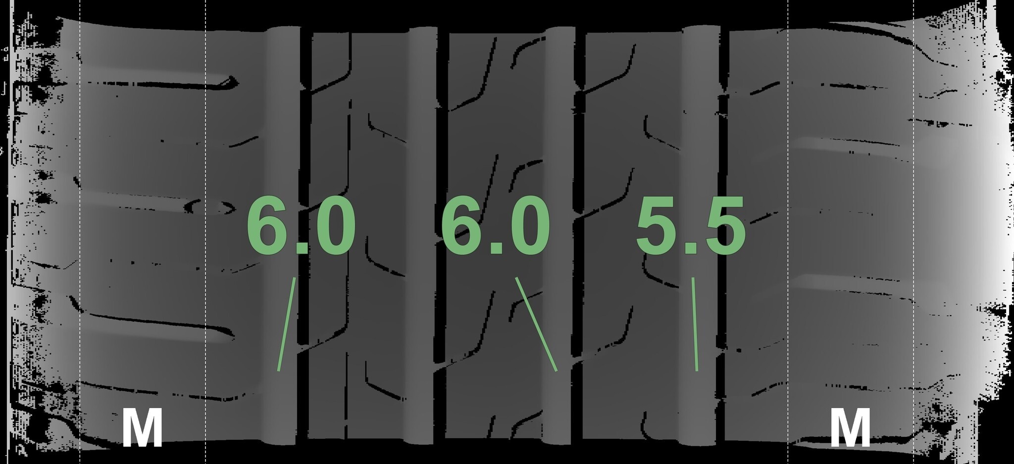 De gemeten profieldieptes en de details van de velgen zijn hierboven weergegeven.