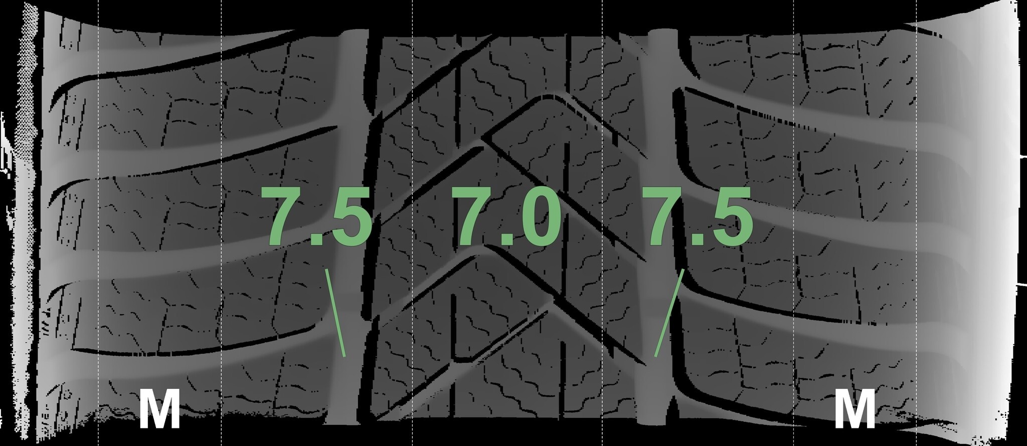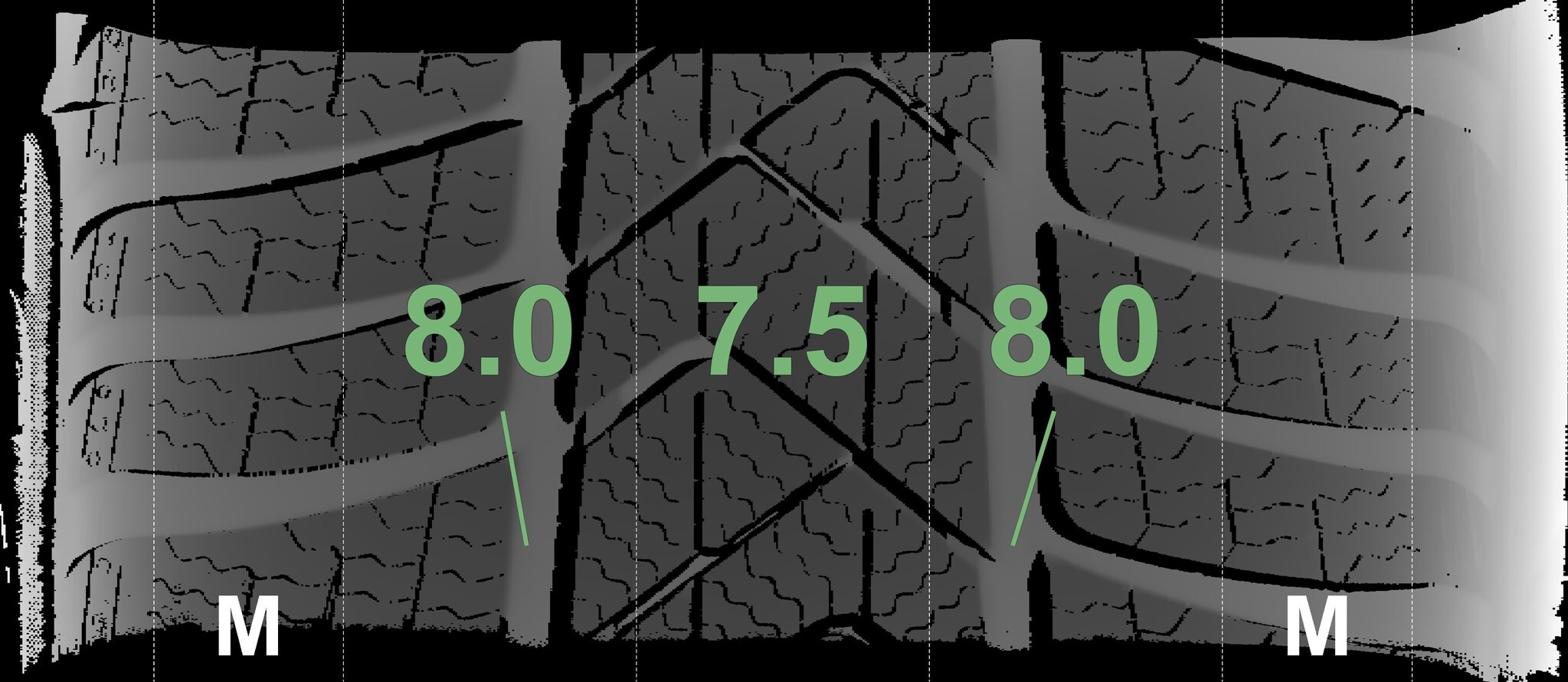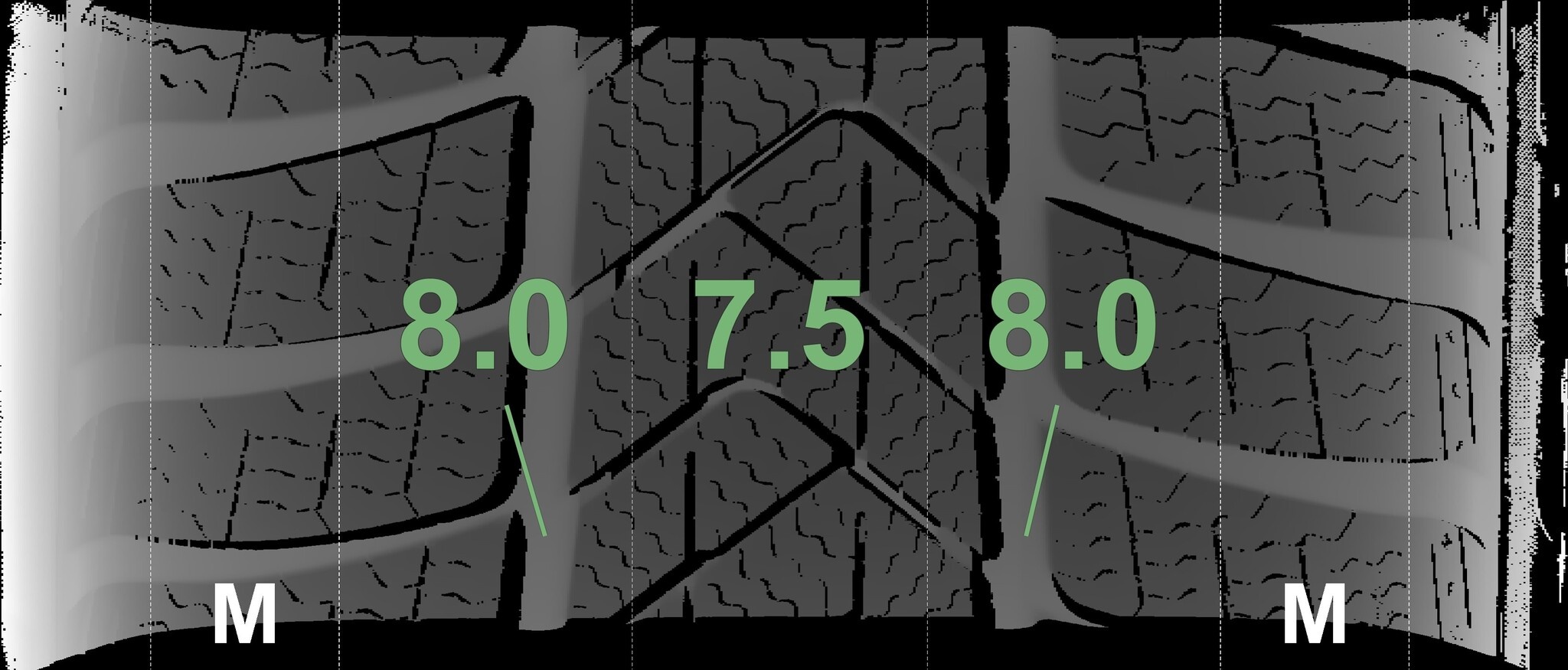 De gemeten profieldieptes en de details van de velgen zijn hierboven weergegeven.