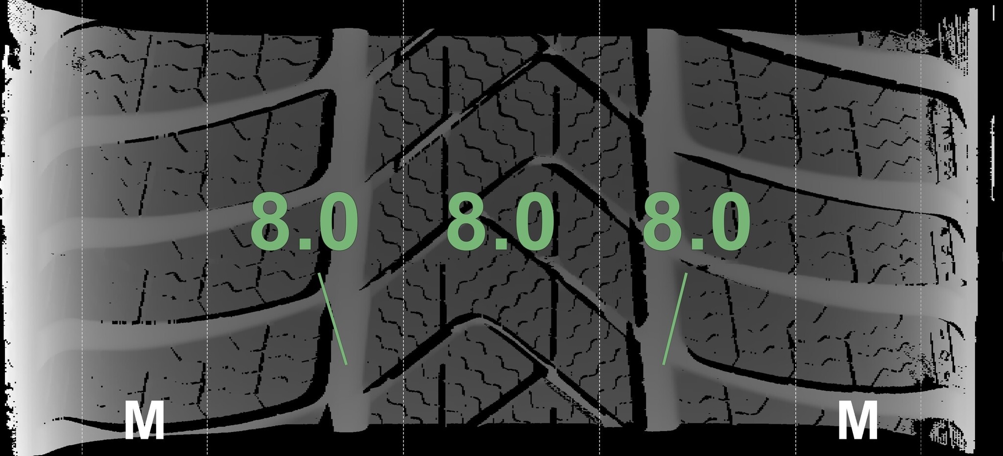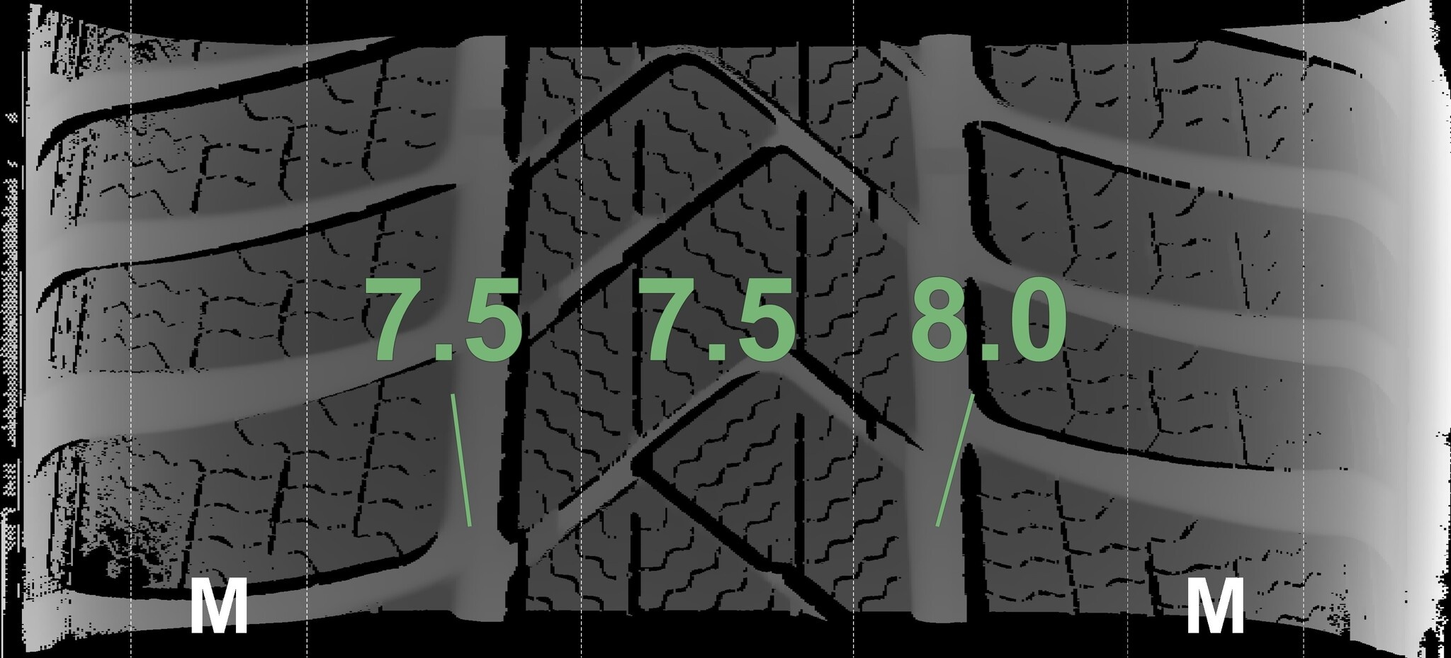 De gemeten profieldieptes en de details van de velgen zijn hierboven weergegeven.