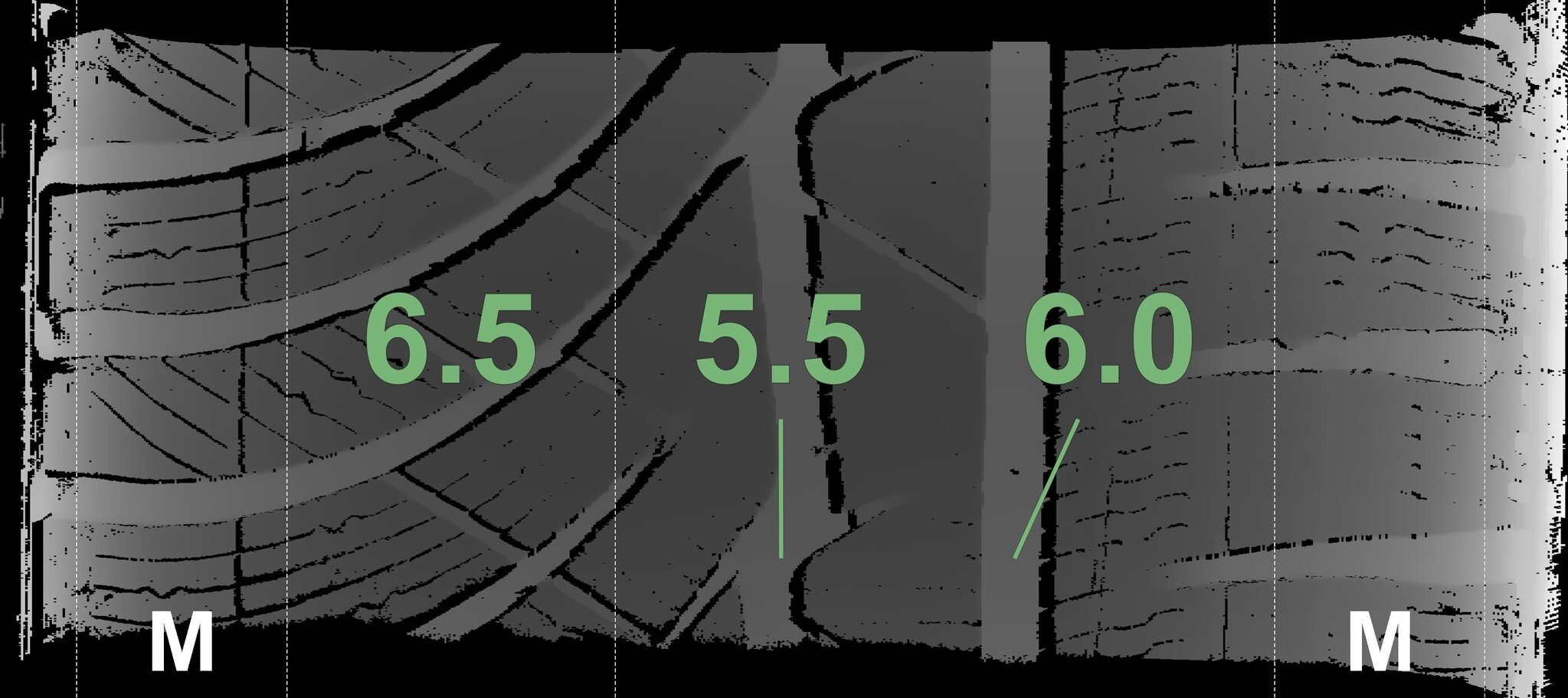 De gemeten profieldieptes en de details van de velgen zijn hierboven weergegeven.