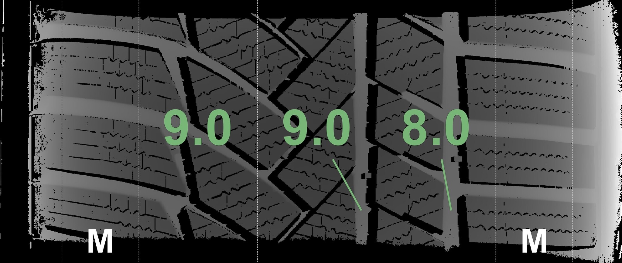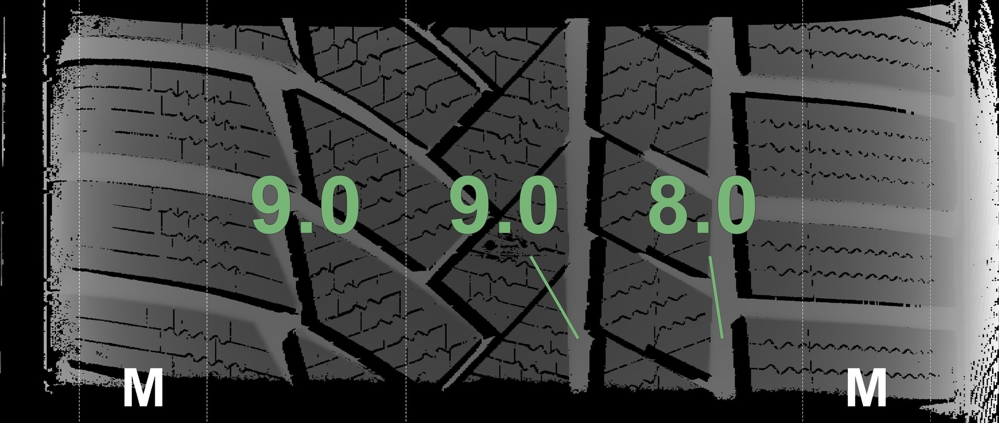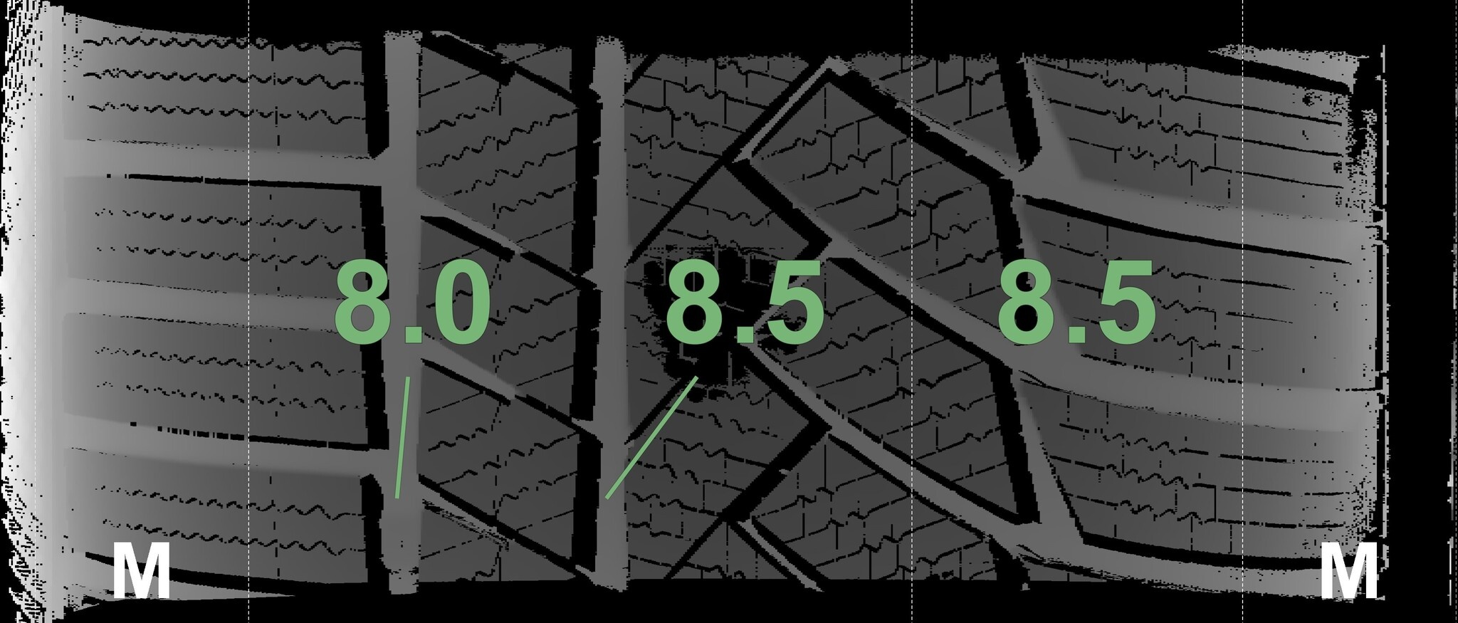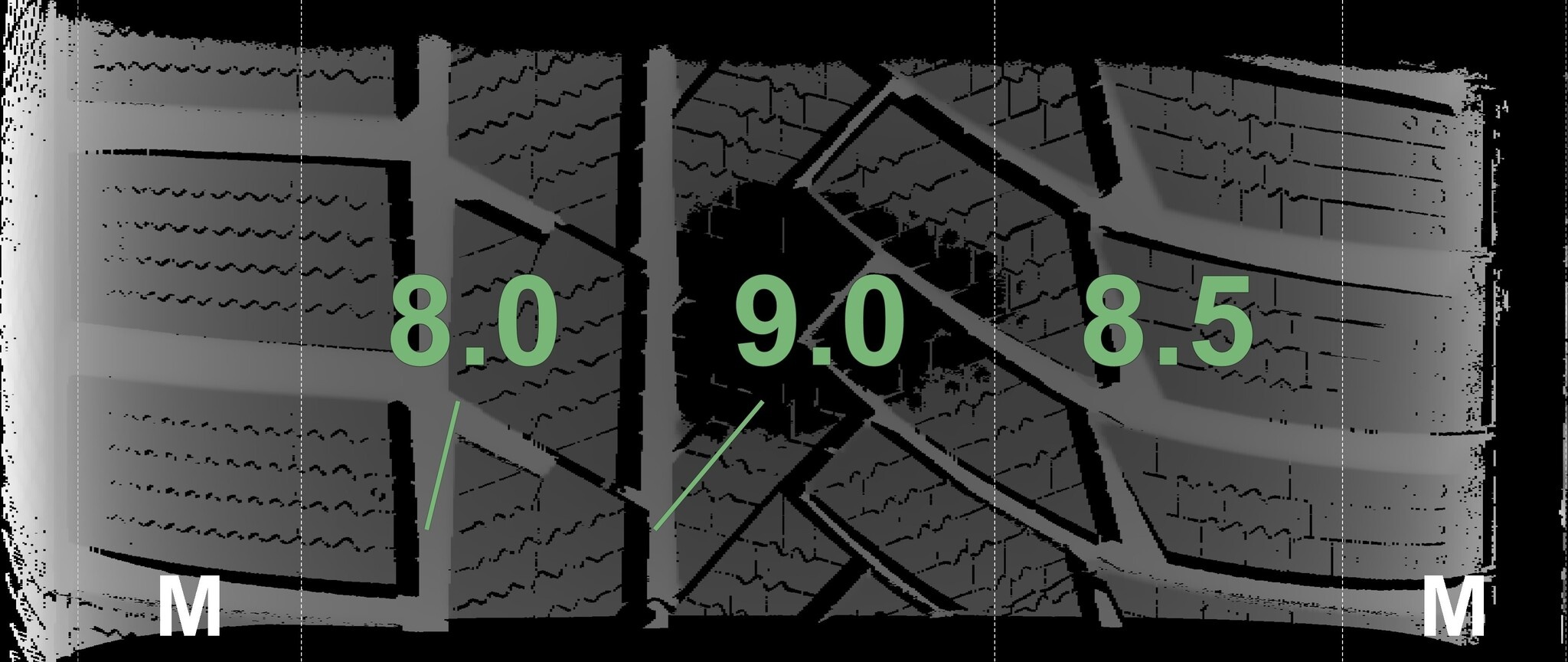 De gemeten profieldieptes en de details van de velgen zijn hierboven weergegeven.