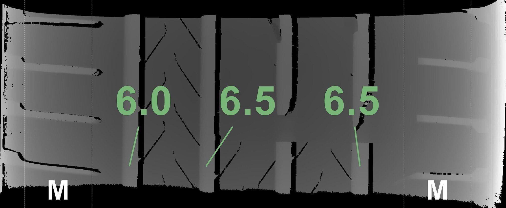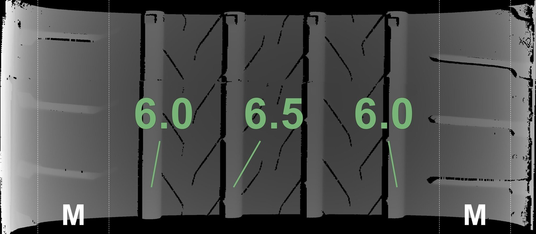 De gemeten profieldieptes en de details van de velgen zijn hierboven weergegeven.