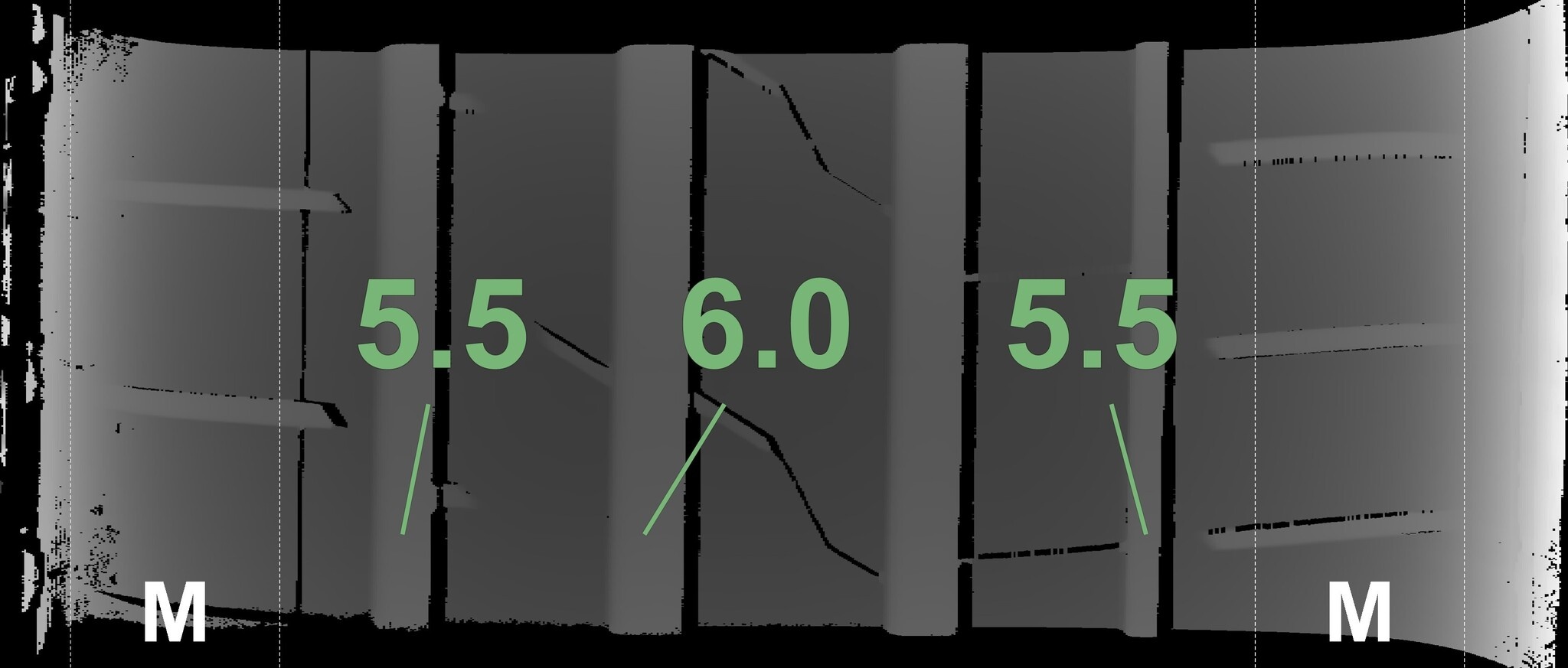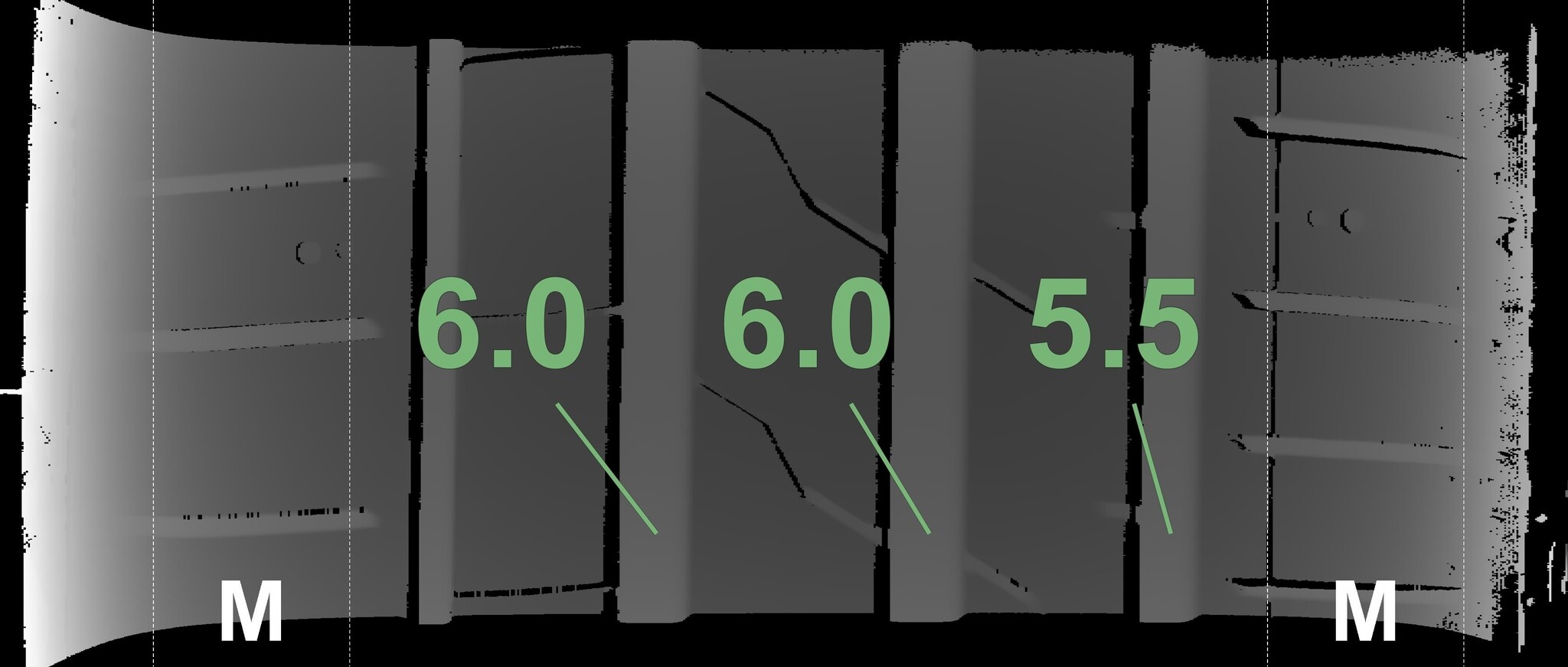 De gemeten profieldieptes en de details van de velgen zijn hierboven weergegeven.