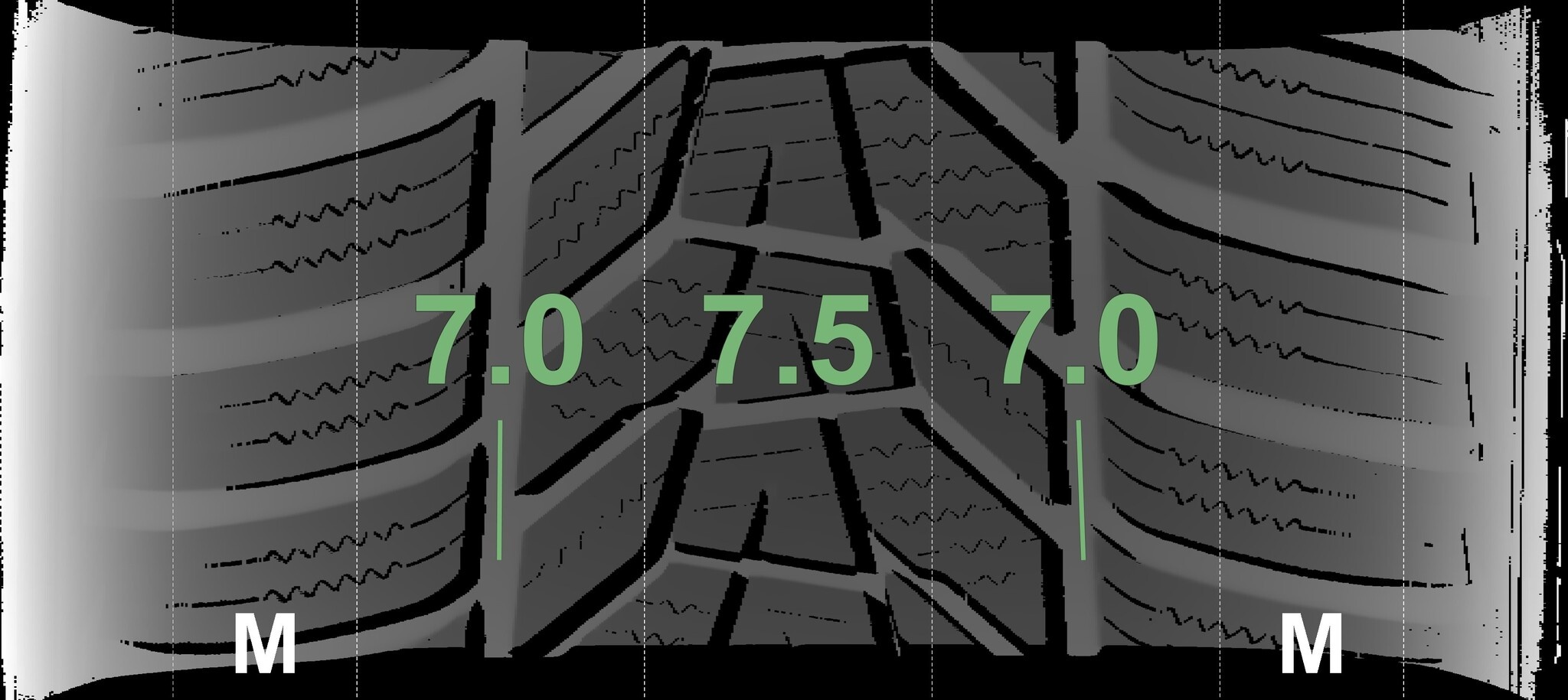 De gemeten profieldieptes en de details van de velgen zijn hierboven weergegeven.