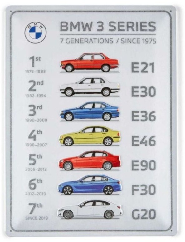 Dit gedetailleerde metalen bord van 7 generaties BMW 3-Serie, is een uniek cadeau voor de BMW liefhebber.