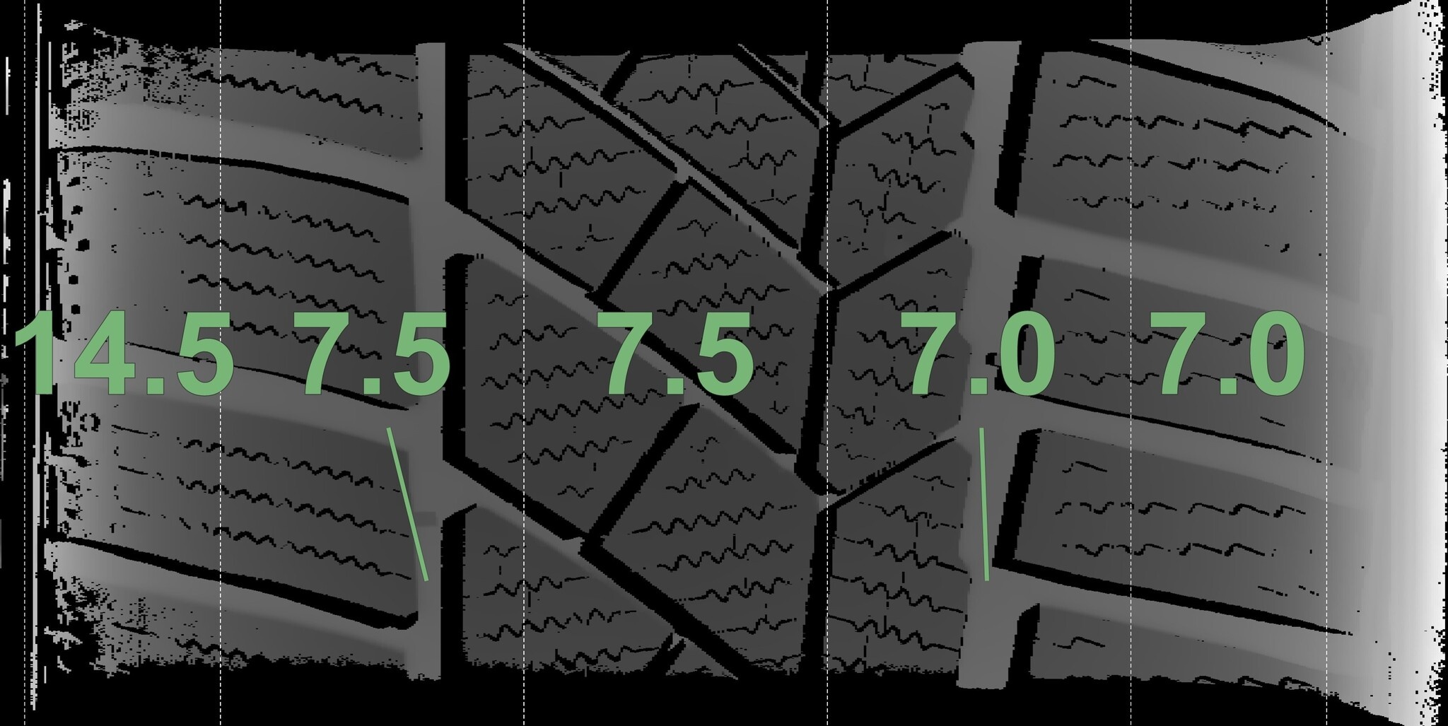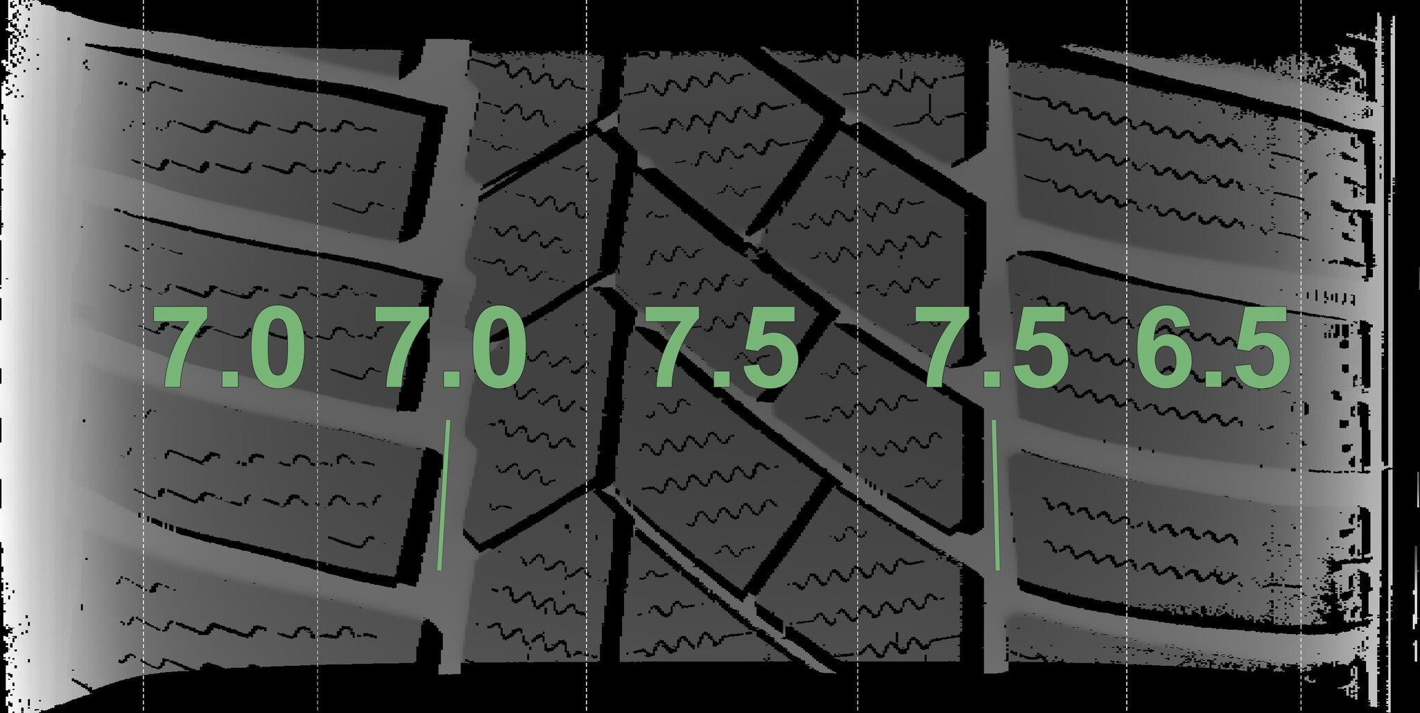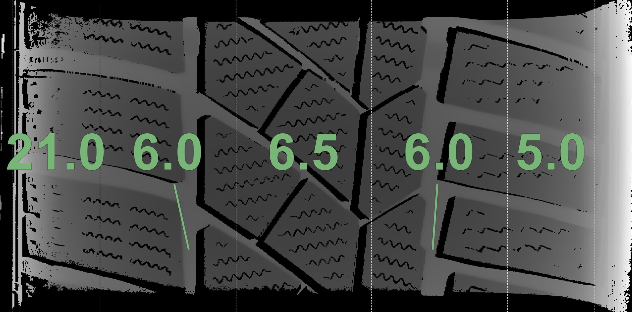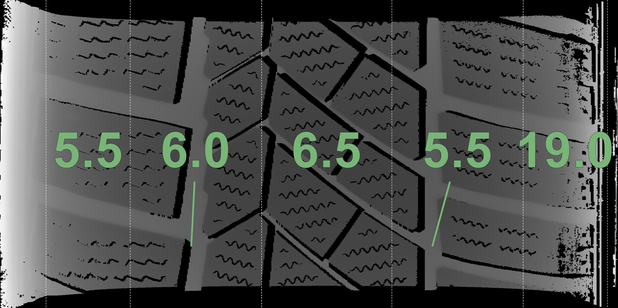 De gemeten profieldieptes en de details van de velgen zijn hierboven weergegeven.