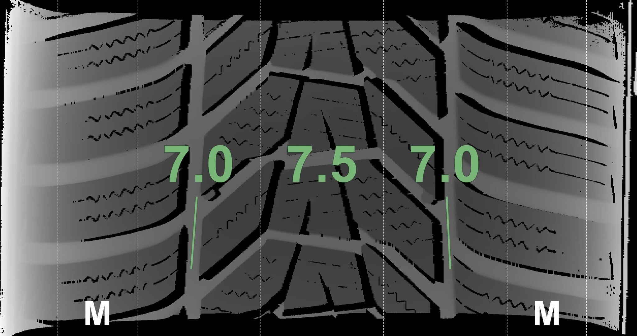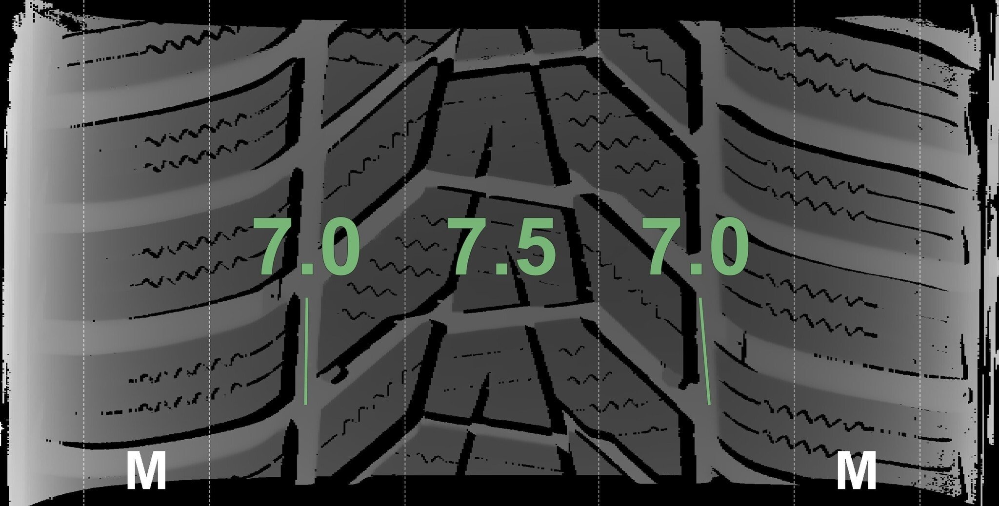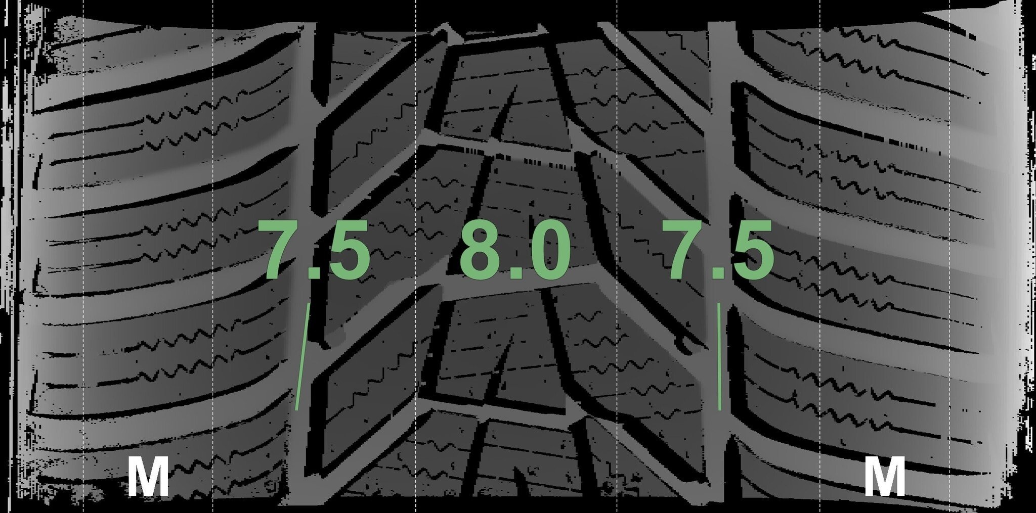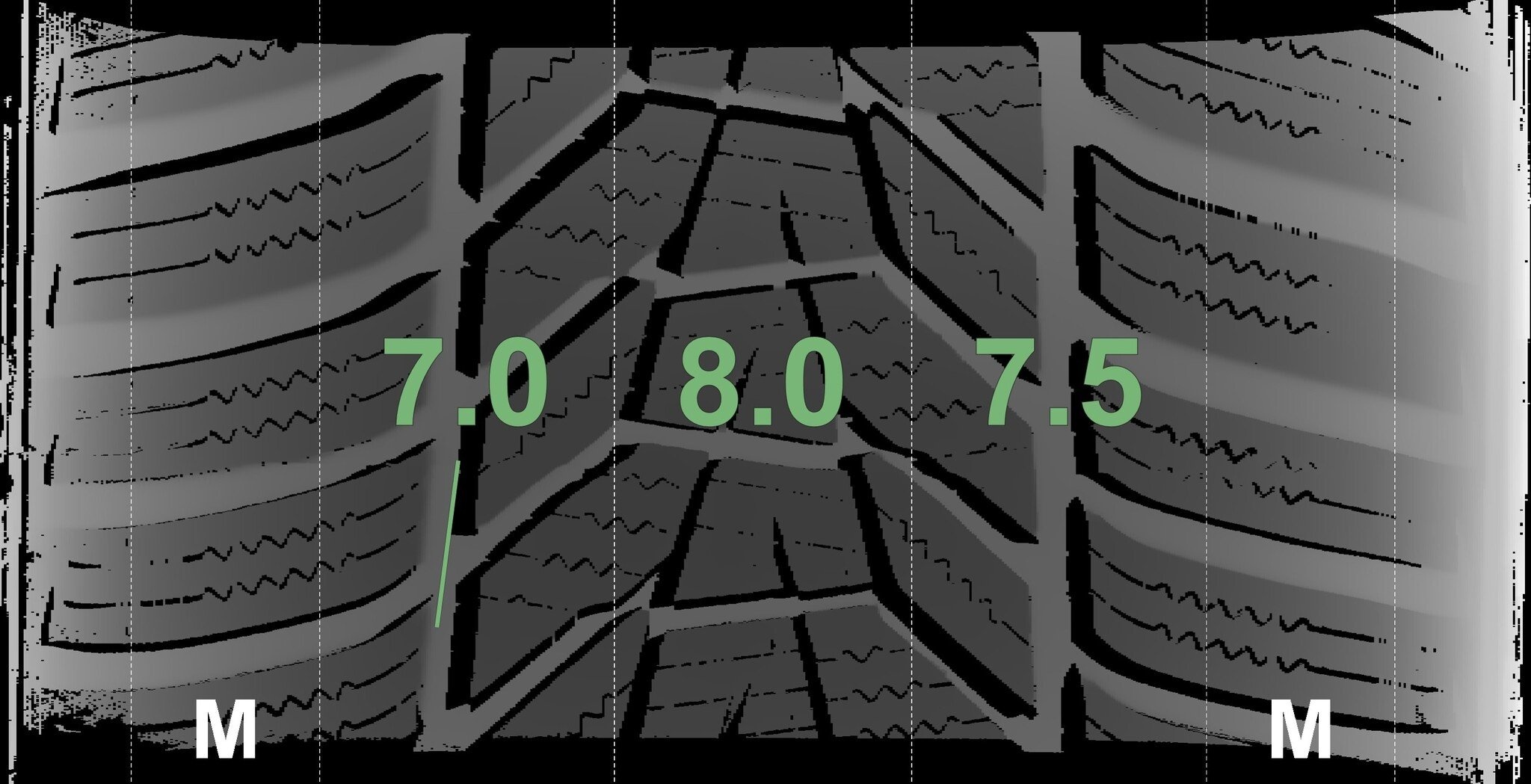 De gemeten profieldieptes en de details van de velgen zijn hierboven weergegeven.