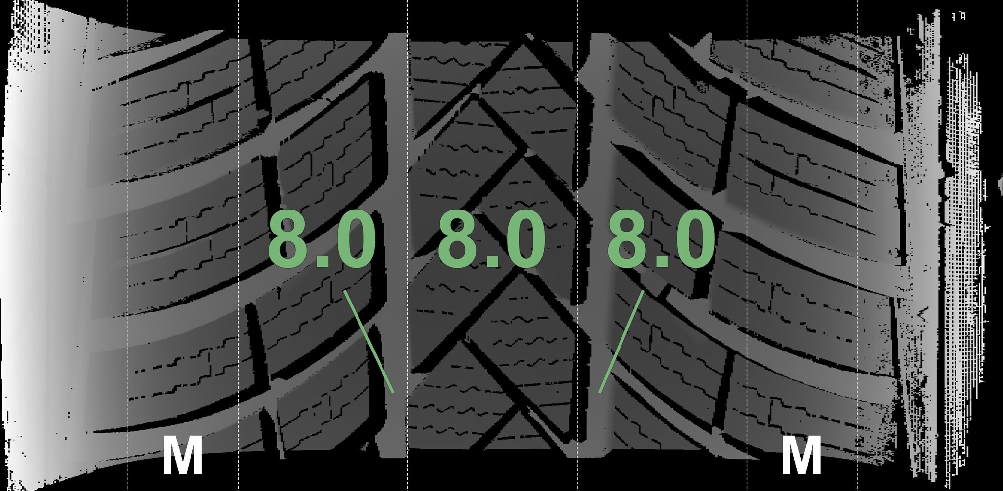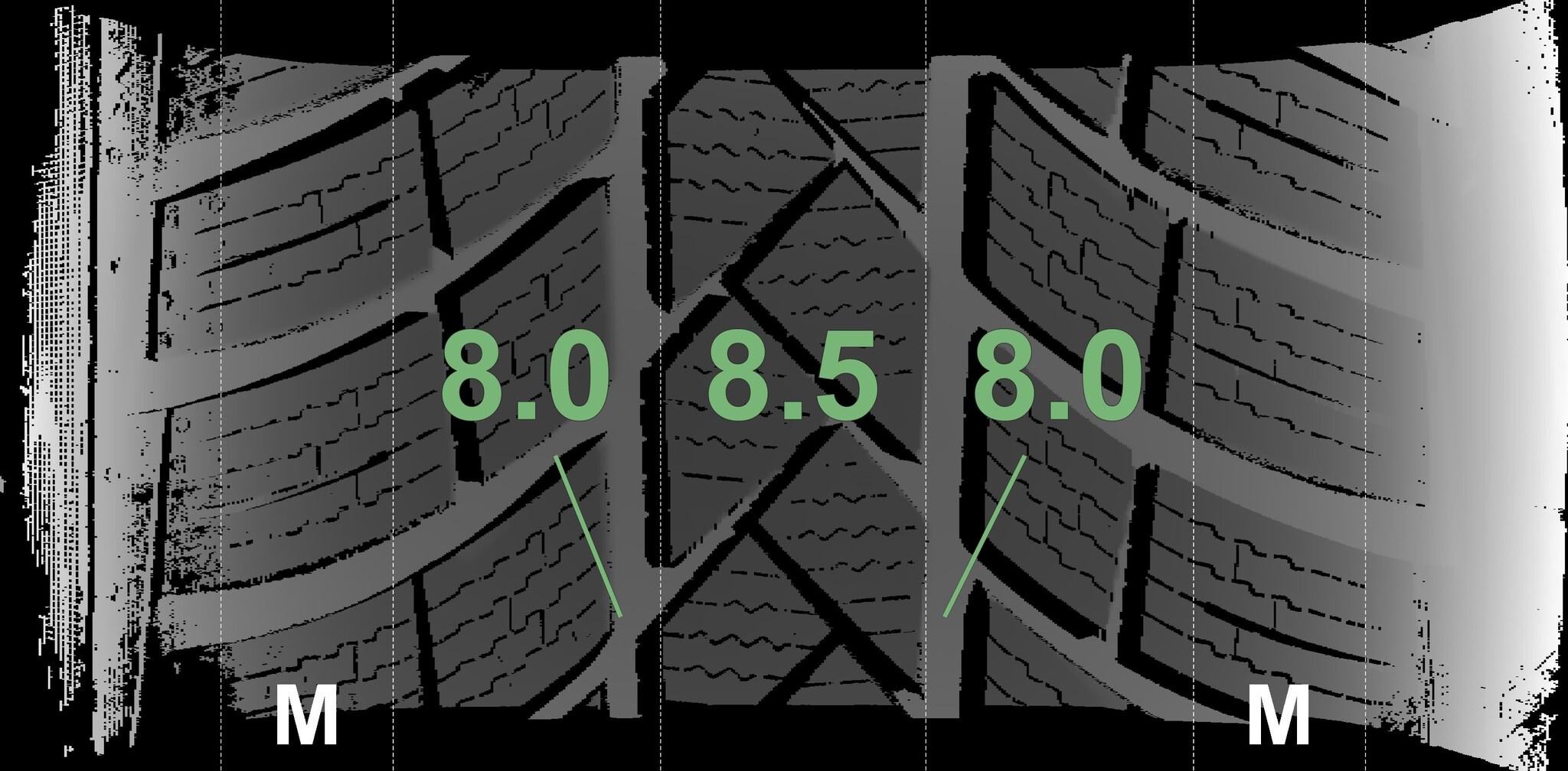 De gemeten profieldieptes en de details van de velgen zijn hierboven weergegeven.