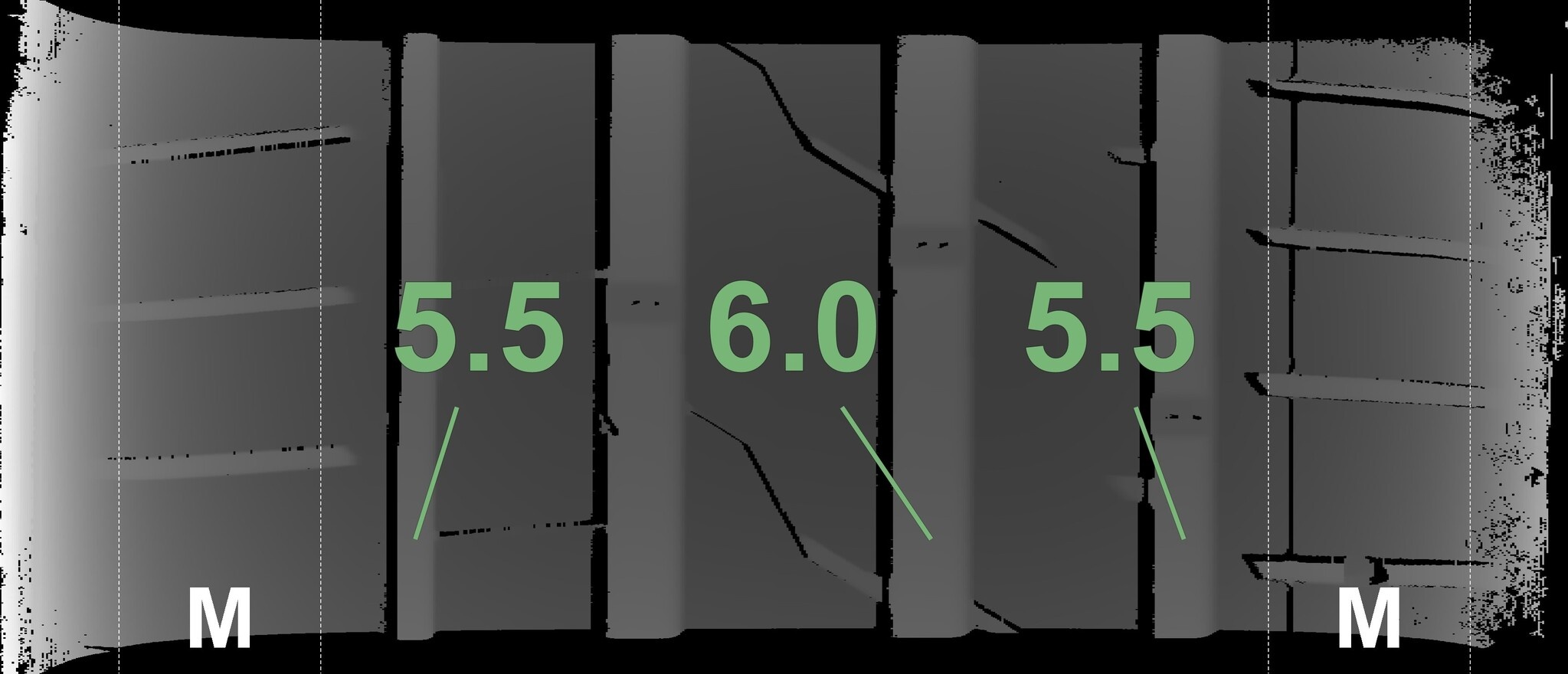 De gemeten profieldieptes en de details van de velgen zijn hierboven weergegeven.