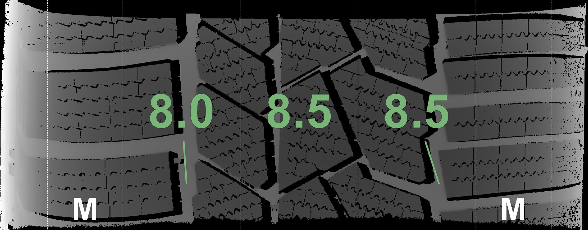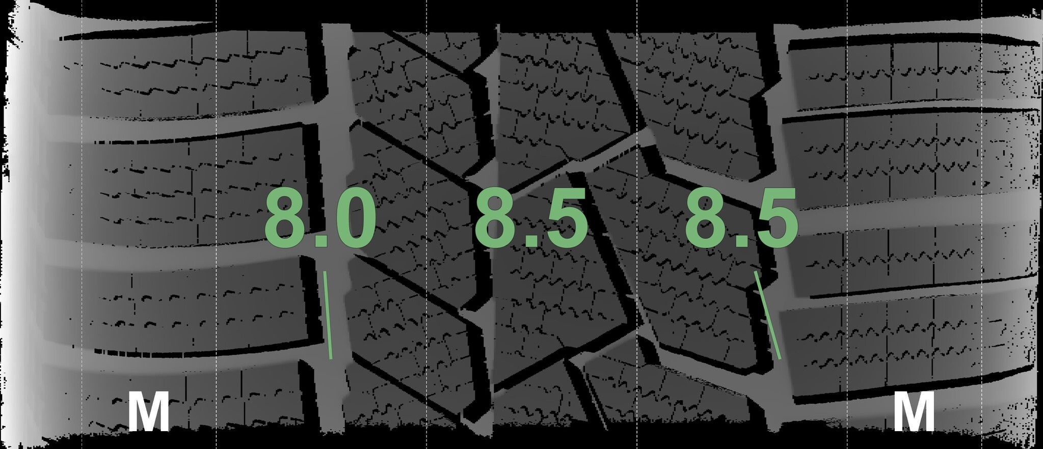 De gemeten profieldieptes en de details van de velgen zijn hierboven weergegeven.
