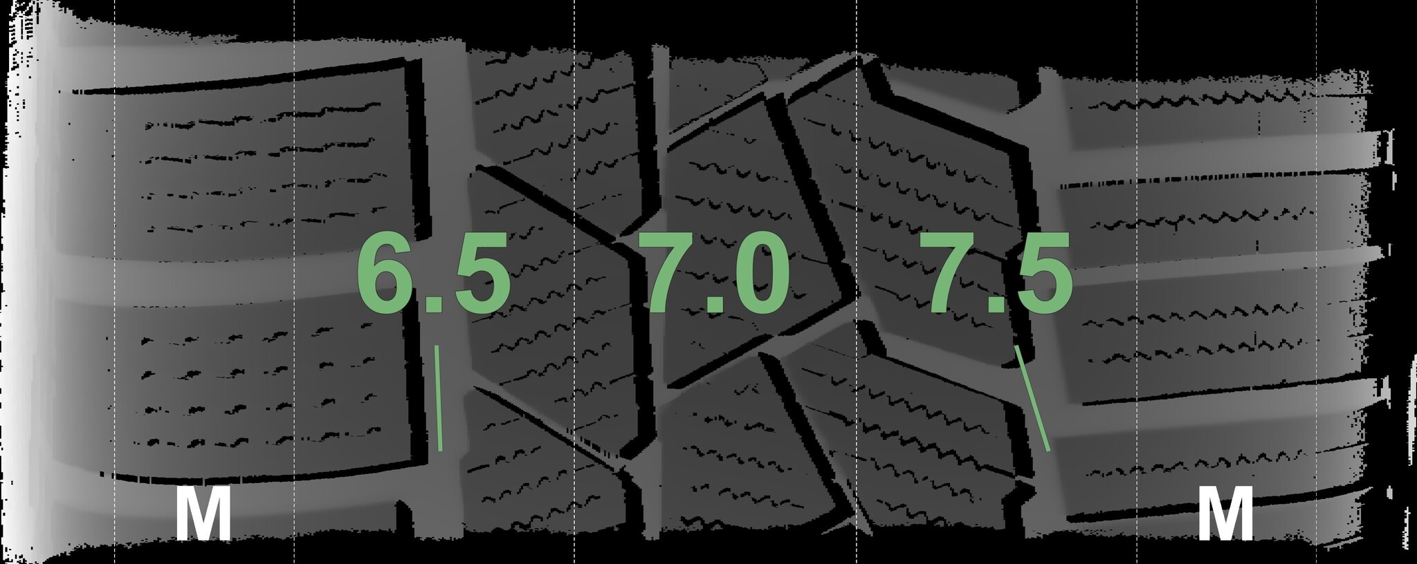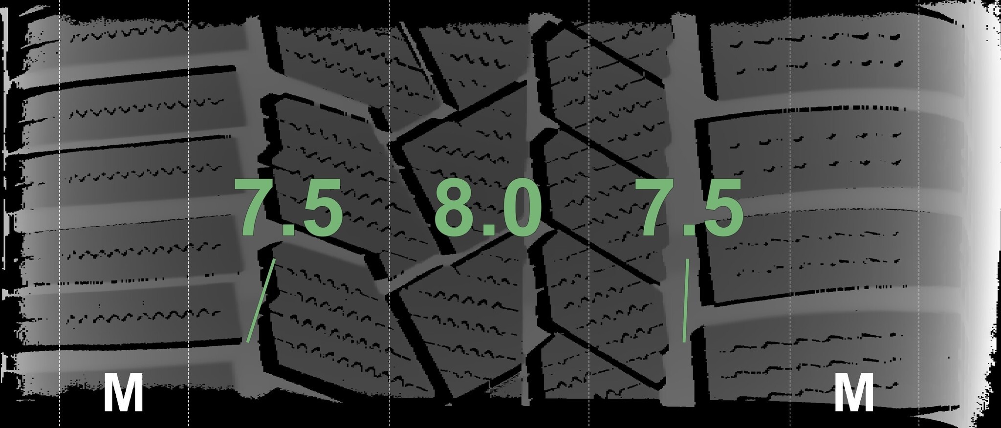 De gemeten profieldieptes en de details van de velgen zijn hierboven weergegeven.