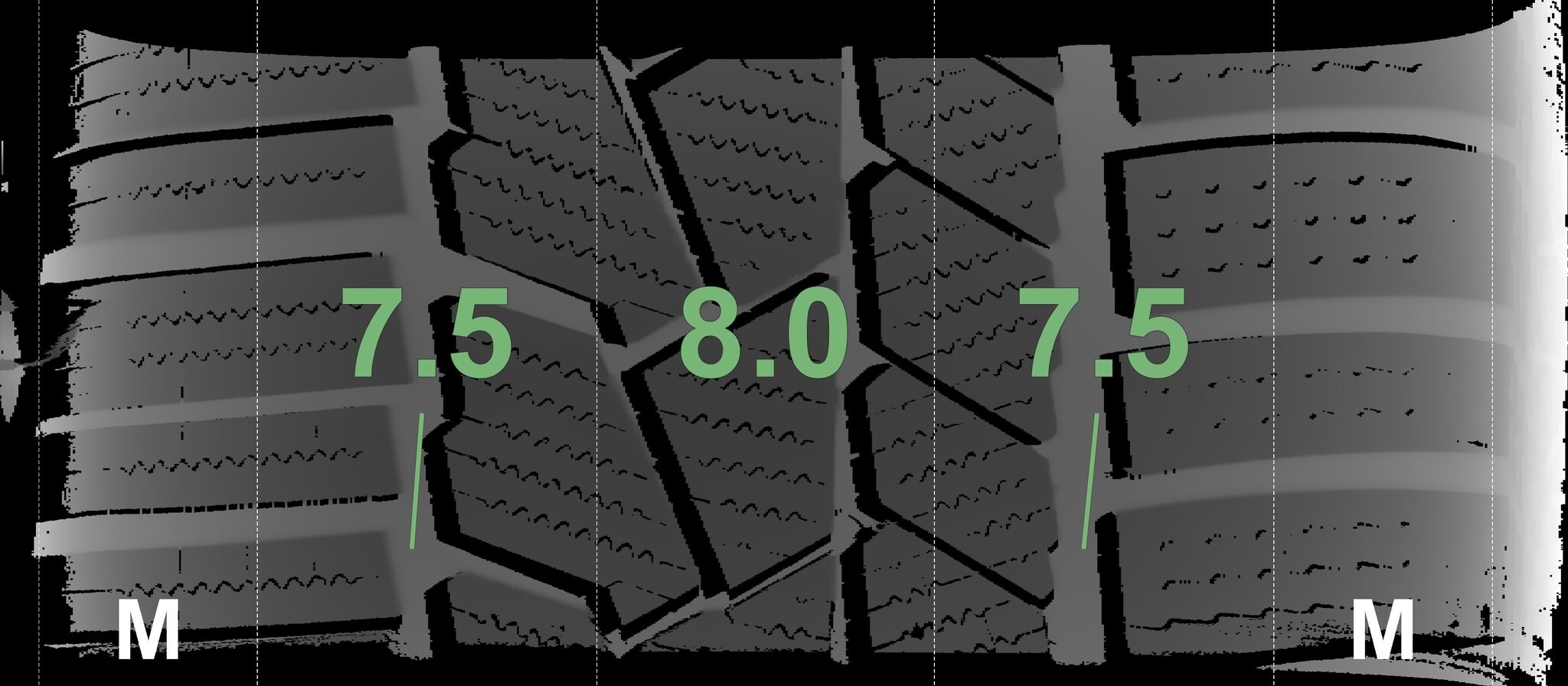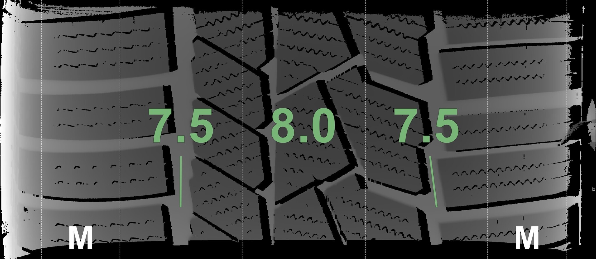 De gemeten profieldieptes en de details van de velgen zijn hierboven weergegeven.