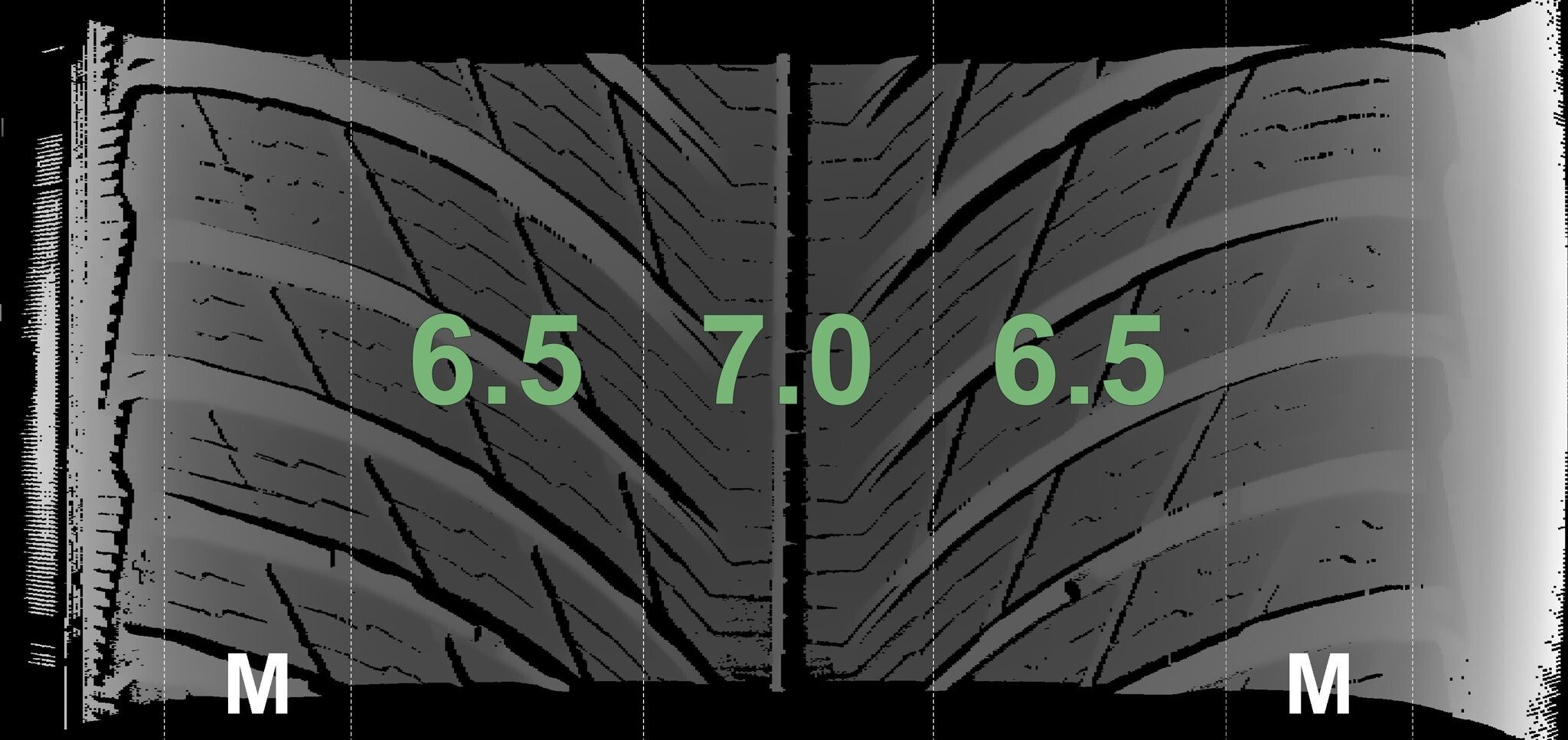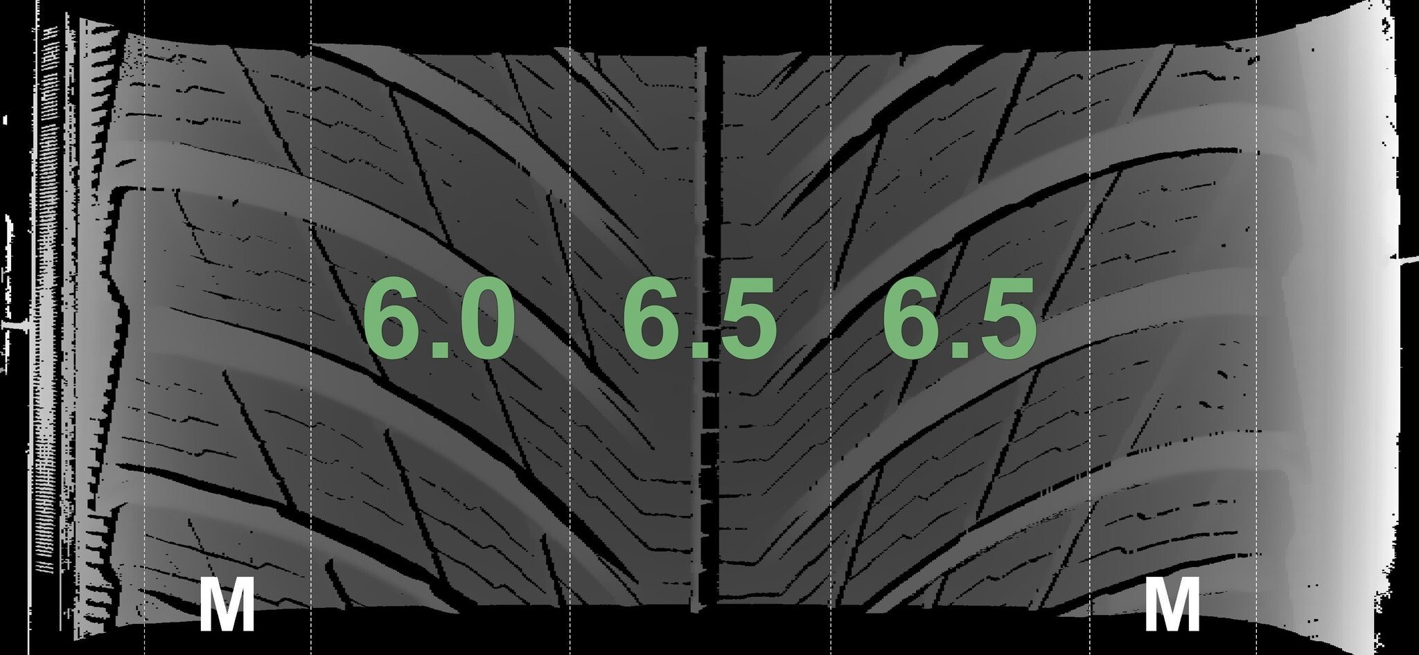 De gemeten profieldieptes en de details van de velgen zijn hierboven weergegeven.