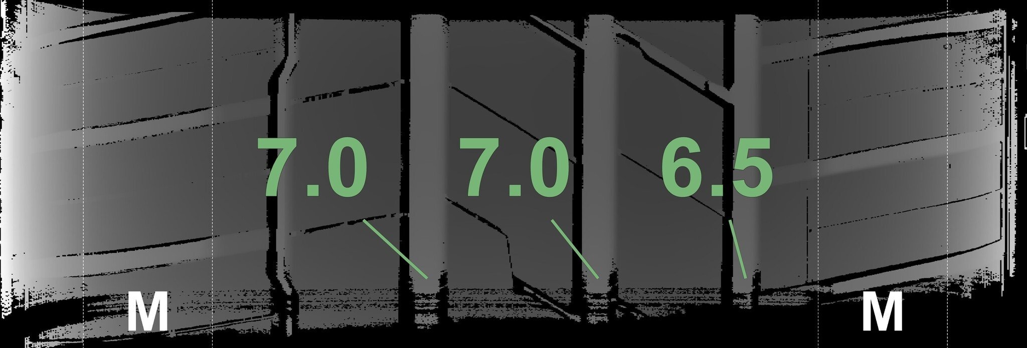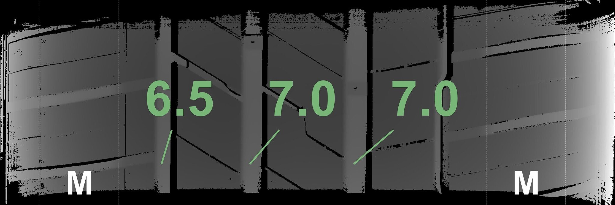 De gemeten profieldieptes en de details van de velgen zijn hierboven weergegeven.
