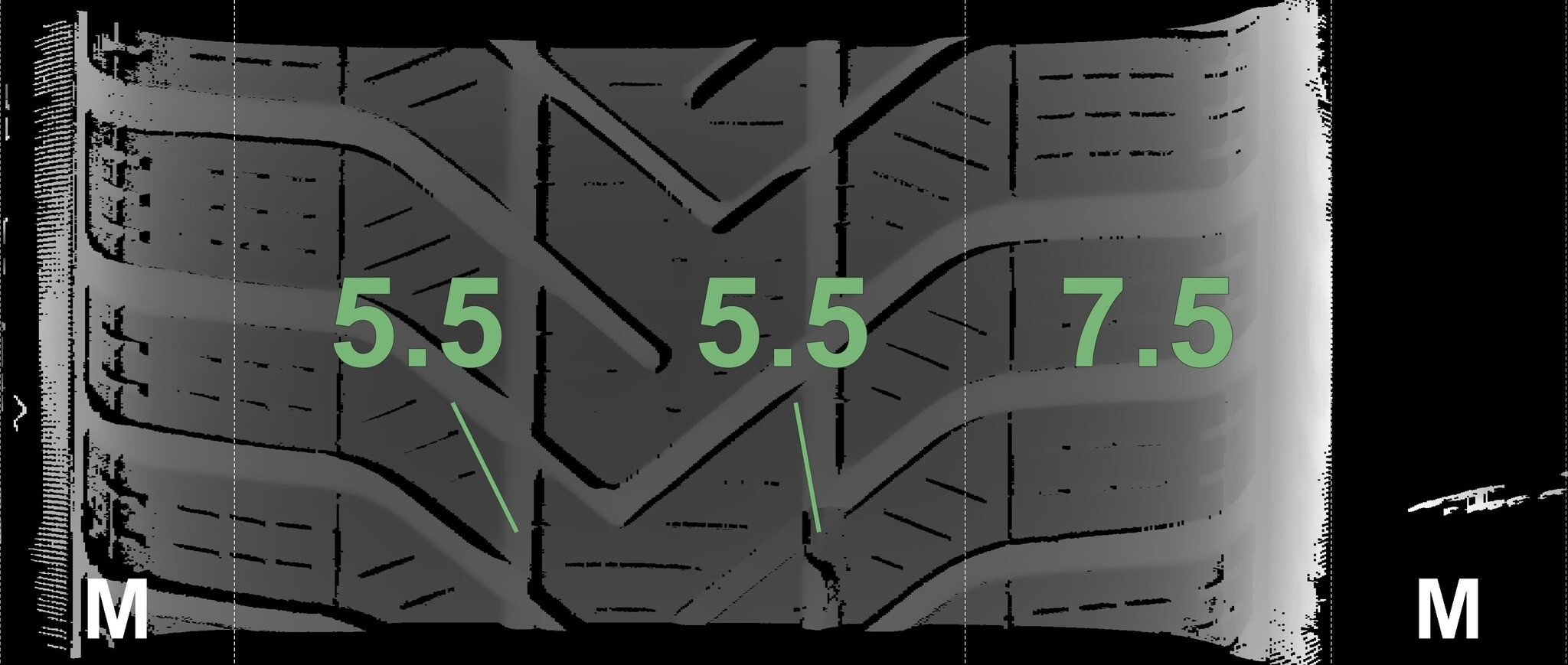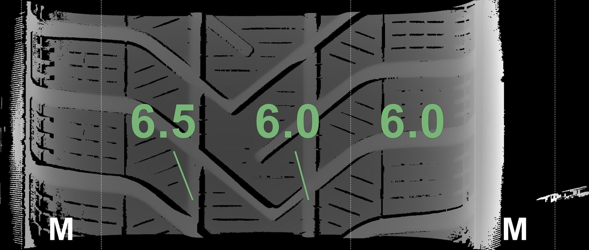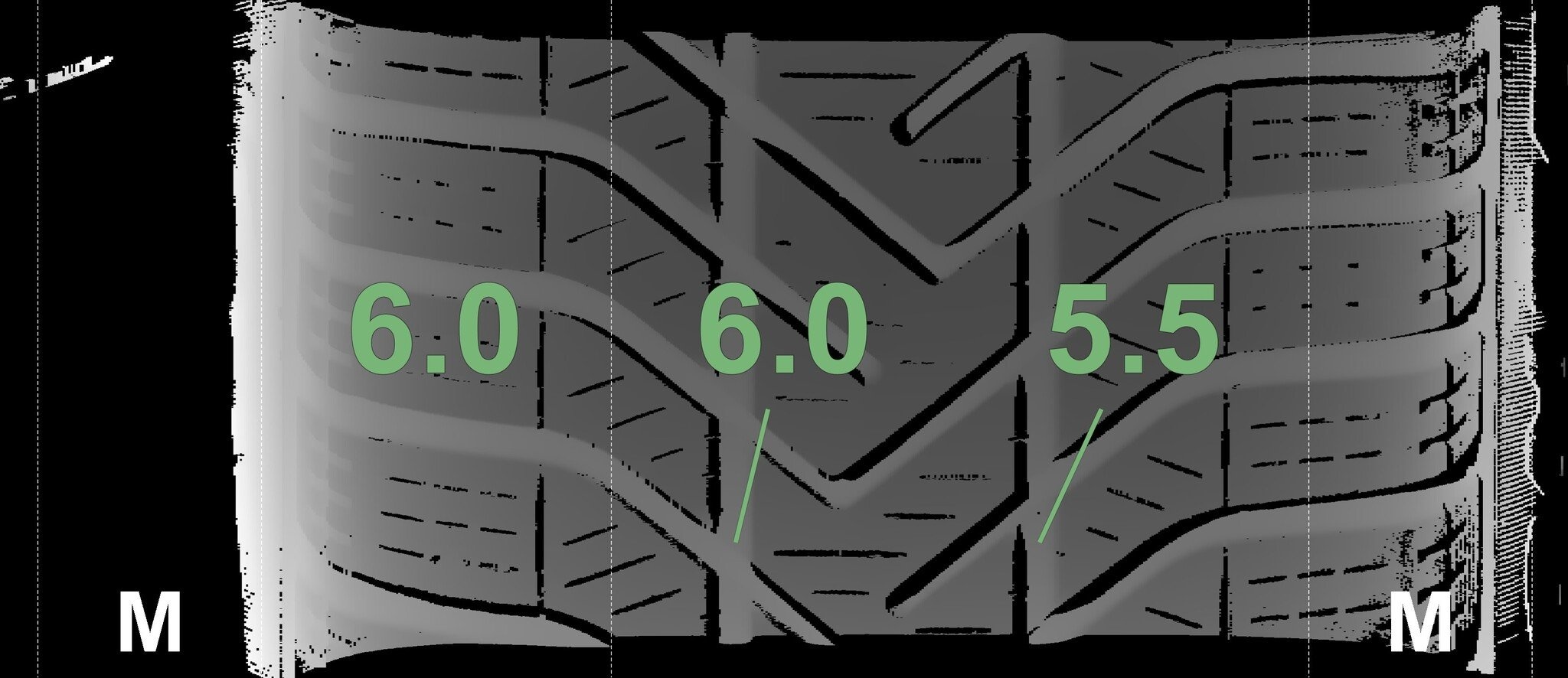 De gemeten profieldieptes en de details van de velgen zijn hierboven weergegeven.