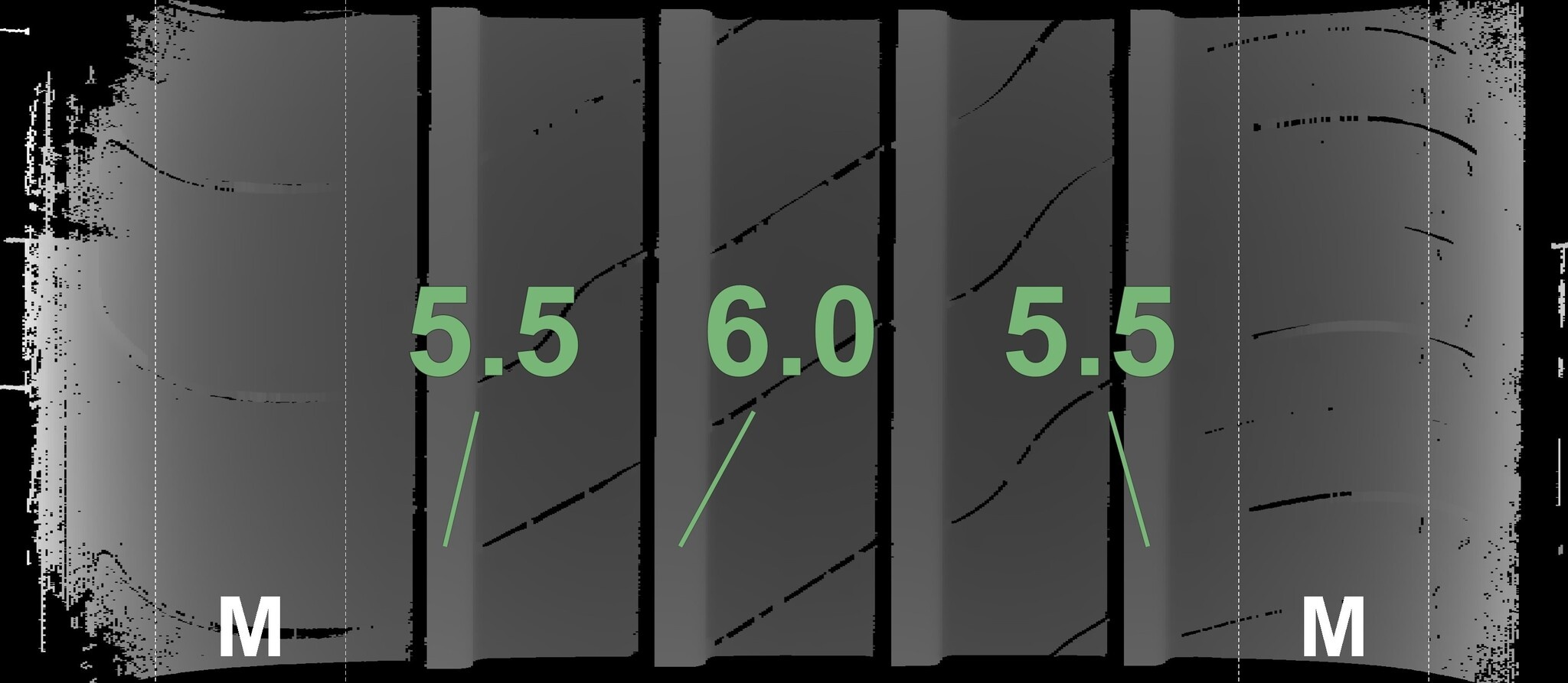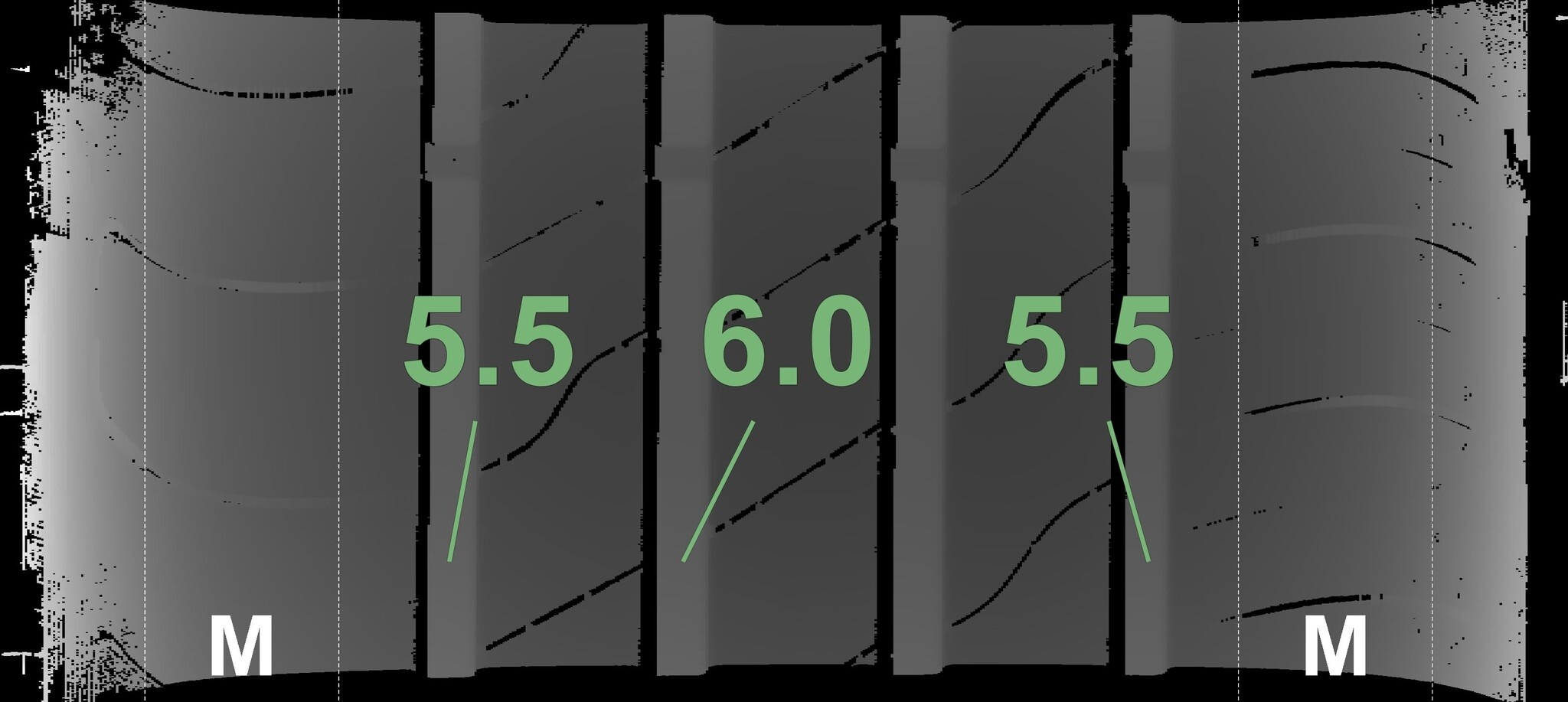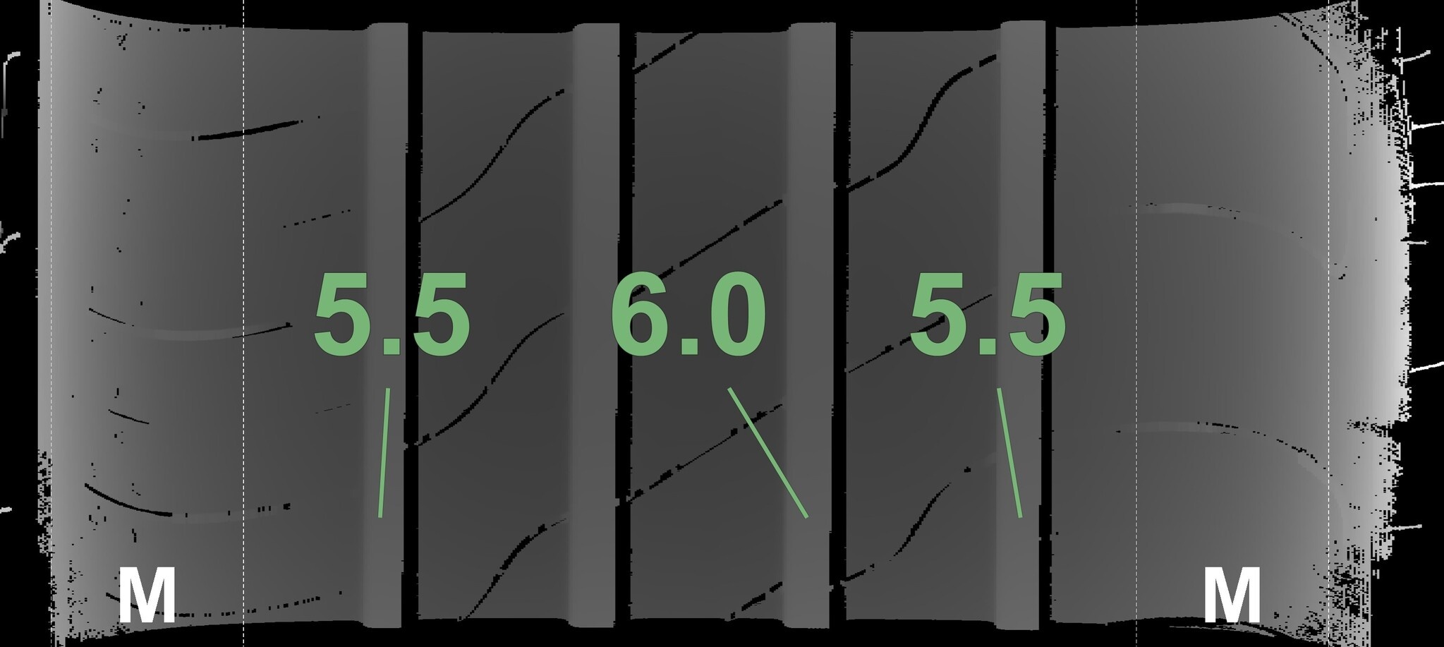 De gemeten profieldieptes en de details van de velgen zijn hierboven weergegeven.