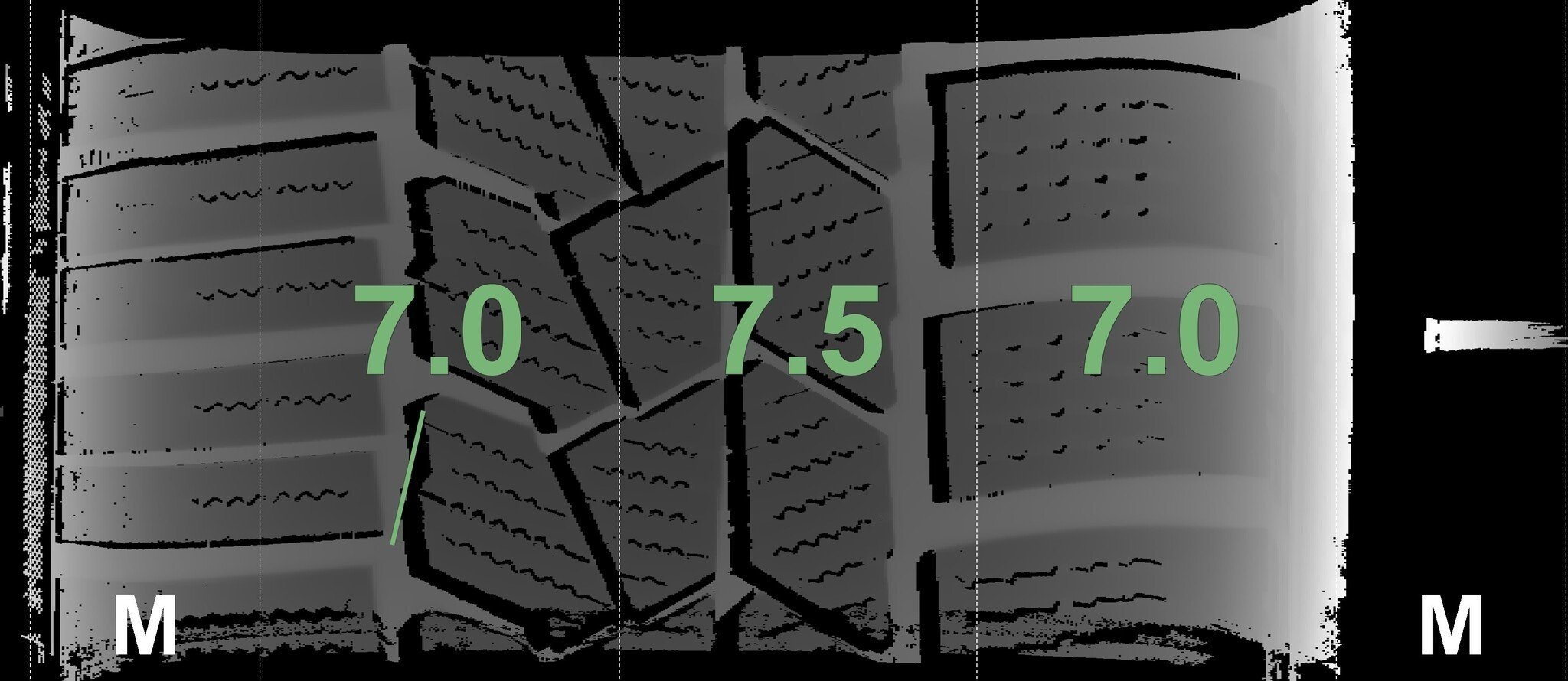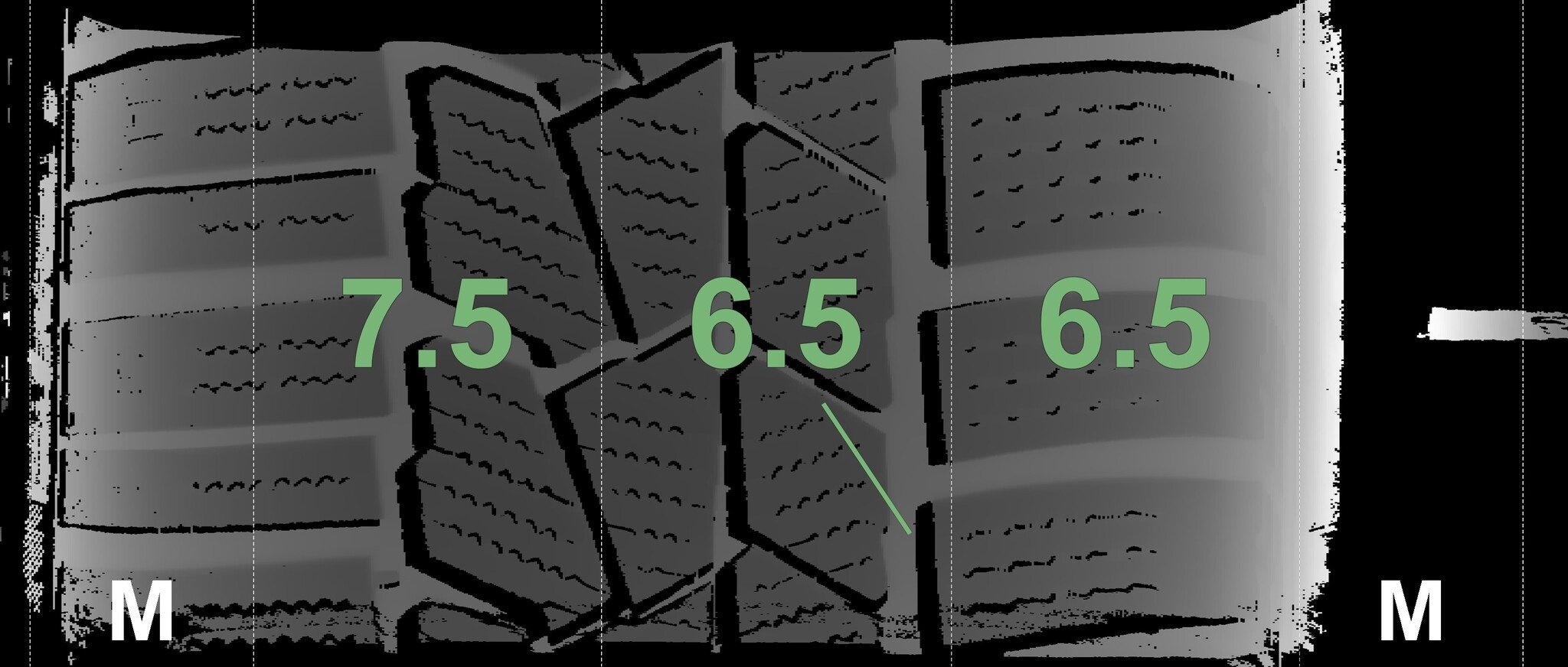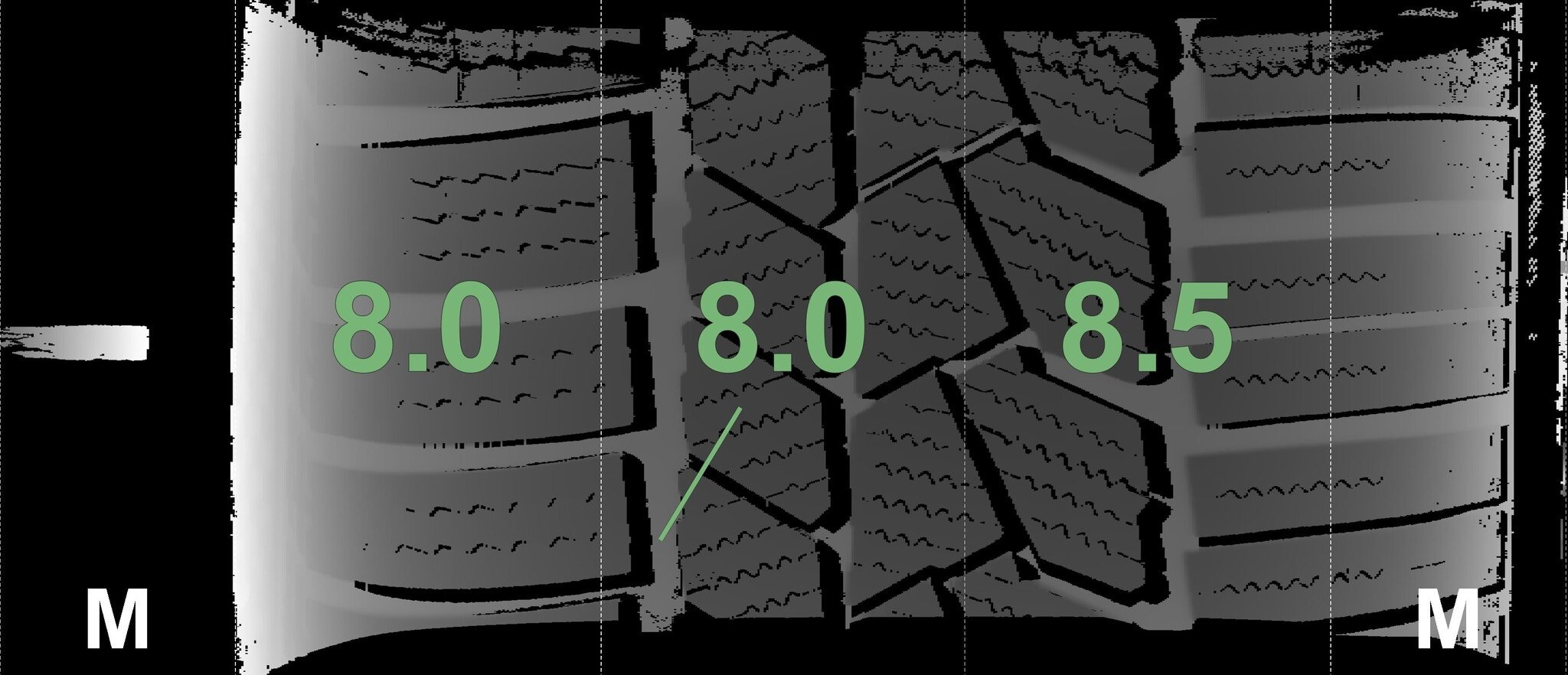 De gemeten profieldieptes en de details van de velgen zijn hierboven weergegeven.