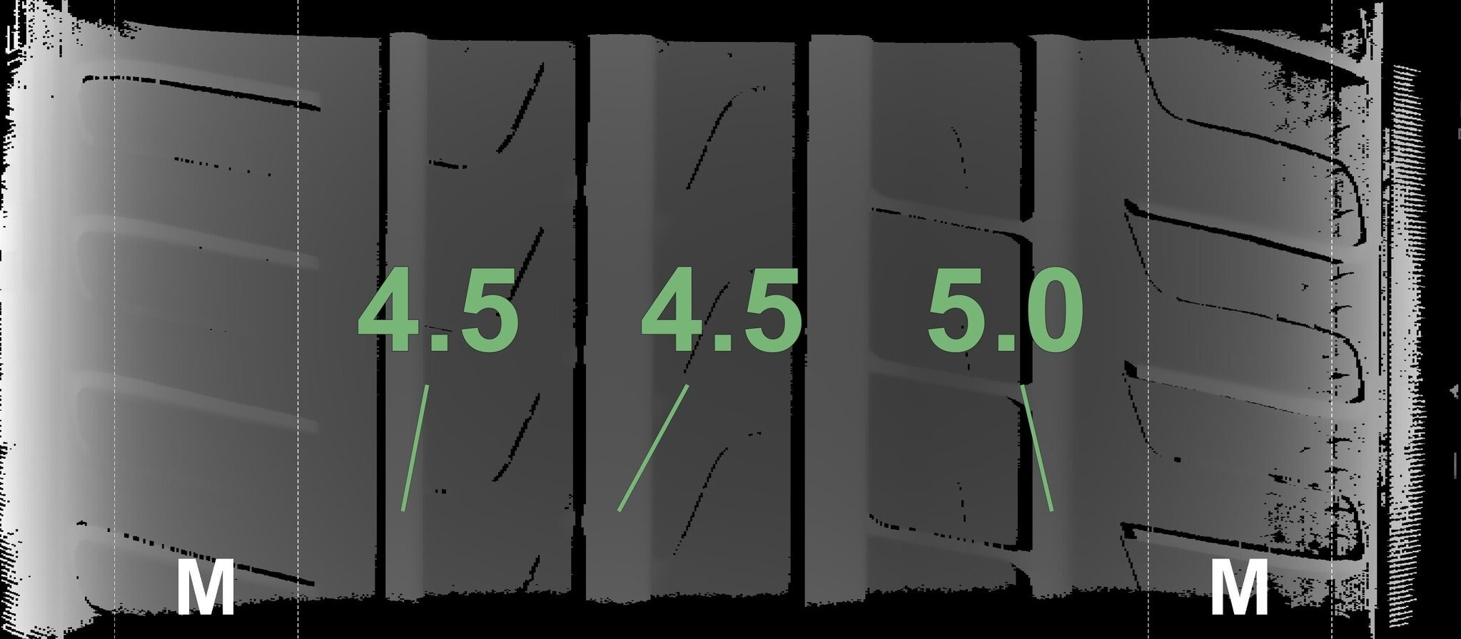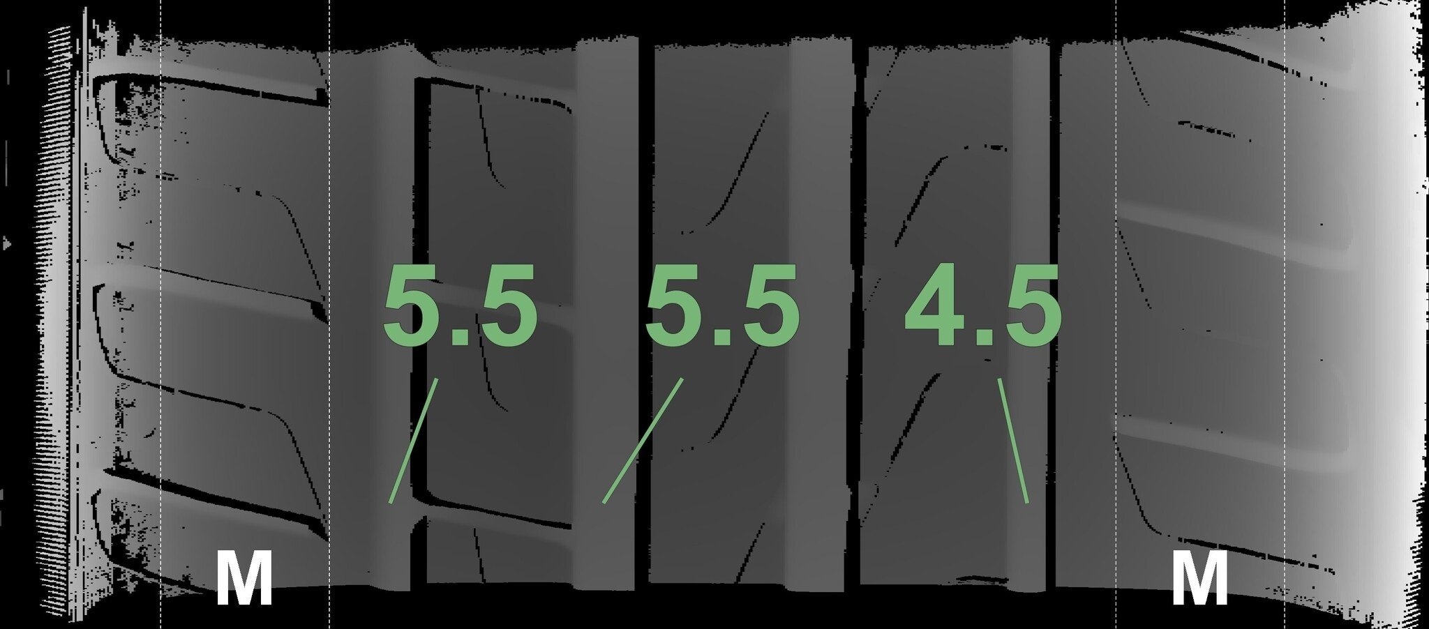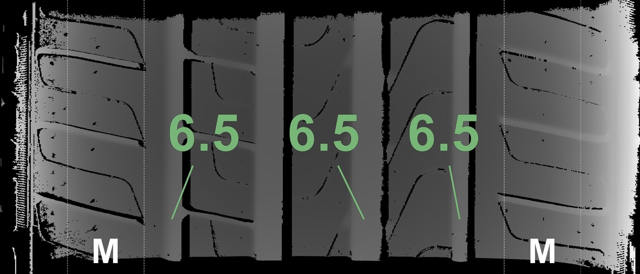 De gemeten profieldieptes en de details van de velgen zijn hierboven weergegeven.