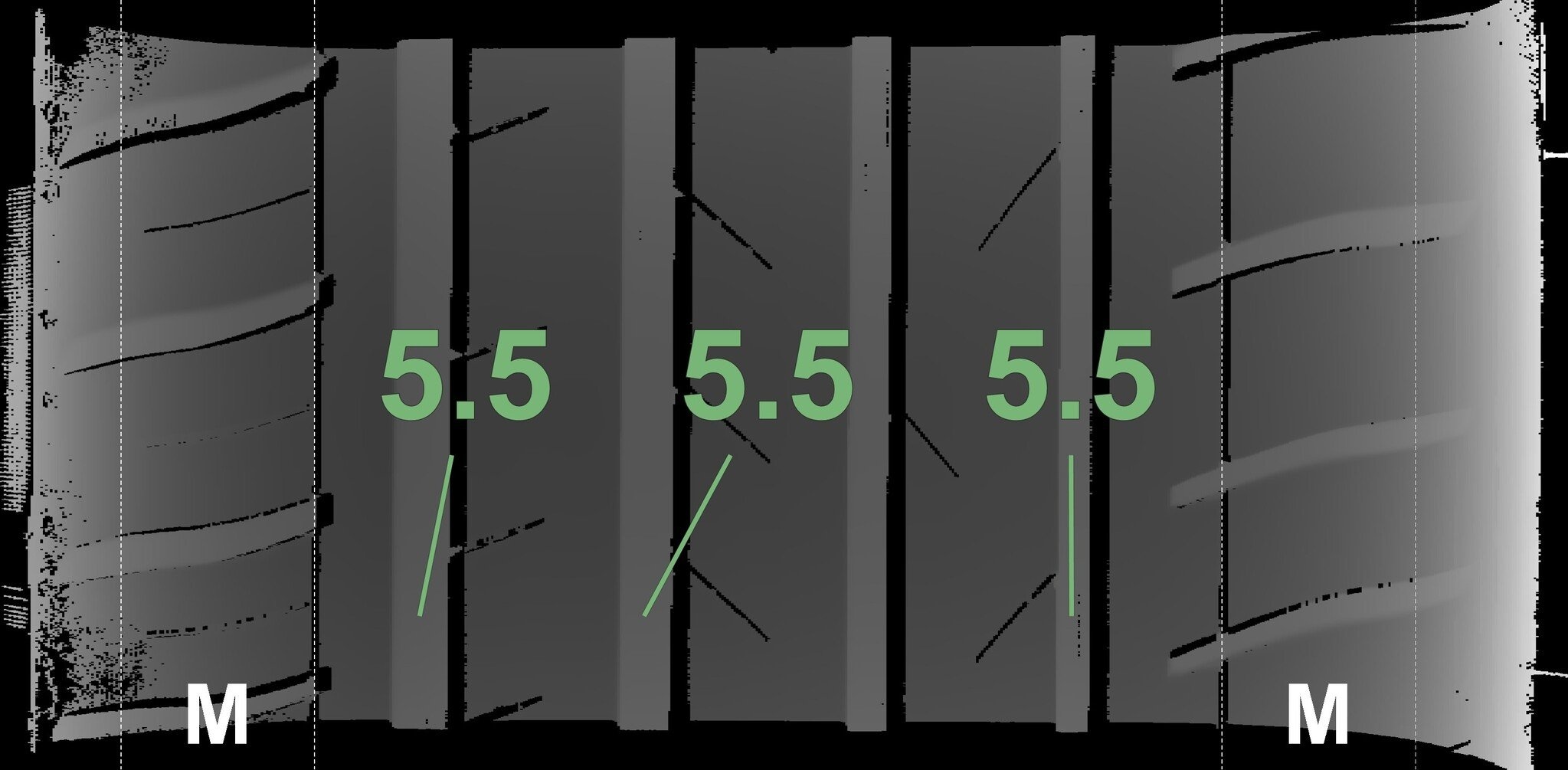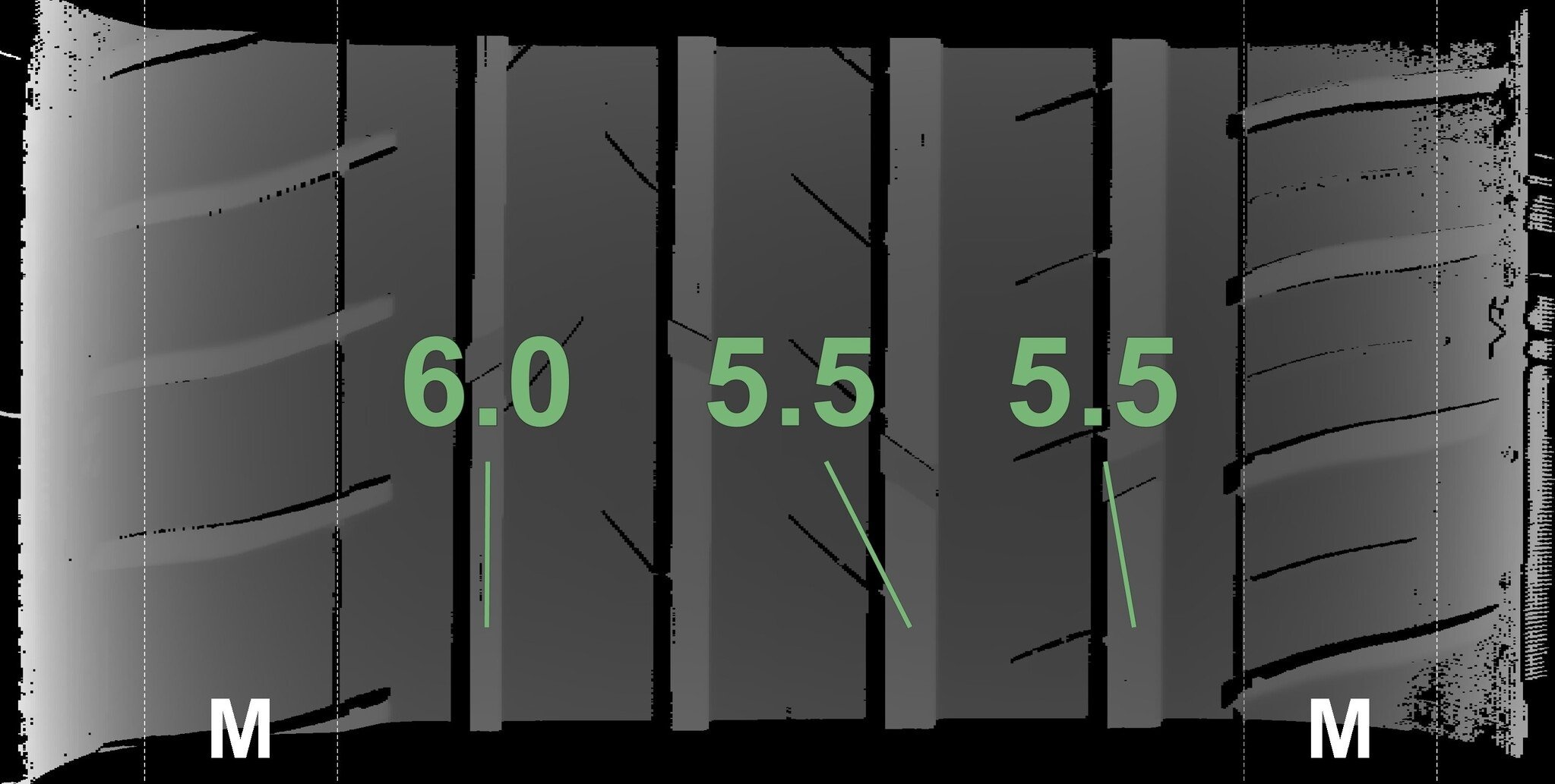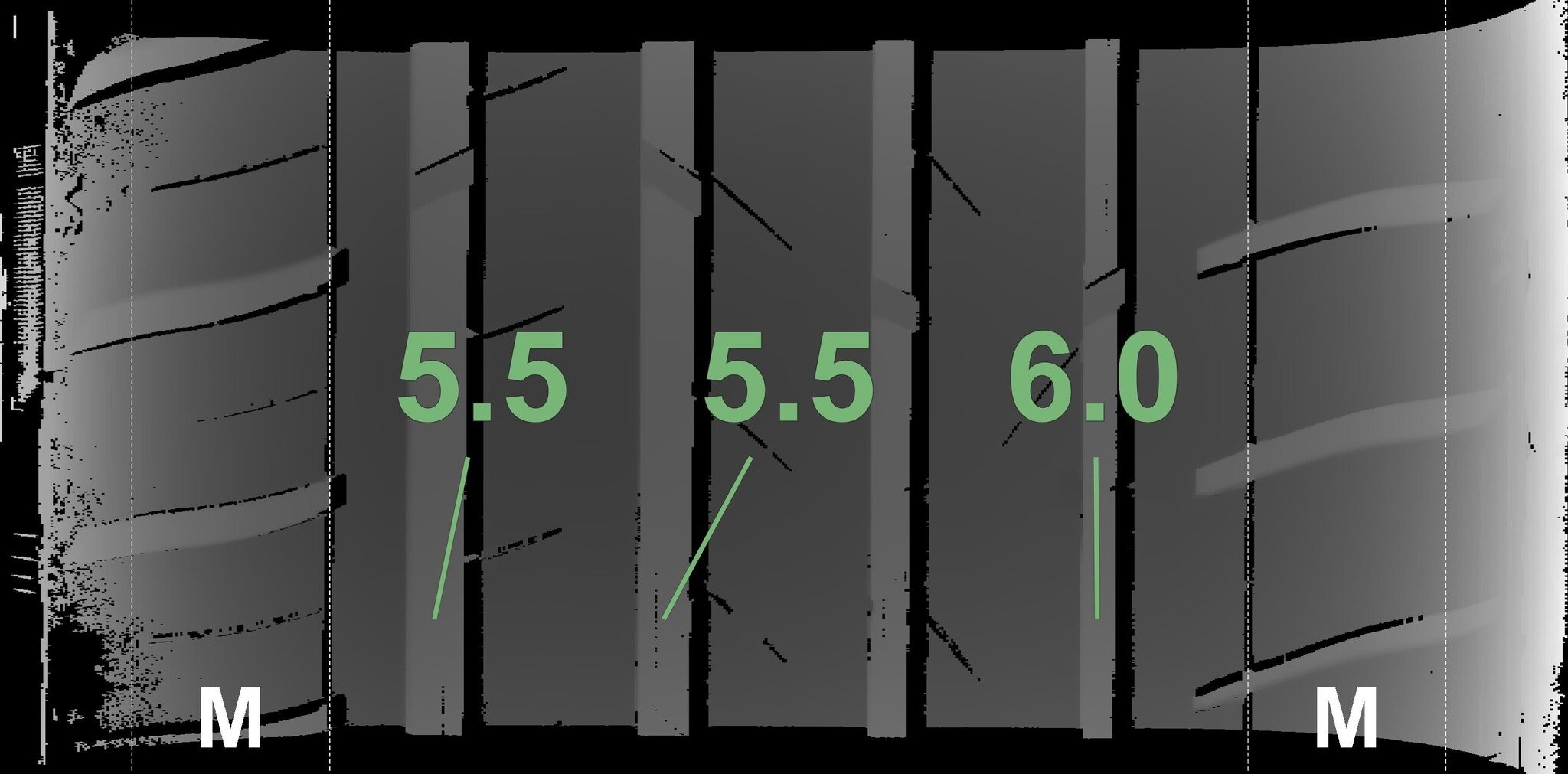 De gemeten profieldieptes en de details van de velgen zijn hierboven weergegeven.