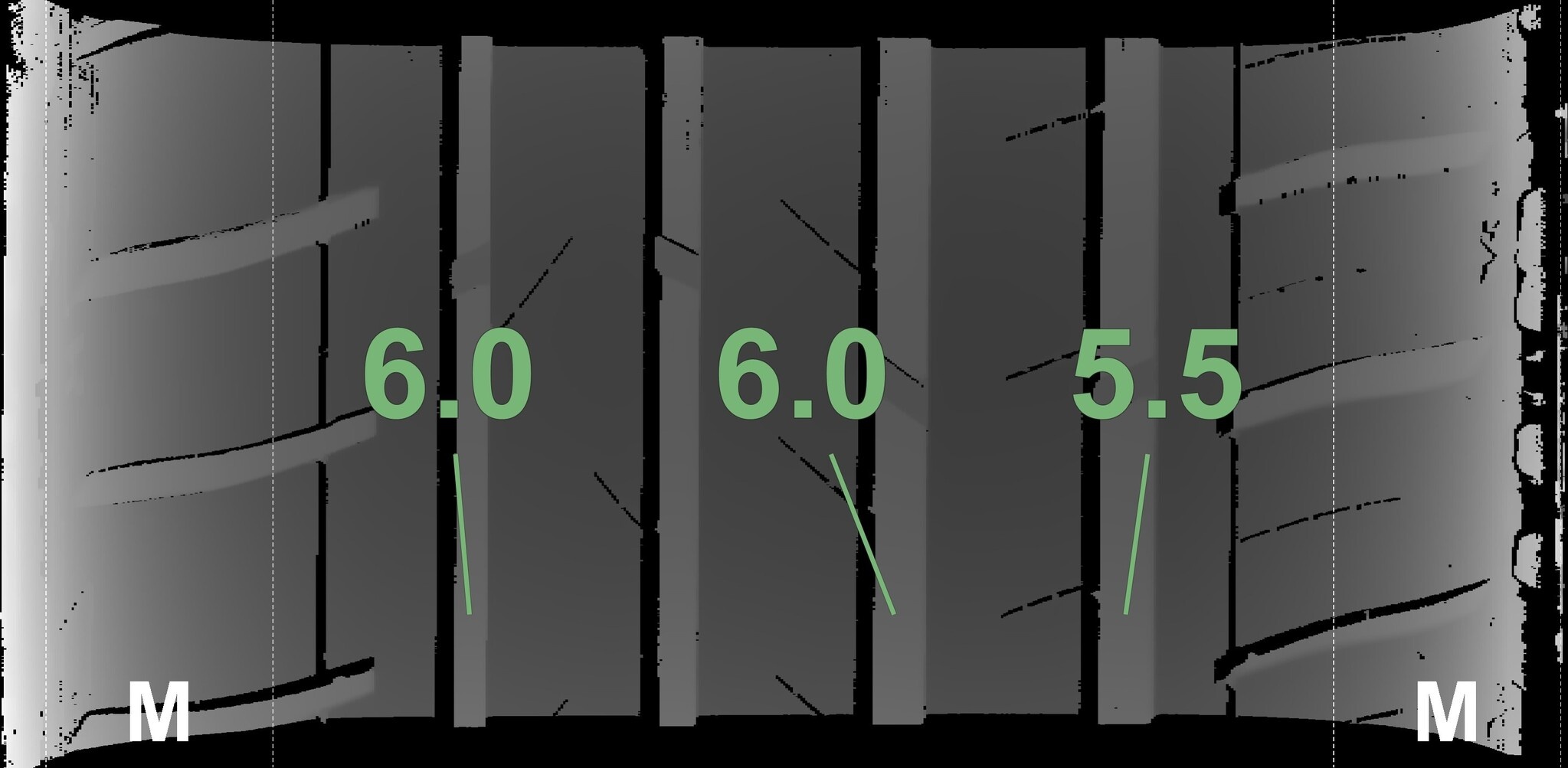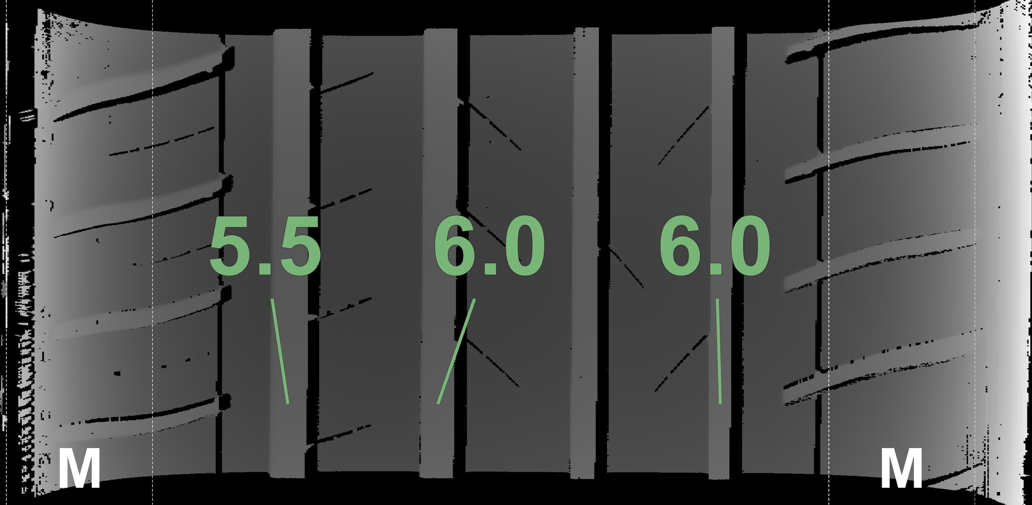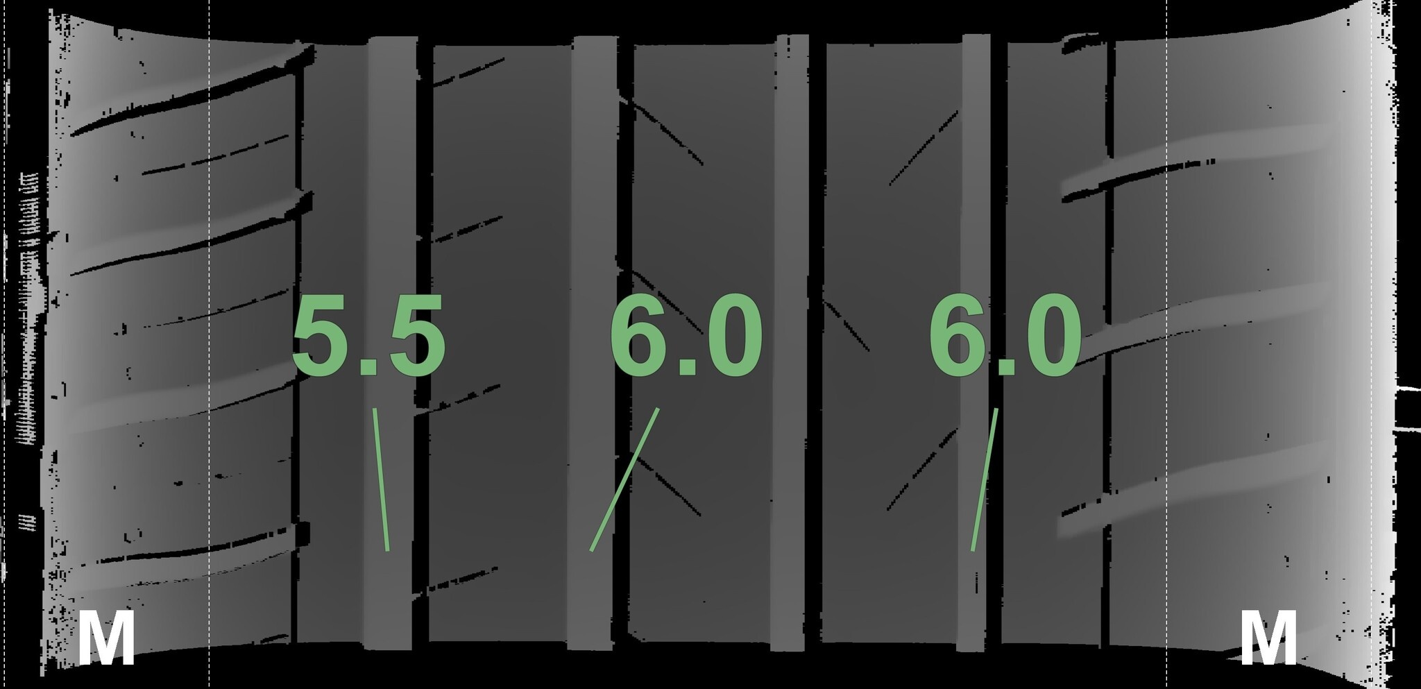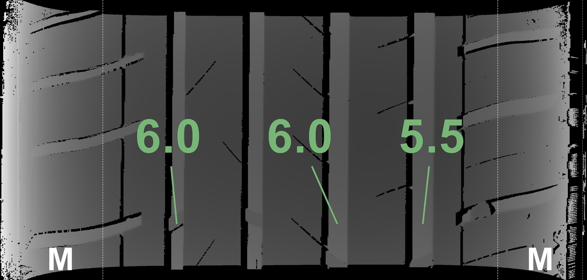 De gemeten profieldieptes en de details van de velgen zijn hierboven weergegeven.