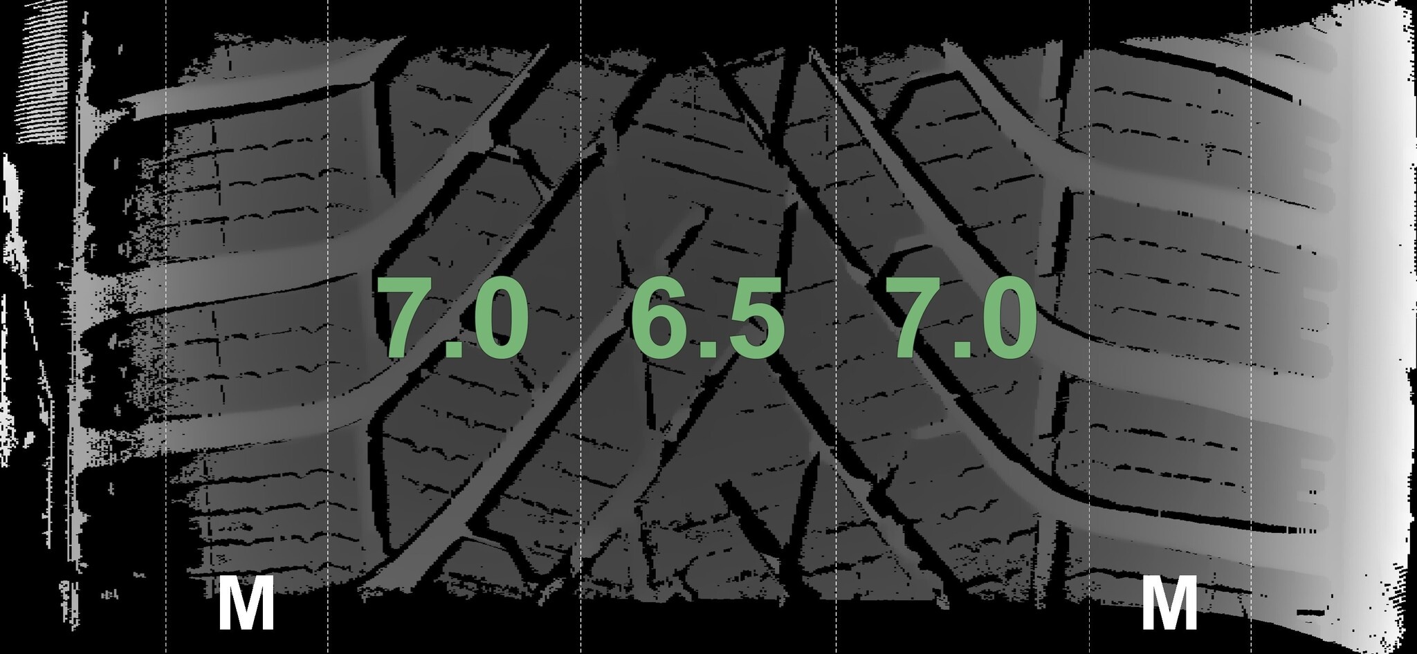 De gemeten profieldieptes en de details van de velgen zijn hierboven weergegeven.