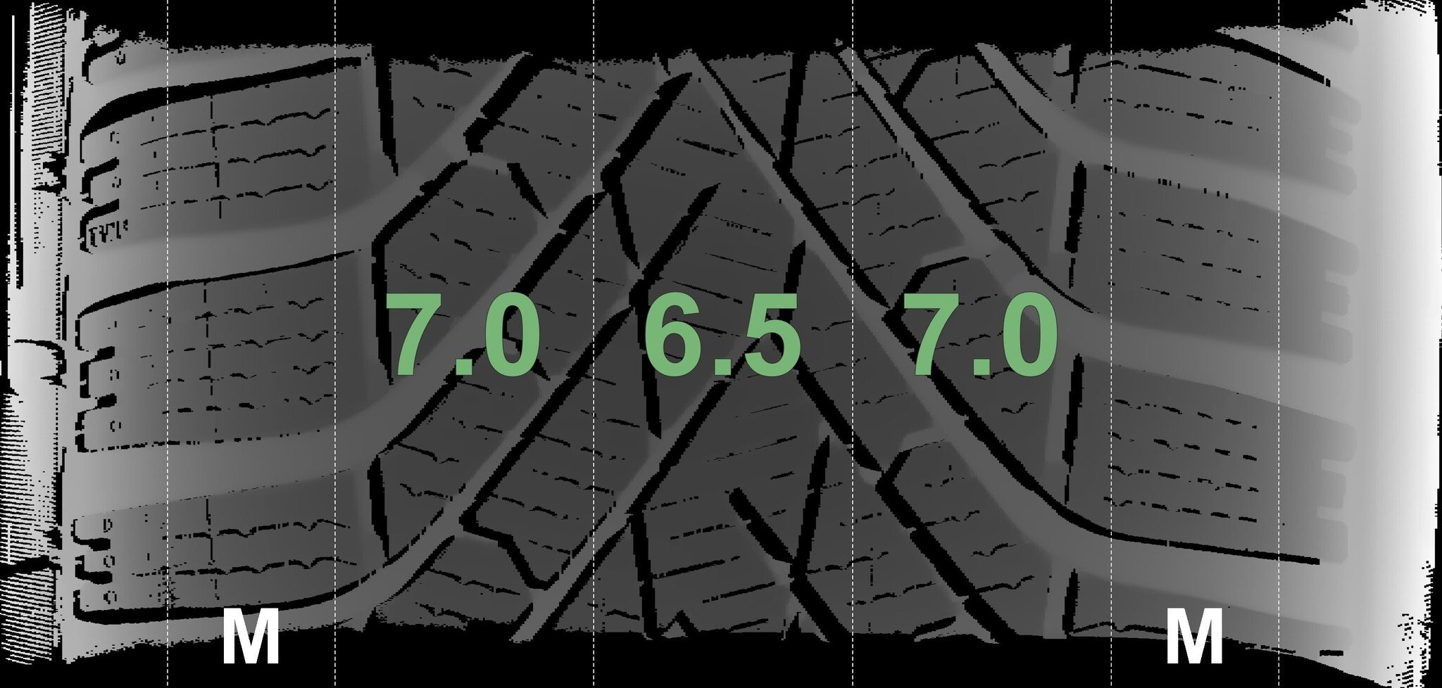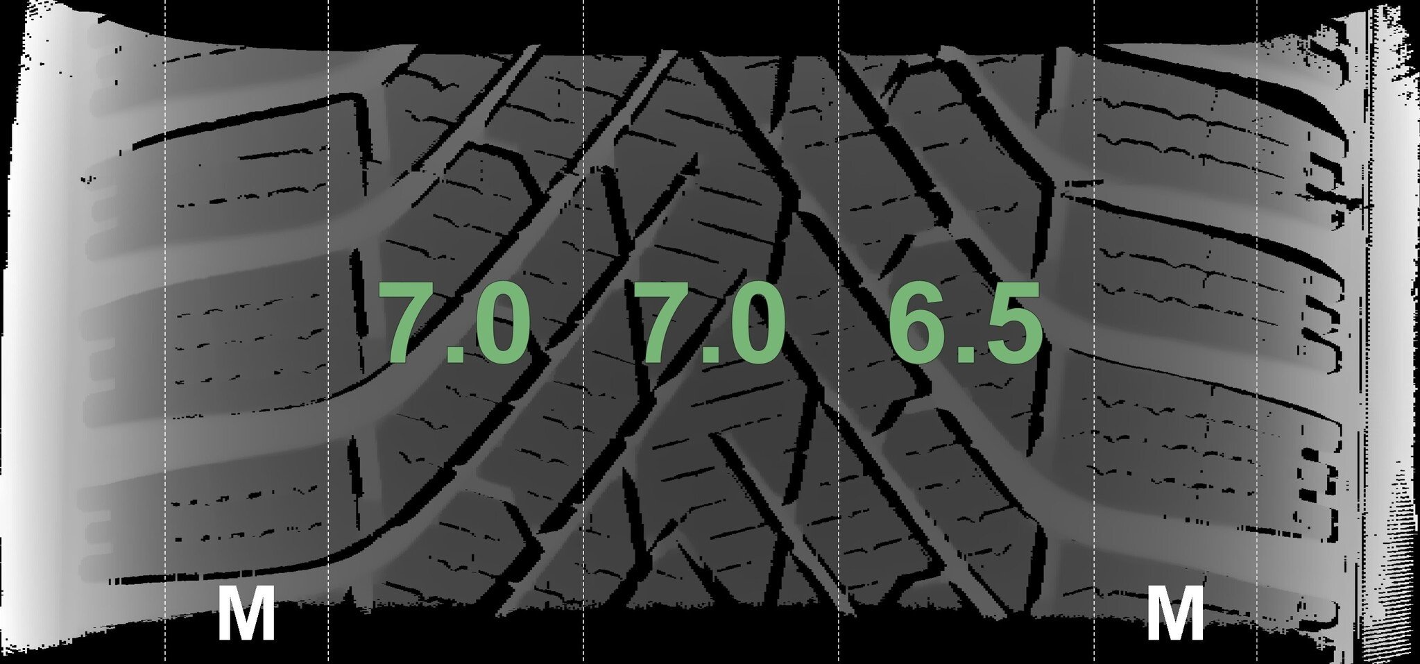 De gemeten profieldieptes en de details van de velgen zijn hierboven weergegeven.