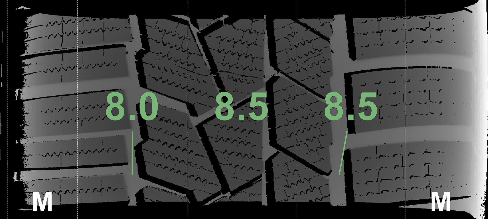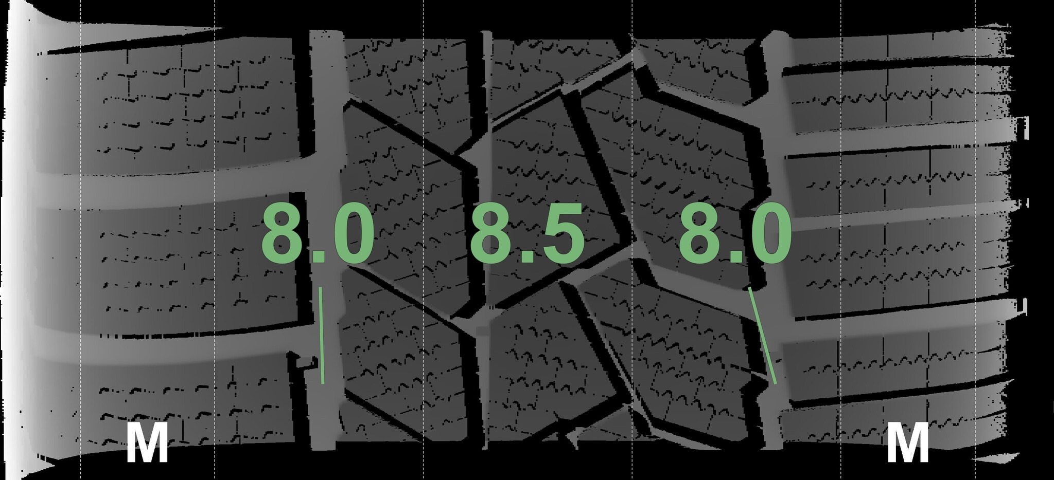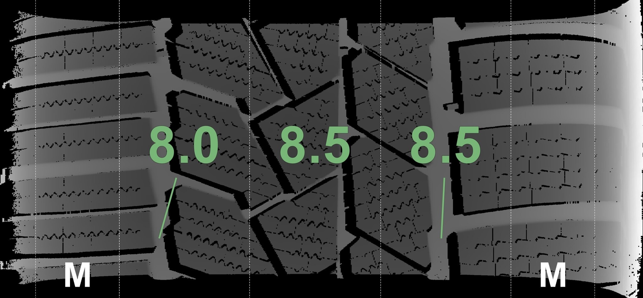 De gemeten profieldieptes en de details van de velgen zijn hierboven weergegeven.