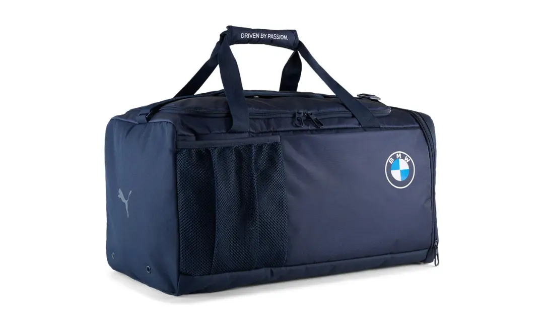 Originele PUMA | BMW sporttas met een tweewegrits en een U-vormige opening naar het hoofdvak.